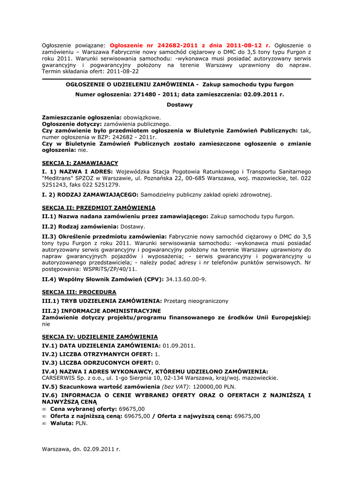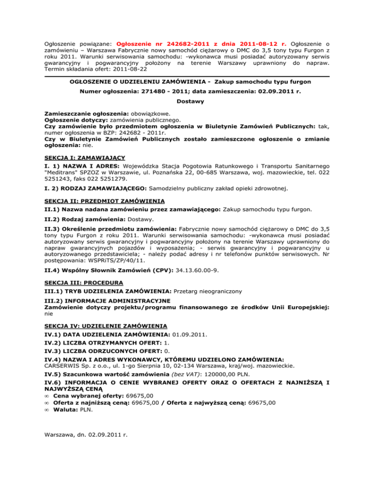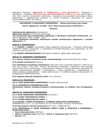 Ogłoszenie powiązane: Ogłoszenie nr 242682-2011 z dnia 2011-08-12 r. Ogłoszenie o zamówieniu – Warszawa Fabrycznie nowy samochód cięŜarowy o DMC do 3,5 tony typu Furgon z roku 2011. Warunki serwisowania samochodu: -wykonawca musi posiadać autoryzowany serwis gwarancyjny i pogwarancyjny połoŜony na terenie Warszawy uprawniony do napraw. Termin składania ofert: 2011-08-22 OGŁOSZENIE O UDZIELENIU ZAMÓWIENIA - Zakup samochodu typu furgon Numer ogłoszenia: 271480 - 2011; data zamieszczenia: 02.09.2011 r. Dostawy Zamieszczanie ogłoszenia: obowiązkowe. Ogłoszenie dotyczy: zamówienia publicznego. Czy zamówienie było przedmiotem ogłoszenia w Biuletynie Zamówień Publicznych: tak, numer ogłoszenia w BZP: 242682 - 2011r. Czy w Biuletynie Zamówień Publicznych zostało zamieszczone ogłoszenie o zmianie ogłoszenia: nie. SEKCJA I: ZAMAWIAJĄCY I. 1) NAZWA I ADRES: Wojewódzka Stacja Pogotowia Ratunkowego i Transportu Sanitarnego "Meditrans" SPZOZ w Warszawie, ul. Poznańska 22, 00-685 Warszawa, woj. mazowieckie, tel. 022 5251243, faks 022 5251279. I. 2) RODZAJ ZAMAWIAJĄCEGO: Samodzielny publiczny zakład opieki zdrowotnej. SEKCJA II: PRZEDMIOT ZAMÓWIENIA II.1) Nazwa nadana zamówieniu przez zamawiającego: Zakup samochodu typu furgon. II.2) Rodzaj zamówienia: Dostawy. II.3) Określenie przedmiotu zamówienia: Fabrycznie nowy samochód cięŜarowy o DMC do 3,5 tony typu Furgon z roku 2011. Warunki serwisowania samochodu: -wykonawca musi posiadać autoryzowany serwis gwarancyjny i pogwarancyjny połoŜony na terenie Warszawy uprawniony do napraw gwarancyjnych pojazdów i wyposaŜenia; - serwis gwarancyjny i pogwarancyjny u autoryzowanego przedstawiciela; - naleŜy podać adresy i nr telefonów punktów serwisowych. Nr postępowania: WSPRiTS/ZP/40/11. II.4) Wspólny Słownik Zamówień (CPV): 34.13.60.00-9. SEKCJA III: PROCEDURA III.1) TRYB UDZIELENIA ZAMÓWIENIA: Przetarg nieograniczony III.2) INFORMACJE ADMINISTRACYJNE Zamówienie dotyczy projektu/programu finansowanego ze środków Unii Europejskiej: nie SEKCJA IV: UDZIELENIE ZAMÓWIENIA IV.1) DATA UDZIELENIA ZAMÓWIENIA: 01.09.2011. IV.2) LICZBA OTRZYMANYCH OFERT: 1. IV.3) LICZBA ODRZUCONYCH OFERT: 0. IV.4) NAZWA I ADRES WYKONAWCY, KTÓREMU UDZIELONO ZAMÓWIENIA: CARSERWIS Sp. z o.o., ul. 1-go Sierpnia 10, 02-134 Warszawa, kraj/woj. mazowieckie. IV.5) Szacunkowa wartość zamówienia (bez VAT): 120000,00 PLN. IV.6) INFORMACJA O CENIE WYBRANEJ OFERTY ORAZ O OFERTACH Z NAJNIśSZĄ I NAJWYśSZĄ CENĄ • Cena wybranej oferty: 69675,00 • Oferta z najniŜszą ceną: 69675,00 / Oferta z najwyŜszą ceną: 69675,00 • Waluta: PLN. Warszawa, dn. 02.09.2011 r.
