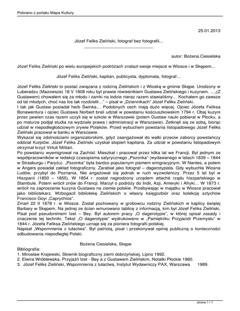 Pobrano z portalu Mapa Kultury 25.01.2013 Józef Feliks Zieliński, fotograf bez fotografii... ____________________________ autor: Bożena.Ciesielska Józef Feliks Zieliński po wielu europejskich podróżach znalazł swoje miejsce w Wiosce i w Skępem... Józef Feliks Zieliński, kapitan, publicysta, dyplomata, fotograf… Józef Feliks Zieliński to postać związana z rodziną Zielińskich i z Wioską w gminie Skępe. Urodzony w Luberadzu (Mazowsze) 18 V 1808 roku był prawie rówieśnikiem Gustawa Zielińskiego i kuzynem. …„(Z Gustawem) chowałem się za młodu i zamki na lodzie nieraz razem stawialiśmy… Kochałem go zawsze od lat młodych, choć nas los tak rozdzielił…” – pisał w „Dziennikach” Józef Feliks Zieliński. I tak jak Gustaw posiadał herb Świnka… Podobnych cech mają dużo więcej. Ojciec Józefa Feliksa Bonawentura i ojciec Gustawa Norbert brali udział w powstaniu kościuszkowskim 1794 r. Obaj kuzyni przez pewien czas razem uczyli się w szkole w Warszawie (potem Gustaw nauki pobierał w Płocku, a po maturze podjął studia na wydziale prawa i administracji w Warszawie). Zetknęli się ze sobą, biorąc udział w niepodległościowym zrywie Polaków. Przed wybuchem powstania listopadowego Józef Feliks Zieliński pracował w banku w Warszawie. Wykazał się zdolnościami organizatorskimi, gdyż zaangażował do walki przeciw zaborcy powstańczy oddział Kurpiów. Józef Feliks Zieliński uzyskał stopień kapitana. Za udział w powstaniu listopadowym otrzymał krzyż Virtuti Militari. Po powstaniu wyemigrował na Zachód. Mieszkał i pracował przez kilka lat we Francji. Był jednym ze współpracowników w redakcji czasopisma satyrycznego „Pszonka” (wydawanego w latach 1839 – 1844 w Strasburgu i Paryżu). „Pszonka” była bardzo popularnym pismem emigracyjnym. W Nantes, a potem w Angers posiadał zakład fotograficzny. Zarabiał jako fotograf – dagerotypista. Gdy wybuchła Wiosna Ludów, przybył do Poznania. Nie angażował się jednak w ruch wyzwoleńczy. Przez 5 lat był w Hiszpanii (1850 – 1855). W 1854 r. został nagrodzony urzędem attaché rządu hiszpańskiego w Stambule. Potem wrócił znów do Francji. Marzył o podróży do Indii, Azji, Ameryki i Afryki… W 1873 r. wrócił na zaproszenie kuzyna Gustawa na ziemie polskie. Przebywając w majątku w Wiosce pracował jako bibliotekarz. Wzbogacił bibliotekę Zielińskich o własny księgozbiór oraz kolekcję sztychów Francisco Goyi „Caprychios”. Zmarł 22 II 1878 r. w Wiosce. Został pochowany w grobowcu rodziny Zielińskich w kaplicy świętej Barbary w Skępem. Na jednej ze ścian wmurowano tablicę z informacją, kim był Józef Feliks Zieliński. Pisał pod pseudonimem Izet – Bey. Był autorem pracy „O dagerotypie”, w której opisał zasady i znaczenie tej techniki. Tekst „O dagerotypie” wydrukowano w „Pamiętniku Przyjaciół Przemysłu” w 1844 r. Józefa Feliksa Zielińskiego uznaje się za pioniera fotografii polskiej. Napisał „Wspomnienia z tułactwa”. Był patriotą, pisał i przekonywał opinię publiczną o konieczności odbudowania niepodległej Polski. Bożena Ciesielska, Skępe Bibliografia: 1. Mirosław Krajewski, Słownik biograficzny ziemi dobrzyńskiej, Lipno 1992. 2. Elwira Wróblewska, Przyjaźń Izet - Bey̩̹ʹa z Gustawem Zielińskim, Notatki Płockie 1960. 3. Józef Feliks Zieliński, Wspomnienia z tułactwa, Instytut Wydawniczy PAX, Warszawa 1989. strona 1 / 1