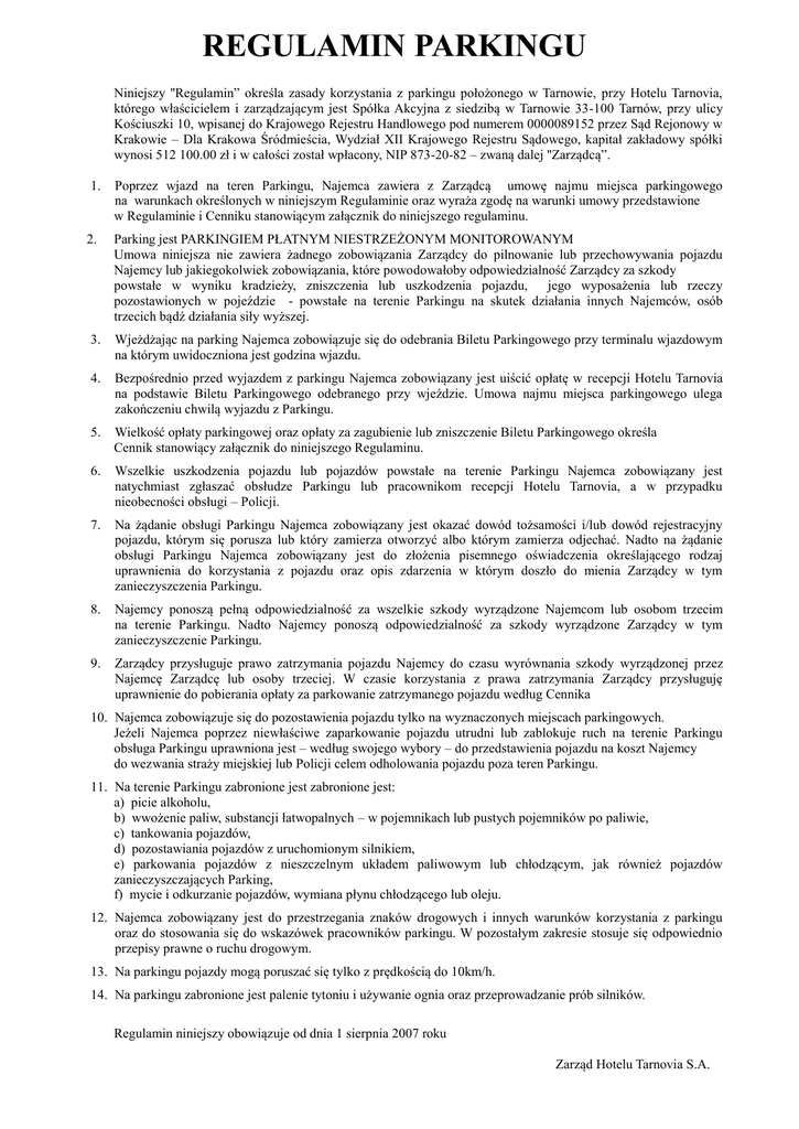 REGULAMIN PARKINGU Niniejszy ''Regulamin” określa zasady korzystania z parkingu położonego w Tarnowie, przy Hotelu Tarnovia, którego właścicielem i zarządzającym jest Spółka Akcyjna z siedzibą w Tarnowie 33-100 Tarnów, przy ulicy Kościuszki 10, wpisanej do Krajowego Rejestru Handlowego pod numerem 0000089152 przez Sąd Rejonowy w Krakowie – Dla Krakowa Śródmieścia, Wydział XII Krajowego Rejestru Sądowego, kapitał zakładowy spółki wynosi 512 100.00 zł i w całości został wpłacony, NIP 873-20-82 – zwaną dalej ''Zarządcą”. 1. Poprzez wjazd na teren Parkingu, Najemca zawiera z Zarządcą umowę najmu miejsca parkingowego na warunkach określonych w niniejszym Regulaminie oraz wyraża zgodę na warunki umowy przedstawione w Regulaminie i Cenniku stanowiącym załącznik do niniejszego regulaminu. 2. Parking jest PARKINGIEM PŁATNYM NIESTRZEŻONYM MONITOROWANYM Umowa niniejsza nie zawiera żadnego zobowiązania Zarządcy do pilnowanie lub przechowywania pojazdu Najemcy lub jakiegokolwiek zobowiązania, które powodowałoby odpowiedzialność Zarządcy za szkody powstałe w wyniku kradzieży, zniszczenia lub uszkodzenia pojazdu, jego wyposażenia lub rzeczy pozostawionych w pojeździe - powstałe na terenie Parkingu na skutek działania innych Najemców, osób trzecich bądź działania siły wyższej. 3. Wjeżdżając na parking Najemca zobowiązuje się do odebrania Biletu Parkingowego przy terminalu wjazdowym na którym uwidoczniona jest godzina wjazdu. 4. Bezpośrednio przed wyjazdem z parkingu Najemca zobowiązany jest uiścić opłatę w recepcji Hotelu Tarnovia na podstawie Biletu Parkingowego odebranego przy wjeździe. Umowa najmu miejsca parkingowego ulega zakończeniu chwilą wyjazdu z Parkingu. 5. Wielkość opłaty parkingowej oraz opłaty za zagubienie lub zniszczenie Biletu Parkingowego określa Cennik stanowiący załącznik do niniejszego Regulaminu. 6. Wszelkie uszkodzenia pojazdu lub pojazdów powstałe na terenie Parkingu Najemca zobowiązany jest natychmiast zgłaszać obsłudze Parkingu lub pracownikom recepcji Hotelu Tarnovia, a w przypadku nieobecności obsługi – Policji. 7. Na żądanie obsługi Parkingu Najemca zobowiązany jest okazać dowód tożsamości i/lub dowód rejestracyjny pojazdu, którym się porusza lub który zamierza otworzyć albo którym zamierza odjechać. Nadto na żądanie obsługi Parkingu Najemca zobowiązany jest do złożenia pisemnego oświadczenia określającego rodzaj uprawnienia do korzystania z pojazdu oraz opis zdarzenia w którym doszło do mienia Zarządcy w tym zanieczyszczenia Parkingu. 8. Najemcy ponoszą pełną odpowiedzialność za wszelkie szkody wyrządzone Najemcom lub osobom trzecim na terenie Parkingu. Nadto Najemcy ponoszą odpowiedzialność za szkody wyrządzone Zarządcy w tym zanieczyszczenie Parkingu. 9. Zarządcy przysługuje prawo zatrzymania pojazdu Najemcy do czasu wyrównania szkody wyrządzonej przez Najemcę Zarządcę lub osoby trzeciej. W czasie korzystania z prawa zatrzymania Zarządcy przysługuję uprawnienie do pobierania opłaty za parkowanie zatrzymanego pojazdu według Cennika 10. Najemca zobowiązuje się do pozostawienia pojazdu tylko na wyznaczonych miejscach parkingowych. Jeżeli Najemca poprzez niewłaściwe zaparkowanie pojazdu utrudni lub zablokuje ruch na terenie Parkingu obsługa Parkingu uprawniona jest – według swojego wybory – do przedstawienia pojazdu na koszt Najemcy do wezwania straży miejskiej lub Policji celem odholowania pojazdu poza teren Parkingu. 11. Na terenie Parkingu zabronione jest zabronione jest: a) picie alkoholu, b) wwożenie paliw, substancji łatwopalnych – w pojemnikach lub pustych pojemników po paliwie, c) tankowania pojazdów, d) pozostawiania pojazdów z uruchomionym silnikiem, e) parkowania pojazdów z nieszczelnym układem paliwowym lub chłodzącym, jak również pojazdów zanieczyszczających Parking, f) mycie i odkurzanie pojazdów, wymiana płynu chłodzącego lub oleju. 12. Najemca zobowiązany jest do przestrzegania znaków drogowych i innych warunków korzystania z parkingu oraz do stosowania się do wskazówek pracowników parkingu. W pozostałym zakresie stosuje się odpowiednio przepisy prawne o ruchu drogowym. 13. Na parkingu pojazdy mogą poruszać się tylko z prędkością do 10km/h. 14. Na parkingu zabronione jest palenie tytoniu i używanie ognia oraz przeprowadzanie prób silników. Regulamin niniejszy obowiązuje od dnia 1 sierpnia 2007 roku Zarząd Hotelu Tarnovia S.A.