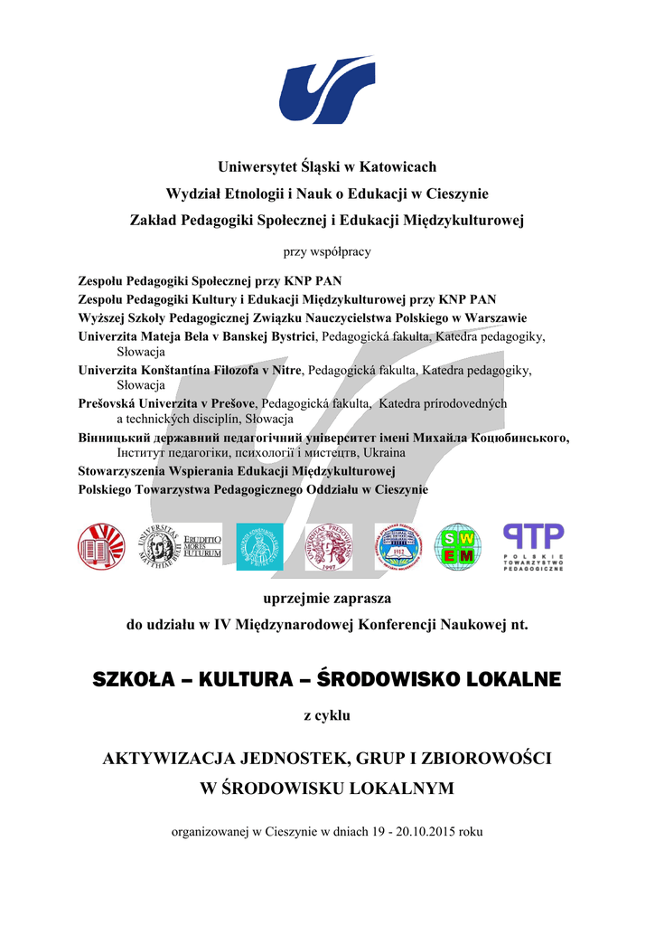 Uniwersytet Śląski w Katowicach Wydział Etnologii i Nauk o Edukacji w Cieszynie Zakład Pedagogiki Społecznej i Edukacji Międzykulturowej przy współpracy Zespołu Pedagogiki Społecznej przy KNP PAN Zespołu Pedagogiki Kultury i Edukacji Międzykulturowej przy KNP PAN Wyższej Szkoły Pedagogicznej Związku Nauczycielstwa Polskiego w Warszawie Univerzita Mateja Bela v Banskej Bystrici, Pedagogická fakulta, Katedra pedagogiky, Słowacja Univerzita Konštantína Filozofa v Nitre, Pedagogická fakulta, Katedra pedagogiky, Słowacja Prešovská Univerzita v Prešove, Pedagogická fakulta, Katedra prírodovedných a technických disciplín, Słowacja Вінницький державний педагогічний університет імені Михайла Коцюбинського, Інститут педагогіки, психології і мистецтв, Ukraina Stowarzyszenia Wspierania Edukacji Międzykulturowej Polskiego Towarzystwa Pedagogicznego Oddziału w Cieszynie uprzejmie zaprasza do udziału w IV Międzynarodowej Konferencji Naukowej nt. SZKOŁA – KULTURA – ŚRODOWISKO LOKALNE z cyklu AKTYWIZACJA JEDNOSTEK, GRUP I ZBIOROWOŚCI W ŚRODOWISKU LOKALNYM organizowanej w Cieszynie w dniach 19 - 20.10.2015 roku Konferencja Naukowa pod Honorowym Patronatem: Jego Magnificencji prof. zw. dr hab. Wiesława Banysia Rektora Uniwersytetu Śląskiego W Katowicach Komitetu Nauk Pedagogicznych Polskiej Akademii Nauk Dziekana Wydziału Etnologii i Nauk o Edukacji w Cieszynie Uniwersytetu Śląskiego w Katowicach prof. dr. hab. Zenona Gajdzicy Starosty Cieszyńskiego Janusza Króla Burmistrza Miasta Cieszyna Ryszarda Macury Współorganizatorzy: Zespół Obsługi Jednostek Oświatowych w Cieszynie Cieszyński Ośrodek Kultury „Dom Narodowy” Wydział Kultury i Turystyki Urzędu Miasta Cieszyn Zespół Pieśni i Tańca Ziemi Cieszyńskiej im. Janiny Marcinkowej Muzeum Śląska Cieszyńskiego Biblioteka Miejska w Cieszynie Wydział Edukacji Starostwa Powiatowego w Cieszynie Wydział Kultury, Sportu, Turystyki i Informacji Starostwa Powiatowego w Cieszynie Teatr im. Adama Mickiewicza w Cieszynie Zamek Cieszyn Publisher-Innowacje Ośrodek Doskonalenia Zawodowego Koło Naukowe Edukacji Międzykulturowej 2 KOMITET NAUKOWY Prof. zw. dr hab. Tadeusz Lewowicki – Wyższa Szkoła Pedagogiczna Związku Nauczycielstwa Polskiego w Warszawie; Członek KNP PAN, honorowy przewodniczący Stowarzyszenia Wspierania Edukacji Międzykulturowej Prof. zw. dr hab. Jerzy Nikitorowicz – Uniwersytet w Białymstoku; przewodniczący Zespołu Pedagogiki Kultury i Edukacji Międzykulturowej przy KNP PAN, sekretarz naukowy KNP PAN Prof. zw. dr hab. Tadeusz Pilch – Uniwersytet Warszawski; przewodniczący Zespołu Pedagogiki Społecznej przy KNP PAN Prof. zw. dr hab. Andrzej Radziewicz-Winnicki – Uniwersytet Zielonogórski; Członek Prezydium KNP PAN Prof. zw. dr hab. Bogusław Śliwerski – Akademia Pedagogiki Specjalnej im. Marii Grzegorzewskiej w Warszawie; Przewodniczący KNP PAN Prof. zw. dr hab. Wiesław Theiss - Wydział Pedagogiczny Uniwersytetu Warszawskiego, Członek KNP PAN Dr hab. Ewa Jarosz – Uniwersytet Śląski w Katowicach, zastępca przewodniczącego Zespołu Pedagogiki Społecznej przy KNP PAN Dr hab. Mirosław Sobecki prof. UwB - Uniwersytet w Białymstoku; zastępca przewodniczącego Zespołu Pedagogiki Społecznej przy KNP PAN Dr hab. Alina Szczurek-Boruta - Uniwersytet Śląski w Katowicach Prof. PaedDr. Alena Doušková, PhD - Univerzita Mateja Bela v Banskej Bystrici, Słowacja Prof. PhDr. Bronislava Kasáčová, CSc. – Univerzita Mateja Bela v Banskej Bystrici, Słowacja Prof. PhDr. Ingrid Emmerová, PhD. - Univerzita Mateja Bela v Banskej Bystrici, Słowacja Doc. PaedDr. Alica Petrasová, PhD. - Prešovská Univerzita v Prešove, Słowacja Doc. PaedDr. Jelena Petrucijowa, PhD. - Ostravská Univerzita v Ostravé, Czechy Doc. PaedDr. Radmila Burkovičová, Ph.D. - Ostravská Univerzita v Ostravé, Czechy Doc. PaedDr. Ctibor Határ, PhD. - Univerzita Konštantína Filozofa v Nitre, Słowacja Prof. PhDr. Gabriela Petrová, CSc. - Univerzita Konštantína Filozofa v Nitre, Słowacja Prof. zw. dr hab. Petro Husak - Східноєвропейський національний університет імені Лесі Українки, Ukraina Prof. zw. dr hab. Vołodymyr Shahow - Вінницький державний педагогічний університет імені Михайла Коцюбинського, Інститут педагогіки, психології і мистецтв, Ukraina Prof. Lubow Pietuchowa PhD - Херсонський державний університет, Ukraina Prof. Sonja Petrovska, PhD - Универзитетот „Гоце Делчев“- Штип, Macedonia Prof. Despina Sivevska, PhD - Универзитетот „Гоце Делчев“- Штип, Macedonia 3 Program Międzynarodowej Konferencji Naukowej SZKOŁA – KULTURA – ŚRODOWISKO LOKALNE Cieszyn, 19-20 października 2015 roku 19.10.2015 r. 815 - 900 Rejestracja uczestników konferencji – Wydział Etnologii Nauk o Edukacji Uniwersytetu Śląskiego w Katowicach, Cieszyn, ul. Bielska 62 900 Otwarcie konferencji i wystąpienia zaproszonych gości Sala Konferencyjna Wydziału Etnologii i Nauk o Edukacji prof. zw. dr hab. Bogusław Śliwerski - Przewodniczący Komitetu Nauk Pedagogicznych Polskiej Akademii Nauk prof. dr hab. Zenon Gajdzica w Cieszynie - Dziekan Wydziału Etnologii i Nauk o Edukacji dr hab. Urszula Szuścik - Dyrektor Instytutu Nauk o Edukacji Wydziału Etnologii i Nauk o Edukacji w Cieszynie Janusz Król - Starosta Cieszyński Ryszard Macura – Burmistrz Miasta Cieszyna 930 - 1100 Obrady plenarne Przewodniczący: prof. zw. dr hab. Katarzyna Olbrycht (Uniwersytet Śląski) prof. zw. dr hab. Jerzy Nikitorowicz (Uniwersytet w Białymstoku) prof. zw. dr hab. Jacek Piekarski (Uniwersytet Łódzki) prof. zw. dr hab. Bogusław Śliwerski - Politycz