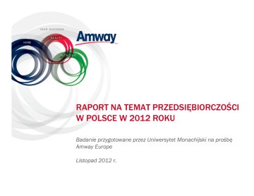 RAPORT NA TEMAT PRZEDSIĘBIORCZOŚCI W POLSCE W 2012 ROKU Badanie przygotowane przez Uniwersytet Monachijski na prośbę Amway Europe Listopad 2012 r. Przedsiębiorczość: nastawienie do samozatrudnienia w Polsce i Europie Średnia Dania Francja Wielka Brytania Włochy Polska Rosja Grecja Ukraina Szwajcaria Portugalia Hiszpania Rumunia Austria Turcja Niemcy Węgry pozytywne negatywne brak opinii Nastawienie do samozatrudnienia Trzech na czterech (73%) ankietowanych wykazuje pozytywną postawę w stosunku do samozatrudnienia. Stanowi to 4% więcej niż średnia europejska w 16 państwach (69%). Pozytywne 5% Negatywne 22% Trudno powiedzieć 73% Nastawienie do samozatrudnienia a młodzi przedsiębiorcy 84% ankietowanych wykazuje pozytywną postawę w stosunku do samozatrudnienia. 3% Pozytywne 13% Negatywne Trudno powiedzieć 84% Dlaczego decydujemy się na rozpoczęcie samodzielnej działalności biznesowej? 58% polskich respondentów zgadza się, że najważniejszym aspektem pracy na własny rachunek jest „niezależność od pracodawcy”. W porównaniu z 2011 roku (47%) nastąpił wzrost o 11%. Aspekt ten jest szczególnie atrakcyjny dla ludzi młodych: twierdzi tak 64% polskich respondentów poniżej 30. roku życia. 58% 44% 38% 28% 24% Niezależność od pracowdawcy, bycie własnym szefem Perspektywa drugiego dochodu Samospełnienie, możliwość realizacji własnych pomysłów Możliwość lepszego pogodzenia życia rodzinnego, czasu wolnego i kariery Powrót na rynek pracy, alternatywa dla bezrobocia Dlaczego młodzi ludzie decydują się na rozpoczęcie samodzielnej działalności biznesowej? Niespełna 2/3 polskich respondentów (64%) zgadza się, że najważniejszym aspektem pracy na własny rachunek jest „niezależność od pracodawcy”. Prawie połowa ankietowanych (47%) uznała, że znaczącym argumentem jest również realizacja własnych pomysłów. 64% 47% 40% 38% 22% Niezależność od pracodawcy i bycie własnym szefem Samospełnienie i możliwość realizacji własnych pomysłów Dodatkowy dochód Lepsza możliwość pogodzenia kariery zawodowej z czasem dla rodziny lub z wolnym czasem Możliwość powrotu na rynek pracy i alternatywa dla bezrobocia Główne bariery Brak kapitału początkowego” (58%), „niepewna sytuacja ekonomiczna” (45%) oraz „strach przed porażką” (45%) to największe przeszkody stojące na drodze do samozatrudnienia w opinii respondentów z Polski. 58% 45% Niepewna sytuacja ekonomiczna 45% Strach przed porażką 44% 34% Brak kapitału początkowego Trudności i bariery administracyjne Brak pomysłu na biznes 27% Brak funduszy publicznych/wsparcia publicznego 27% Brak wiedzy ekonomicznej 22% Brak doradztwa, np. ze strony instytucji publicznych Główne bariery dla młodych przedsiębiorców Aż 67% młodych przedsiębiorców wskazało „brak kapitału początkowego” jako główną barierę samozatrudnienia. Pozostałe wyniki są zbliżone do ogólnych wyników badania 67% 45% 42% 41% 30% 27% 18% Brak kapitału początkowego Niepewna sytuacja gospodarcza Obawa przed porażką Duże trudności administracyjne Brak pomysłu na biznes Brak odpowiednich funduszy publicznych i wsparcia Brak doradztwa np. ze strony instytucji publicznych Znaczenie przedsiębiorczości w nowoczesnym świecie pracy w perspektywie 10 lat 72% respondentów z Polski szacuje, że przedsiębiorczość będzie równie ważna lub ważniejsza na nowoczesnym rynku pracy za dziesięć lat (średnia europejska: 78%). 18% osób uważa, że przedsiębiorczość straci na znaczeniu (średnia europejska: 11%). Za dziesięć lat przedsiębiorczość będzie… 11% … Ważniejsza niż dzisiaj … Równie ważna jak dzisiaj 35% 17% … Mniej ważna niż dzisiaj Nie wiem/brak odpowiedzi 37% Przedsiębiorca a pracownik Jeżeli chodzi o profil przedsiębiorców, Europejczycy są zgodni co do faktu, iż przedsiębiorcy „są bardziej autonomiczni w podejmowaniu decyzji odnośnie miejsca pracy” (45%); „mogą zarządzać czasem w bardziej elastyczny sposób” (41%) oraz „mają odwagę, aby przecierać nowe szlaki” (40%). Przedsiębiorcy… 45% 41% 40% 28% 25% 19% … są autonomiczni, jeżeli chodzi o decyzję o miejscu pracy … w sposób bardziej elastyczny mogą zarządzać swoim czasem … mają odwagę, aby wyznaczać nowe ścieżki 37% … lepiej radzą sobie z finansami 37% … są lepsi w organizacji … lepiej radzą sobie z networkingiem i nawiązywaniu kontaktów z ludźmi … posiadają lepsze umiejętności profesjonalne … przywiązują większą wagę do wykształcenia i zaawansowanych szkoleń Dziękujemy za uwagę!