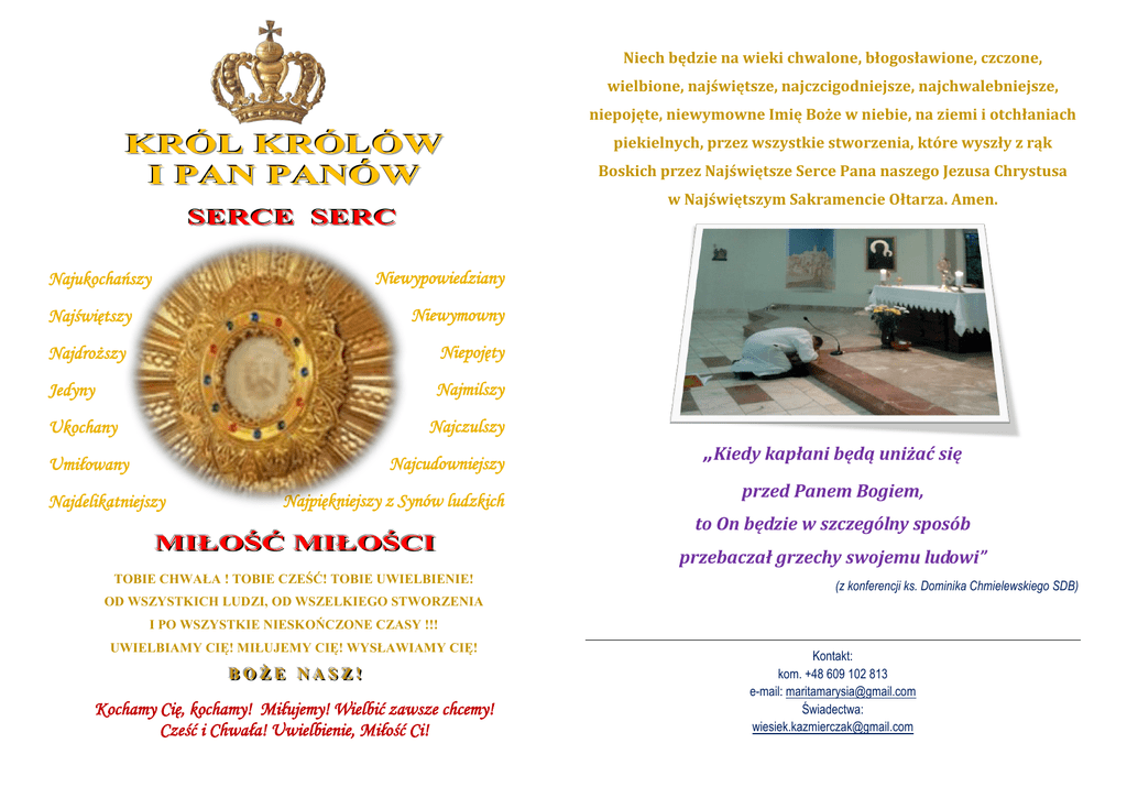 Niech będzie na wieki chwalone, błogosławione, czczone, wielbione, najświętsze, najczcigodniejsze, najchwalebniejsze, niepojęte, niewymowne Imię Boże w niebie, na ziemi i otchłaniach KRÓL KRÓLÓW I PAN PANÓW piekielnych, przez wszystkie stworzenia, które wyszły z rąk Boskich przez Najświętsze Serce Pana naszego Jezusa Chrystusa w Najświętszym Sakramencie Ołtarza. Amen. S SE ER RC CE E S SE ER RC C Niewypowiedziany Najukochańszy Niewymowny Najświętszy Najdroższy Niepojęty Jedyny Najmilszy Najczulszy Ukochany Najcudowniejszy Umiłowany Najdelikatniejszy Najpiękniejszy z Synów ludzkich M MIIŁ ŁO OŚ ŚĆ ĆM MIIŁ ŁO OŚ ŚC CII TOBIE CHWAŁA ! TOBIE CZEŚĆ! TOBIE UWIELBIENIE! „Kiedy kapłani będą uniżać się przed Panem Bogiem, to On będzie w szczególny sposób przebaczał grzechy swojemu ludowi” (z konferencji ks. Dominika Chmielewskiego SDB) OD WSZYSTKICH LUDZI, OD WSZELKIEGO STWORZENIA I PO WSZYSTKIE NIESKOŃCZONE CZASY !!! UWIELBIAMY CIĘ! MIŁUJEMY CIĘ! WYSŁAWIAMY CIĘ! B BO OŻ ŻE E N NA A SS Z Z !! Kochamy Cię, kochamy! Miłujemy! Wielbić zawsze chcemy! Cześć i Chwała! Uwielbienie, Miłość Ci! Kontakt: kom. +48 609 102 813 e-mail: [email protected] Świadectwa: [email protected]