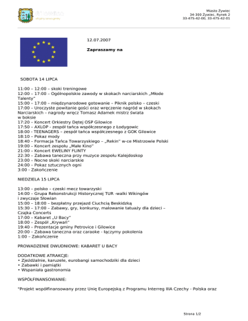 Miasto Żywiec 34-300 Żywiec, Rynek 2 33-475-42-00, 33-475-42-01 12.07.2007 Zapraszamy na SOBOTA 14 LIPCA 11:00 – 12:00 – skoki treningowe 12:00 – 17:00 – Ogólnopolskie zawody w skokach narciarskich „Młode Talenty” 15:00 – 17:00 – międzynarodowe gotowanie – Piknik polsko – czeski 17:00 – Uroczyste powitanie gości oraz wręczenie nagród w skokach Narciarskich – nagrody wręcz Tomasz Adamek mistrz świata w boksie 17:20 – Koncert Orkiestry Dętej OSP Gilowice 17:50 – AXLOP - zespół tańca współczesnego z Łodygowic 18:00 - TEENAGERS – zespół tańca współczesnego z GOK Gilowice 18:10 – Pokaz mody 18:40 – Formacja Tańca Towarzyskiego – „Rekin” w-ce Mistrzowie Polski 19:00 – Koncert zespołu „Małe Kino” 21:00 – Koncert EWELINY FLINTY 22:30 – Zabawa taneczna przy muzyce zespołu Kalejdoskop 23:00 – Nocne skoki narciarskie 24:00 – Pokaz sztucznych ogni 3:00 - Zakończenie NIEDZIELA 15 LIPCA 13:00 – polsko – czeski mecz towarzyski 14:00 – Grupa Rekonstrukcji Historycznej TUR -walki Wikingów i zwyczaje Słowian 15:00 – 18:00 – bezpłatny przejazd Ciuchcią Beskidzką 15:30 – 17:00 – Zabawy, gry, konkursy, malowanie tatuaży dla dzieci – Czajka Concerts 17:00 – Kabaret „U Bacy” 18:00 – Zespół „Krywań” 19:40 – Prezentacje gminy Petrovice i Gilowice 20:00 – Zabawa taneczna oraz caraoke - łączymy pokolenia 1:00 – Zakończenie PROWADZENIE DWUDNIOWE: KABARET U BACY DODATKOWE ATRAKCJE: • Zjeżdżalnie, karuzele, eurobangi samochodziki dla dzieci • Zabawki i pamiątki • Wspaniała gastronomia WSPÓŁFINANSOWANIE: "Projekt współfinansowany przez Unię Europejską z Programu Interreg IIIA Czechy - Polska oraz Strona 1/2 Miasto Żywiec 34-300 Żywiec, Rynek 2 33-475-42-00, 33-475-42-01 budżetu państwa w ramach mikroprojektów Euroregionu Beskidy" Projekt pod tytułem "Blask tradycji w polsko - czeskim domu" realizowany przez Gminny Ośrodek Kultury w Gilowicach. PATRONAT MEDIALNY: • Radio BIELSKO • Gazeta ŻYWIECKA SPONSORZY: • Bank Spółdzielczy w Gilowicach • Przedsiębiorstwo Wielobranżowe „OLBET” Alicja i Jerzy Olszowscy • Biuro Turystyczne „EWA” – Ewa Sanetra – Żywiec • Ośrodek Konferencyjno – Wypoczynkowy „KOCIERZ” • Hutchinson Poland S.A. • Grupa Żywiec S.A. • Sklep Spożywczo – Przemysłowy – Anna Korczak • P.P.H.U. „Tuńczyk” – A. Walaszek i J.Bąk • Gminna Spółdzielnia „Samopomoc Chłopska” Gilowice - Łękawica • Śląskie Wojewódzkie Zrzeszenie LZS w Katowicach • Piekarnia „EKO – PIEK” – Zdzisław Miska • Usługi Budowlane – „GÓRNY” – Józef Górny • Sklep odzieżowy –„WENUS” – Beata Kastelik • „WĘGLO – BUD” – Danuta Ormaniec • „MIDEX TRAVEL” –Marian Midor - " U Izabeli" Zakład Fryzjerski - Izabela Gruszka ORGANIZATORZY: Gminny Ośrodek Kultury w Gilowicach Parafialny Klub Sportowy „OLIMPIJCZYK” Z A P R A S Z A M Y !!! Strona 2/2 Powered by TCPDF (www.tcpdf.org)