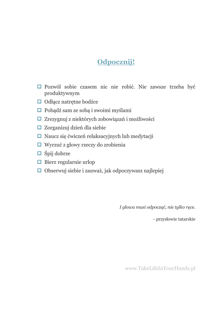 Odpocznij! Pozwól sobie czasem nic nie robić. Nie zawsze trzeba być produktywnym Odłącz natrętne bodźce Pobądź sam ze sobą i swoimi myślami Zrezygnuj z niektórych zobowiązań i możliwości Zorganizuj dzień dla siebie Naucz się ćwiczeń relaksacyjnych lub medytacji Wyrzuć z głowy rzeczy do zrobienia Śpij dobrze Bierz regularnie urlop Obserwuj siebie i zauważ, jak odpoczywasz najlepiej I głowa musi odpocząć, nie tylko ręce. - przysłowie tatarskie www.TakeLifeInYourHands.pl