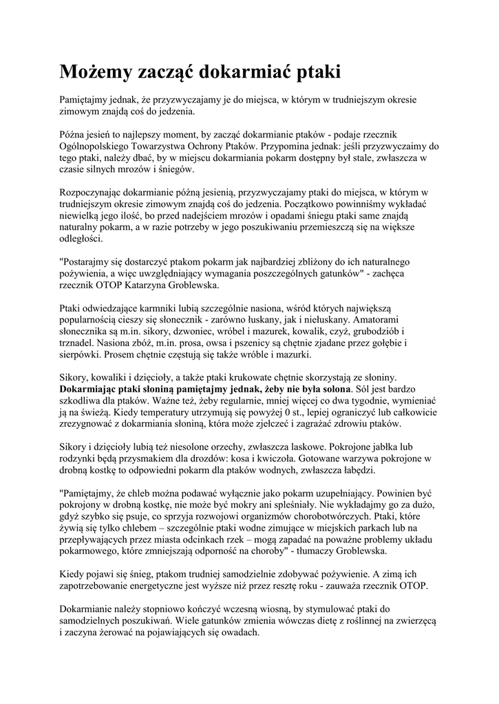 Możemy zacząć dokarmiać ptaki Pamiętajmy jednak, że przyzwyczajamy je do miejsca, w którym w trudniejszym okresie zimowym znajdą coś do jedzenia. Późna jesień to najlepszy moment, by zacząć dokarmianie ptaków - podaje rzecznik Ogólnopolskiego Towarzystwa Ochrony Ptaków. Przypomina jednak: jeśli przyzwyczaimy do tego ptaki, należy dbać, by w miejscu dokarmiania pokarm dostępny był stale, zwłaszcza w czasie silnych mrozów i śniegów. Rozpoczynając dokarmianie późną jesienią, przyzwyczajamy ptaki do miejsca, w którym w trudniejszym okresie zimowym znajdą coś do jedzenia. Początkowo powinniśmy wykładać niewielką jego ilość, bo przed nadejściem mrozów i opadami śniegu ptaki same znajdą naturalny pokarm, a w razie potrzeby w jego poszukiwaniu przemieszczą się na większe odległości. "Postarajmy się dostarczyć ptakom pokarm jak najbardziej zbliżony do ich naturalnego pożywienia, a więc uwzględniający wymagania poszczególnych gatunków" - zachęca rzecznik OTOP Katarzyna Groblewska. Ptaki odwiedzające karmniki lubią szczególnie nasiona, wśród których największą popularnością cieszy się słonecznik - zarówno łuskany, jak i niełuskany. Amatorami słonecznika są m.in. sikory, dzwoniec, wróbel i mazurek, kowalik, czyż, grubodziób i trznadel. Nasiona zbóż, m.in. prosa, owsa i pszenicy są chętnie zjadane przez gołębie i sierpówki. Prosem chętnie częstują się także wróble i mazurki. Sikory, kowaliki i dzięcioły, a także ptaki krukowate chętnie skorzystają ze słoniny. Dokarmiając ptaki słoniną pamiętajmy jednak, żeby nie była solona. Sól jest bardzo szkodliwa dla ptaków. Ważne też, żeby regularnie, mniej więcej co dwa tygodnie, wymieniać ją na świeżą. Kiedy temperatury utrzymują się powyżej 0 st., lepiej ograniczyć lub całkowicie zrezygnować z dokarmiania słoniną, która może zjełczeć i zagrażać zdrowiu ptaków. Sikory i dzięcioły lubią też niesolone orzechy, zwłaszcza laskowe. Pokrojone jabłka lub rodzynki będą przysmakiem dla drozdów: kosa i kwiczoła. Gotowane warzywa pokrojone w drobną kostkę to odpowiedni pokarm dla ptaków wodnych, zwłaszcza łabędzi. "Pamiętajmy, że chleb można podawać wyłącznie jako pokarm uzupełniający. Powinien być pokrojony w drobną kostkę, nie może być mokry ani spleśniały. Nie wykładajmy go za dużo, gdyż szybko się psuje, co sprzyja rozwojowi organizmów chorobotwórczych. Ptaki, które żywią się tylko chlebem – szczególnie ptaki wodne zimujące w miejskich parkach lub na przepływających przez miasta odcinkach rzek – mogą zapadać na poważne problemy układu pokarmowego, które zmniejszają odporność na choroby" - tłumaczy Groblewska. Kiedy pojawi się śnieg, ptakom trudniej samodzielnie zdobywać pożywienie. A zimą ich zapotrzebowanie energetyczne jest wyższe niż przez resztę roku - zauważa rzecznik OTOP. Dokarmianie należy stopniowo kończyć wczesną wiosną, by stymulować ptaki do samodzielnych poszukiwań. Wiele gatunków zmienia wówczas dietę z roślinnej na zwierzęcą i zaczyna żerować na pojawiających się owadach.