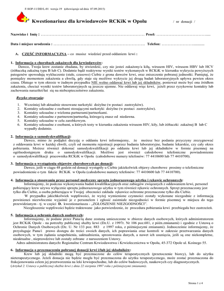 F-SOP-11/DD/L-01 wersja 19 (obowiązuje od dnia 07.09.2015) Kwestionariusz dla krwiodawców RCKiK w Opolu Nazwisko i Imię : …………………………………………………………… Pesel: / nr donacji / …………………………….... Data i miejsce urodzenia : ……………………………………………………. Telefon: ………………….......... A. CZĘŚĆ INFORMACYJNA – co musisz wiedzieć przed oddaniem krwi : 1. Informacja o chorobach zakaźnych dla krwiodawców: Dawco, Twoja krew zostanie zbadana, by stwierdzić, czy nie jesteś zakażony/a kiłą, wirusem HIV, wirusem HBV lub HCV (żółtaczką zakaźną typu B lub C). Dodatnie bądź reaktywne wyniki testów wykonanych w RCKiK w kierunku wykrycia powyższych patogenów spowodują wykluczenie (stałe, czasowe) Ciebie z grona dawców krwi, oraz zniszczenie pobranej jednostki. Pamiętaj, że pomiędzy momentem zakażenia a chwilą, gdy staje się możliwe wykrycie jej drogą badań laboratoryjnych upływa pewien okres czasu. Dlatego w tym okresie w żadnym przypadku NIE wolno oddawać krwi lub jej składników, ponieważ może być ona źródłem zakażenia, chociaż wyniki testów laboratoryjnych są jeszcze ujemne. Nie oddawaj więc krwi, jeżeli przez ryzykowne kontakty lub zachowania naraziłeś/łaś się na niebezpieczeństwo zakażenia. Ryzyko stwarzają: 1. 2. 3. 4. 5. 6. Wcześniej lub aktualnie stosowane narkotyki dożylne (w postaci zastrzyków). Kontakty seksualne z osobami stosującymi narkotyki dożylne (w postaci zastrzyków). Kontakty seksualne z wieloma partnerami/partnerkami. Kontakty seksualne z partnerem/partnerką, którego/ą znasz od niedawna. Kontakty seksualne w celu zarobkowym. Kontakty seksualne z osobami, u których testy w kierunku zakażenia wirusem HIV, kiły, lub żółtaczki zakaźnej B lub C wypadły dodatnio. 2. Informacja o samodyskwalifikacji: Dawco, mimo że podjąłeś decyzję o oddaniu krwi informujemy, że możesz bez podania przyczyny zrezygnować z oddawania krwi w każdej chwili, czyli od momentu rejestracji poprzez badania laboratoryjne, badanie lekarskie, czy cały okres pobierania. Możesz również dokonać samodyskwalifikacji po oddaniu krwi lub jej składników w formie pisemnej na ogólnodostępnym druku o samodyskwalifikacji. Możliwe jest również całodobowe telefoniczne powiadomienie o samodyskwalifikacji pracownika RCKiK w Opolu (całodobowe numery telefonów: 77 4410600 lub 77 4410700). 3. Informacja o wystąpieniu objawów chorobowych po donacji: Dawco, jeśli w ciągu 48 godzin od donacji wystąpiły u Ciebie jakiekolwiek objawy chorobowe prosimy o telefoniczne powiadomienie o tym fakcie RCKiK w Opolu (całodobowe numery telefonów: 77 4410600 lub 77 4410700). 4. Informacja o stosowaniu przez personel medyczny sprzętu jednorazowego użytku i rękawic ochronnych: Informujemy, że podczas wykonywania badań kwalifikacyjnych oraz zabiegów związanych z oddawaniem krwi, personel pobierający krew używa wyłącznie sprzętu jednorazowego użytku w tym również rękawic ochronnych. Sprzęt przeznaczony jest tylko dla Ciebie, a osoba pobierająca w Twojej obecności zakłada rękawice ochronne przeznaczone tylko dla Ciebie. W przypadku jakichkolwiek wątpliwości, że wyżej wymienione czynności zostały wykonane niezgodnie z informacją powinieneś niezwłocznie wyjaśnić je z personelem i zgłosić zaistniałe niezgodności w formie pisemnej w miejscu do tego przewidzianym - tj. w części D. kwestionariusza - „ZGŁOSZENIE NIEZGODNOŚCI”. Niezgłoszenie wątpliwości będzie traktowane jako potwierdzenie, że procedura pobierania krwi przebiegała bez zastrzeżeń. 5. Informacja o ochronie danych osobowych: Informujemy, że podane przez Pana/ią dane zostaną umieszczone w zbiorze danych osobowych, których administratorem jest RCKiK Opole - na potrzeby publicznej służby krwi (Dz.U. z 1997r. Nr 106 poz.681, z późn.zmianami) i zgodnie z Ustawą o Ochronie Danych Osobowych (Dz. U. Nr 133 poz. 883 z 1997 roku, z późniejszymi zmianami). Jednocześnie informujemy, że przysługuje Panu/i prawo dostępu do treści swoich danych, ich poprawiania oraz kontroli w zakresie przetwarzania danych osobowych, w tym żądania uzupełnienia, uaktualnienia, sprostowania danych, a nawet ich usunięcia, jeśli są one niekompletne, nieaktualne , nieprawdziwe lub zostały zebrane z naruszeniem Ustawy. Adres administratora danych: Regionalne Centrum Krwiodawstwa i Krwiolecznictwa w Opolu, 45-372 Opole ul. Kośnego 55. 6. Informacja o przeznaczeniu pobranej donacji krwi i/lub jej składników: Krew lub jej składniki mogą być przeznaczone do celów terapeutycznych (przetoczenie biorcy), lub do użytku nieterapeutycznego. Jeżeli donacja nie będzie mogła być przeznaczona do użytku terapeutycznego, może zostać przeznaczona do frakcjonowania celem jej przetworzenia na leki krwiopochodne, lub do celów badawczych, naukowych czy diagnostycznych. (Artykuł 2. Ustawy o publicznej służbie krwi z dnia 22 sierpnia 1997 roku z późniejszymi zmianami). Strona 1 z 4 A. CZĘŚĆ MEDYCZNA: Aby przygotować się do wywiadu z lekarzem kwalifikującym prosimy o wypełnienie poniższej ankiety medycznej. Zdajemy sobie sprawę, że zadając poniższe pytania wkraczamy w Twoją sferę prywatną. Dążąc do minimalizacji ryzyka przeniesienia zakażenia drogą krwi prosimy byś po przemyśleniu skrupulatnie i zgodnie z prawdą odpowiedział/a na postawione pytania. Udzielenie odpowiedzi na wszystkie pytania jest obowiązkowe. W przypadku,gdy nie jesteś pewny/a odpowiedzi - wątpliwości przedyskutuj z lekarzem kwalifikującym. Dziękujemy Państwu za współpracę TAK NIE ( Prosimy zaznaczyć odpowiedź prawidłową . W razie pomyłki błędne zaznaczenie prosimy otoczyć kółkiem i parafować ) □ □ □ □ □ □ □ □ □ □ □ □ □ □ □ □ 8. Czy w ciągu ostatnich 5 dni przyjmował/a Pan/i: Aspirynę, Polopirynę, Acard, Piroxicam ( Fel