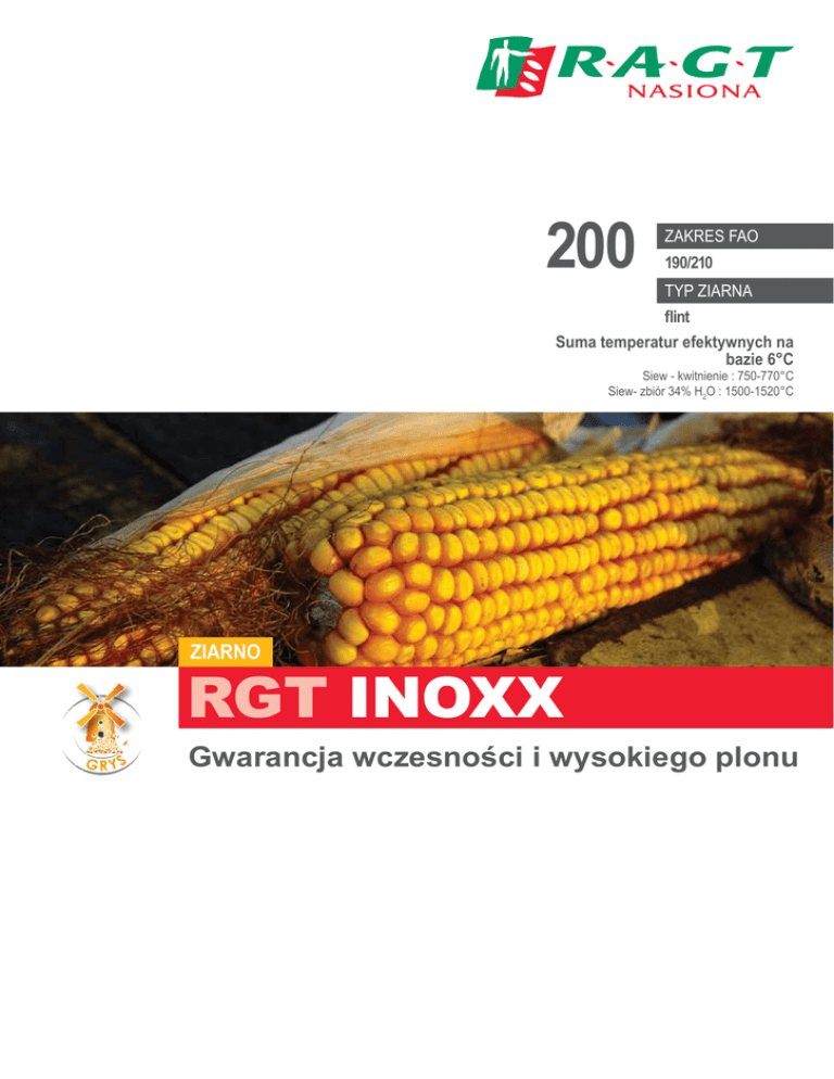 200 Zakres FAO 190/210 typ ziarna flint Suma temperatur efektywnych na bazie 6°C Siew - kwitnienie : 750-770°C Siew- zbiór 34% H2O : 1500-1520°C ziarno RGT inoxx G RYS Gwarancja wczesności i wysokiego plonu RGT INOXX ziarno 200 Zakres FAO 190/210 Gwarancja wczesności i wysokiego plonu profil odmiany Rejestracja: 2009 Typ mieszańca: pojedynczy Typ ziarna: flint G RYS Morfologia - Rośliny średniej wysokości - L iście wzniesione do góry z dość mocnym spadkiem - Duży udział ziarna w masie kolb Komponenty plonu Ilość rzędów Ilość ziarn. / rzęd. MTZ 14,9 28-30 290-300 g Zawartość suchej masy w ziarnie przy zbiorze (%). Doświadczenia PDO 2009-2012 r. Północ Polski. Grupa wczesna. 72 71 Kryteria agronomiczne Kryteria bezpieczeństwa - Wysoka zdrowotność rośliny - Mała wrażliwość na choroby łodyg - Mała wrażliwość na choroby kolb adaptacja do warunków Dobrych Trudnych Zimnych gleb ++++ ++++ ++++ zgs Zalecana gęstość siewu (nasion/ha) Ziarno 85-90 000 w w w . r a g t . p l RAGT Semences POLSKA Sp. z o.o. • ul. Sadowa 10A • 87-148 Łysomice • Tél. 566783207 • Tél/fax. 5667879 70 69 68 w% - Bardzo dobry wigor początkowy - Bardzo wczesna odmiana - Wysoka przydatność do produkcji grysu - Niska wilgotność przy zbiorze - Wysoki potencjał plonu na ziarno - Bardzo dobre oddawanie wody zarówno w okresie dojrzewania jak i suszenia - Duży udział ziarna w masie kolb - Znakomita wymłacalność ziarna - Wczesność, wydajność, regularność 67 wzorzec 66 RGT inoxx 65 64 63 62 2009 2010 2011 2012 Doświadczenia na Ziarno RAGT Polska Grupa wczesna Udział ziarna w masie kolb w % 2010 2011 RGT INOXX 80,5 82,9 Średnia badanych odmian 79,3 81,1 Wszyskie prezentowane dane techniczne zostały opracowane na podstawie wyników uzyskanych w oficjalnych badaniach COBORU oraz testów prowadzonych w sieci doświaczalnej RAGT Semences. Odzwierciedlają aktualny stan naszej wiedzy opartej na licznych, dokładnych badaniach i obserwacjach prowadzonych w wielu powtórzeniach i różnorodnych warunkach z uwzględnieniem trwałości poszczególnych gatunków. Prezentowane dane zmieniają się w zależności od warunków agroklimatycznych oraz stosowanej technologii uprawy. Wykorzystane zdjęcia pochodzą ze zbioru RAGT Semences..