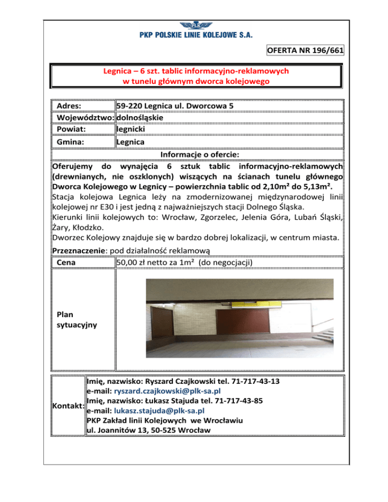 OFERTA NR 196/661 Legnica – 6 szt. tablic informacyjno-reklamowych w tunelu głównym dworca kolejowego Adres: 59-220 Legnica ul. Dworcowa 5 Województwo: dolnośląskie Powiat: legnicki Gmina: Legnica Informacje o ofercie: Oferujemy do wynajęcia 6 sztuk tablic informacyjno-reklamowych (drewnianych, nie oszklonych) wiszących na ścianach tunelu głównego Dworca Kolejowego w Legnicy – powierzchnia tablic od 2,10m² do 5,13m². Stacja kolejowa Legnica leży na zmodernizowanej międzynarodowej linii kolejowej nr E30 i jest jedną z najważniejszych stacji Dolnego Śląska. Kierunki linii kolejowych to: Wrocław, Zgorzelec, Jelenia Góra, Lubań Śląski, Żary, Kłodzko. Dworzec Kolejowy znajduje się w bardzo dobrej lokalizacji, w centrum miasta. Przeznaczenie: pod działalność reklamową Cena 50,00 zł netto za 1m² (do negocjacji) Plan sytuacyjny Imię, nazwisko: Ryszard Czajkowski tel. 71-717-43-13 e-mail: [email protected] Imię, nazwisko: Łukasz Stajuda tel. 71-717-43-85 Kontakt: e-mail: [email protected] PKP Zakład linii Kolejowych we Wrocławiu ul. Joannitów 13, 50-525 Wrocław