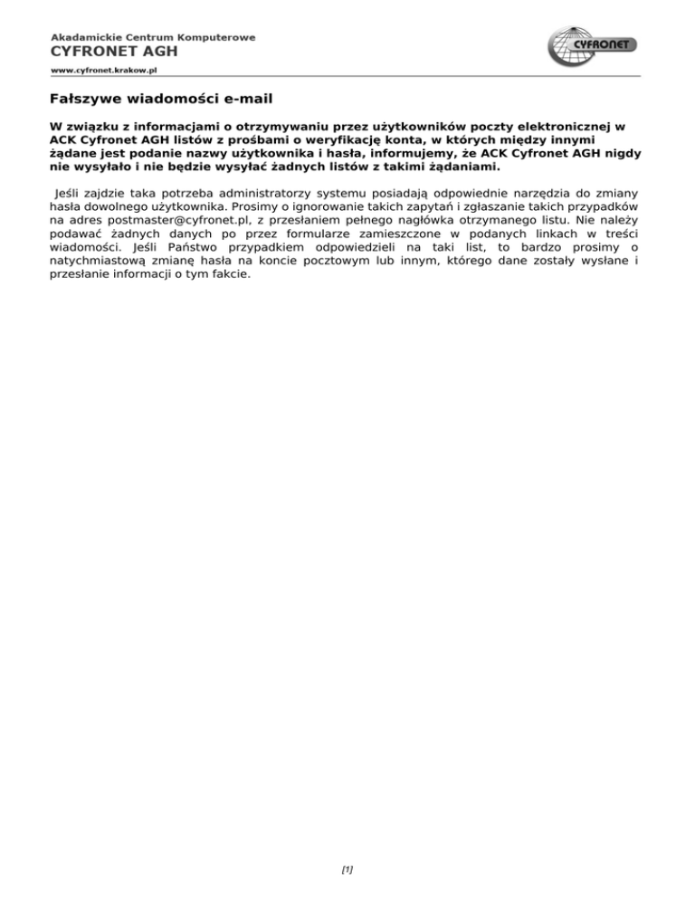 Fałszywe wiadomości e-mail W związku z informacjami o otrzymywaniu przez użytkowników poczty elektronicznej w ACK Cyfronet AGH listów z prośbami o weryfikację konta, w których między innymi żądane jest podanie nazwy użytkownika i hasła, informujemy, że ACK Cyfronet AGH nigdy nie wysyłało i nie będzie wysyłać żadnych listów z takimi żądaniami. Jeśli zajdzie taka potrzeba administratorzy systemu posiadają odpowiednie narzędzia do zmiany hasła dowolnego użytkownika. Prosimy o ignorowanie takich zapytań i zgłaszanie takich przypadków na adres [email protected], z przesłaniem pełnego nagłówka otrzymanego listu. Nie należy podawać żadnych danych po przez formularze zamieszczone w podanych linkach w treści wiadomości. Jeśli Państwo przypadkiem odpowiedzieli na taki list, to bardzo prosimy o natychmiastową zmianę hasła na koncie pocztowym lub innym, którego dane zostały wysłane i przesłanie informacji o tym fakcie. [1] Powered by TCPDF (www.tcpdf.org)