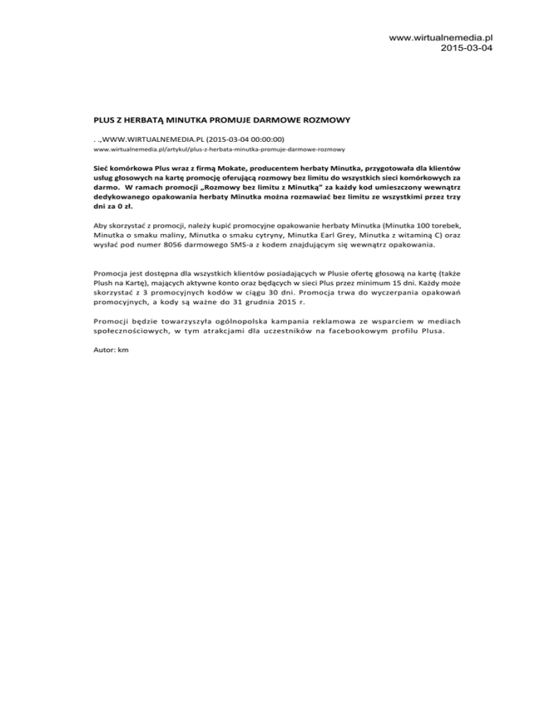 www.wirtualnemedia.pl 2015-03-04 PLUS Z HERBATĄ MINUTKA PROMUJE DARMOWE ROZMOWY . .,WWW.WIRTUALNEMEDIA.PL (2015-03-04 00:00:00) www.wirtualnemedia.pl/artykul/plus-z-herbata-minutka-promuje-darmowe-rozmowy Sieć komórkowa Plus wraz z firmą Mokate, producentem herbaty Minutka, przygotowała dla klientów usług głosowych na kartę promocję oferującą rozmowy bez limitu do wszystkich sieci komórkowych za darmo. W ramach promocji „Rozmowy bez limitu z Minutką” za każdy kod umieszczony wewnątrz dedykowanego opakowania herbaty Minutka można rozmawiać bez limitu ze wszystkimi przez trzy dni za 0 zł. Aby skorzystać z promocji, należy kupić promocyjne opakowanie herbaty Minutka (Minutka 100 torebek, Minutka o smaku maliny, Minutka o smaku cytryny, Minutka Earl Grey, Minutka z witaminą C) oraz wysłać pod numer 8056 darmowego SMS-a z kodem znajdującym się wewnątrz opakowania. Promocja jest dostępna dla wszystkich klientów posiadających w Plusie ofertę głosową na kartę (także Plush na Kartę), mających aktywne konto oraz będących w sieci Plus przez minimum 15 dni. Każdy może skorzystać z 3 promocyjnych kodów w ciągu 30 dni. Promocja trwa do wyczerpania opakowań promocyjnych, a kody są ważne do 31 grudnia 2015 r. Promocji będzie towarzyszyła ogólnopolska kampania reklamowa ze wsparciem w mediach społecznościowych, w tym atrakcjami dla uczestników na facebookowym profilu Plusa. Autor: km