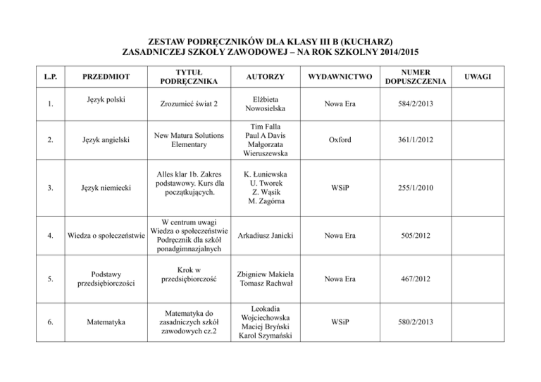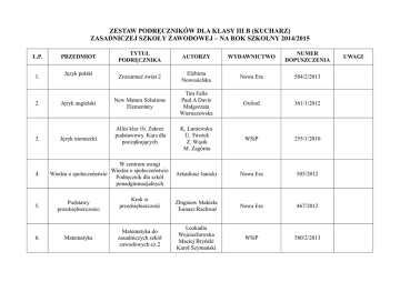 ZESTAW PODRĘCZNIKÓW DLA KLASY III B (KUCHARZ) ZASADNICZEJ SZKOŁY ZAWODOWEJ – NA ROK SZKOLNY 2014/2015 L.P. 1. 2. 3. 4. 5. 6. TYTUŁ PODRĘCZNIKA AUTORZY WYDAWNICTWO NUMER DOPUSZCZENIA Zrozumieć świat 2 Elżbieta Nowosielska Nowa Era 584/2/2013 Język angielski New Matura Solutions Elementary Tim Falla Paul A Davis Małgorzata Wieruszewska Oxford 361/1/2012 Język niemiecki Alles klar 1b. Zakres podstawowy. Kurs dla początkujących. K. Łuniewska U. Tworek Z. Wąsik M. Zagórna WSiP 255/1/2010 Arkadiusz Janicki Nowa Era 505/2012 Krok w przedsiębiorczość Zbigniew Makieła Tomasz Rachwał Nowa Era 467/2012 Matematyka do zasadniczych szkół zawodowych cz.2 Leokadia Wojciechowska Maciej Bryński Karol Szymański WSiP 580/2/2013 PRZEDMIOT Język polski W centrum uwagi Wiedza o społeczeństwie Wiedza o społeczeństwie Podręcznik dla szkół ponadgimnazjalnych Podstawy przedsiębiorczości Matematyka UWAGI 7. Religia 8. Technologia gastronomiczna z towaroznawstwem Sporządzanie i ekspedycja potraw i napojów cz.2 Technologia gastronomiczna 9. Pracownia gastronomiczna brak Anna Kmiołek WSiP 65/2013 Przygotowała: Natalia Granosik ZESTAW PODRĘCZNIKÓW DLA KLASY III C (MECHANIK POJAZDÓW SAMOCHODOWYCH) ZASADNICZEJ SZKOŁY ZAWODOWEJ – NA ROK SZKOLNY 2014/2015 L.P. 1. 2. 3. 4. 5. 6. TYTUŁ PODRĘCZNIKA AUTORZY WYDAWNICTWO NUMER DOPUSZCZENIA Zrozumieć świat 2 Elżbieta Nowosielska Nowa Era 584/2/2013 Język angielski New Matura Solutions Elementary Tim Falla Paul A Davis Małgorzata Wieruszewska Oxford 361/1/2012 Język niemiecki Alles klar 1b. Zakres podstawowy. Kurs dla początkujących. K. Łuniewska U. Tworek Z. Wąsik M. Zagórna WSiP 255/1/2010 Arkadiusz Janicki Nowa Era 505/2012 PRZEDMIOT Język polski W centrum uwagi Wiedza o społeczeństwie Wiedza o społeczeństwie Podręcznik dla szkół ponadgimnazjalnych Podstawy przedsiębiorczości Krok w przedsiębiorczość Zbigniew Makieła Tomasz Rachwał Nowa Era 467/2012 Matematyka Matematyka do zasadniczych szkół zawodowych cz.2 Leokadia Wojciechowska Maciej Bryński Karol Szymański WSiP 580/2/2013 UWAGI 7. 8. 9. Religia Podwozia i nadwozia pojazdów samochodowych Silniki pojazdów samochodowych 10. Podstawy elektrotechniki i elektroniki 11. Pracownia diagnostyki pojazdów samochodowych Podwozia i nadwozia pojazdów samochodowych. Podstawy teorii ruchu i eksploatacji oraz układ przeniesienia Marek Gabryelewicz napędu. Część I Układ hamulcowy i kierowniczy, zawieszenie oraz nadwozie. Część II Podstawy budowy oraz główne zespoły i układy mechaniczne. Część I Układy zasilania, chłodzenia, smarowania, dolotowe i wylotowe Piotr Zając Pracownia diagnostyki pojazdów samochodowych Przemysław Kubiak Marek Zalewski WKŁ 06/2010 WKŁ 2011 WKŁ 4/2009 WKŁ 2010 WKŁ 2012 12. Język angielski (zawodowy) 13. Język niemiecki (zawodowy) Z zakupem podręczników z religii, języka zawodowego oraz podstaw elektrotechniki i elektroniki proszę wstrzymać się do września Opracowała: Natalia Granosik