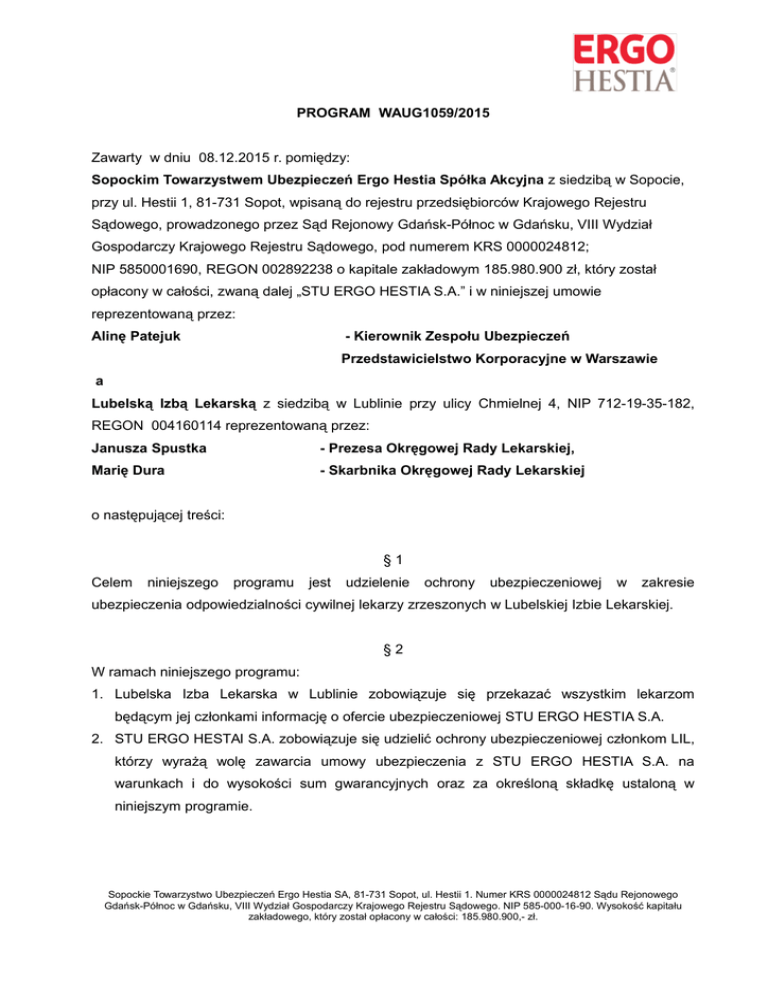PROGRAM WAUG1059/2015 Zawarty w dniu 08.12.2015 r. pomiędzy: Sopockim Towarzystwem Ubezpieczeń Ergo Hestia Spółka Akcyjna z siedzibą w Sopocie, przy ul. Hestii 1, 81-731 Sopot, wpisaną do rejestru przedsiębiorców Krajowego Rejestru Sądowego, prowadzonego przez Sąd Rejonowy Gdańsk-Północ w Gdańsku, VIII Wydział Gospodarczy Krajowego Rejestru Sądowego, pod numerem KRS 0000024812; NIP 5850001690, REGON 002892238 o kapitale zakładowym 185.980.900 zł, który został opłacony w całości, zwaną dalej „STU ERGO HESTIA S.A.” i w niniejszej umowie reprezentowaną przez: Alinę Patejuk - Kierownik Zespołu Ubezpieczeń Przedstawicielstwo Korporacyjne w Warszawie a Lubelską Izbą Lekarską z siedzibą w Lublinie przy ulicy Chmielnej 4, NIP 712-19-35-182, REGON 004160114 reprezentowaną przez: Janusza Spustka - Prezesa Okręgowej Rady Lekarskiej, Marię Dura - Skarbnika Okręgowej Rady Lekarskiej o następującej treści: §1 Celem niniejszego programu jest udzielenie ochrony ubezpieczeniowej w zakresie ubezpieczenia odpowiedzialności cywilnej lekarzy zrzeszonych w Lubelskiej Izbie Lekarskiej. §2 W ramach niniejszego programu: 1. Lubelska Izba Lekarska w Lublinie zobowiązuje się przekazać wszystkim lekarzom będącym jej członkami informację o ofercie ubezpieczeniowej STU ERGO HESTIA S.A. 2. STU ERGO HESTAI S.A. zobowiązuje się udzielić ochrony ubezpieczeniowej członkom LIL, którzy wyrażą wolę zawarcia umowy ubezpieczenia z STU ERGO HESTIA S.A. na warunkach i do wysokości sum gwarancyjnych oraz za określoną składkę ustaloną w niniejszym programie. Sopockie Towarzystwo Ubezpieczeń Ergo Hestia SA, 81-731 Sopot, ul. Hestii 1. Numer KRS 0000024812 Sądu Rejonowego Gdańsk-Północ w Gdańsku, VIII Wydział Gospodarczy Krajowego Rejestru Sądowego. NIP 585-000-16-90. Wysokość kapitału zakładowego, który został opłacony w całości: 185.980.900,- zł. §3 W przypadku obowiązkowego ubezpieczenia odpowiedzialności cywilnej podmiotu wykonującego działalność leczniczą STU ERGO HESTIA S.A.. oferuje następujące warunki: 1. Zakres ubezpieczenia zgodny z rozporządzeniem ministra finansów z dnia 22.12.2011 r. w sprawie obowiązkowego ubezpieczenia odpowiedzialności cywilnej podmiotu wykonującego działalność leczniczą 2. Minimalna suma gwarancyjna ubezpieczenia OC w okresie ubezpieczenia nie dłuższym niż 12 miesięcy, wynosi równowartość w złotych 75 000 EUR w odniesieniu do jednego zdarzenia oraz 350 000 EUR w odniesieniu do wszystkich zdarzeń 3. Rozróżnia się trzy grupy ryzyka, według których zaszeregowane są osoby wykonujące zawód medyczny w ramach indywidualnej praktyki lekarskiej: a. lekarze III grupy - specjalizacja: ortopedia, chirurgia stomatologiczna, chirurgia naczyniowa, anestezjologia i intensywna terapia, chirurgia klatki piersiowej, chirurgia ogólna, chirurgia szczękowo-twarzowa, ginekologia onkologiczna kardiochirurgia, neurochirurgia i traumatologia narządu ruchu, położnictwo i ginekologia, chirurgia dziecięca, urologia, chirurgia onkologiczna, chirurgia plastyczna, urologia dziecięca, medycyna ratunkowa, neonatologia; b. lekarze II grupy - specjalizacja: ortodoncja, periodontologia, protetyka stomatologiczna, radioterapia onkologiczna, stomatologia zachowawcza, medycyna sportowa, stomatologia dziecięca c. lekarze I grupy - specjalizacja: lekarze pozostałych specjalności nie wymienionych w pkt a. lub pkt b. 4. W przypadku lekarzy zaszeregowanych do I grupy ryzyka, gdy lekarz specjalista wykonuje zabiegi chirurgiczne, endoskopowe lub z zakresu radiologii interwencyjnej nalicza się składkę przewidzianą dla grupy II. 5. W przypadku posiadania dwóch lub większej liczby specjalizacji, o zaszeregowaniu do odpowiedniej grupy decyduje ta specjalizacja, która jest faktycznie wykonywana. Jeżeli lekarz ma dwie lub więcej specjalizacji i wszystkie wykonuje, to o przynależności do grupy decyduje ta specjalizacja, która jest w grupie o najwyższej składce. 6. W przypadku braku specjalizacji, składkę ustala się według I grupy ryzyka z zastrzeżeniem ust. 4. Sopockie Towarzystwo Ubezpieczeń Ergo Hestia SA, 81-731 Sopot, ul. Hestii 1. Numer KRS 0000024812 Sądu Rejonowego Gdańsk-Północ w Gdańsku, VIII Wydział Gospodarczy Krajowego Rejestru Sądowego. NIP 585-000-16-90. Wysokość kapitału zakładowego, który został opłacony w całości: 185.980.900,- zł. 7. W przypadku posiadania specjalizacji, a wykonywania w praktyce innej specjalizacji (w trakcie specjalizowania się), o przynależności do odpowiedniej grupy decyduje specjalizacja faktycznie wykonywana. 8. Składka roczna: a/ lekarze III grupy ryzyka – 400,00 PLN b/ lekarze II grupy ryzyka – 200,00 PLN c/ lekarze I grupy ryzyka – 100,00 PLN §4 W przypadku dobrowolnego ubezpieczenia odpowiedzialności cywilnej osób wykonujących zawód lekarza, STU ERGO HESTIA S.A.. oferuje następujące warunki: 1. Podstawę zawarcia umowy stanowią Ogólne Warunki Ubezpieczenia Odpowiedzialności Cywilnej lekarzy, farmaceutów i innych osób świadczących usługi o charakterze medycznym z dnia 10.08.2007 (OC/OW033/1010). 2. W zakresie niniejszego programu ochrona ubezpieczeniowa obejmuje rażące niedbalstwo. 3. Zakres jest rozszerzony o ryzyko przeniesienia chorób zakaźnych (w tym HIV i WZW) sublimit maksymalny (w zależności od wybranego wariantu) wynosi 1 500 000 PLN na jeden i wszystkie wypadki w okresie ubezpieczenia. 4. Zakres ubezpieczenia jest rozszerzony o szkody powstałe w związku z przekroczeniem terminu świadczeń medycznych: sublimit 15.000 pln/osoba. 5. Zakres ubezpieczenia jest rozszerzony o szkody spowodowane uchybieniami natury organizacyjnej, administracyjnej, porządkowej oraz w związku z posiadaną aparaturą medyczną lub techniczną: sublimit 25.000 pln/osoba. 6. Zakres jest rozszerzony o szkody wyrządzone personelowi tej samej jednostki organizacyjnej. 7. Zakres jest rozszerzony o szkody wyrządzone osobom bliskim U