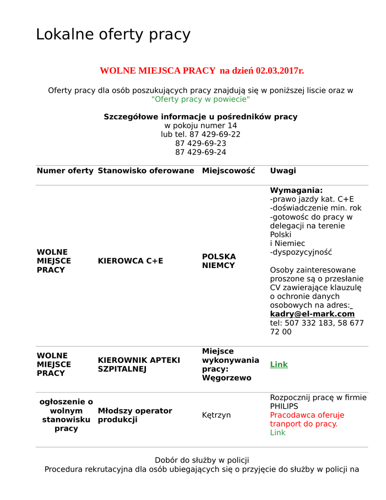 Lokalne oferty pracy WOLNE MIEJSCA PRACY na dzień 02.03.2017r. Oferty pracy dla osób poszukujących pracy znajdują się w poniższej liscie oraz w "Oferty pracy w powiecie" Szczegółowe informacje u pośredników pracy w pokoju numer 14 lub tel. 87 429-69-22 87 429-69-23 87 429-69-24 Numer oferty Stanowisko oferowane WOLNE MIEJSCE PRACY KIEROWCA C+E WOLNE MIEJSCE PRACY KIEROWNIK APTEKI SZPITALNEJ ogłoszenie o wolnym Młodszy operator stanowisku produkcji pracy Miejscowość POLSKA NIEMCY Uwagi Wymagania: -prawo jazdy kat. C+E -doświadczenie min. rok -gotowośc do pracy w delegacji na terenie Polski i Niemiec -dyspozycyjność Osoby zainteresowane proszone są o przesłanie CV zawierające klauzulę o ochronie danych osobowych na adres: [email protected] tel: 507 332 183, 58 677 72 00 Miejsce wykonywania pracy: Węgorzewo Link Kętrzyn Rozpocznij pracę w firmie PHILIPS Pracodawca oferuje tranport do pracy. Link Dobór do służby w policji Procedura rekrutacyjna dla osób ubiegających się o przyjęcie do służby w policji na terenie województwa Warmińsko-Mazurskiego Ogłoszenie - dobór do służby w policji w 2017 roku ——————————————————————————————————————————— —————————— Firma Go Work.pl z siedzibą w Białymstoku poszukuje osób do pracy w Niemczech na stanowisko opiekun osoby starszej. Informacje dotyczące warunków zatrudnienia w załączniku. Oferta ——————————————————————————————————————————— —————————— Bioar wyłączny importer Marki Insight poszukuje Dystrybutorów Oferta skierowana jest do osób kreatywnych ceniących niezależność oraz samodzielność w działaniu. Więcej informacji dostępne w poniższym linku: Oferta ——————————————————————————————————————————— —————————— Jednostka Wojskowa nr 3797 w Giżycku pragnie poinformować, że zważywszy na rangę oraz wymiar społeczny skutków bezrobocia w regionie może przyjąć 150 osób do służby w korpusie szeregowych zawodowych. Jednostka posiada wolne stanowiska: celowniczych, strzelców, zwiadowców, mechaników, elektromechaników, kierowców: pojazdów gąsienicowych, kat. C i C+E. Szczegółowych informacji udziela Pan Marcin Patryło pod nr telefonu 261-335-255. Oferta traci ważność z dniem 31.12.2016 r. ——————————————————————————————————————————— —————————— Aby uzyskać więcej informacji na temat Narodowych Sił Rezerwowych kliknij w poniższe linki lub logo www.wojsko-polskie.pl www.szukajnsr.wp.mil.pl www.mon.gov.pl