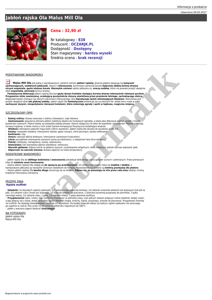 Informacje o produkcie Utworzono 04-03-2017 Jabłoń rajska Ola Malus Mill Ola Cena : 32,90 zł Nr katalogowy : 838 Producent : OCZARJK.PL Dostępność : Dostępny Stan magazynowy : bardzo wysoki Średnia ocena : brak recenzji PODSTAWOWE WIADOMOŚCI SZCZEGÓŁOWY OPIS er m ar k Malus Mill Ola jest jedną z najciekawszych, polskich odmian jabłoni rajskiej. Jesienią gałęzie obsypują się tysiącami zachwycających, ozdobnych jabłuszek. Owoce o intensywnej, karminowo-czerwonej barwie bajecznie zdobią koronę drzewa niczym wspaniałe, gęsto ułożone korale. Niezwykle cenione rajskie jabłuszka są uroczą ozdobą, która nie pozwala przejść obojętnie obok wspaniałej, ażurowej korony drzewa. Fantastyczną dekoracją jabłoni rajskiej Ola jest gęsty dywan kwiatów otulający koronę drzewa intensywnie różowym puchem. Przypomina nisko zawieszoną, urzekającą puszystością chmurę oświetloną przez promienie letniego, zachodzącego słońca. Wspaniałe kwiaty mieniące się różnymi odcieniami intensywnego różu hipnotyzują swoim olśniewającym blaskiem. Niemożliwe jest przejść obojętnie obok tak pięknej ozdoby. Jabłoń rajska Ola fantastycznie prezentuje się na zielonym tle- dzięki temu może w pełni zachwycać dużymi, niespotykanie różowymi kwiatami, które zmieniają ogrody i parki w bajkowe, magiczne miejsca. - Rodzaj rośliny: drzewo owocowe z rodziny różowatych, rząd różowce. - Zastosowanie: popularna odmiana jabłoni ozdobnej idealna do mniejszych ogrodów, a także jako dekoracja parków, osiedli i innych przestrzeni zielonych. Piękne kwiaty są niezwykłą ozdobą drzewa. Owoce nadają się nie tylko do wypieków i przetworów. Pięknie ozdabiają zimowy krajobraz, a także można z nich zrobić barwne kompozycje florystyczne ozdabiające wnętrze. - Wielkość: oferowane sadzonki mają około 150cm wysokości. Jabłoń rajska Ola dorasta do wysokości około 5m. - Kwiaty: niezwykle ozdobne, intensywnie różowe, gęsto rosnące, silnie pachnące, bardzo efektowne. - Kwitnienie: maj. - Owoce: owocuje obficie drobnymi, intensywnie czerwonymi kuleczkami. - Liście: początkowo intensywnie czerwone (zaraz po kwitnieniu), z nadejściem lata liście zielenieją. - Pokrój: rozłożysty, nieregularny, kulisty, spłaszczony. - Stanowisko: lubi stanowiska dobrze oświetlone i słoneczne. - Warunki glebowe: dobrze rośnie na glebach żyznych, umiarkowanie wilgotnych, lekko kwaśnych, jednak toleruje większość gleb. - Odporność na warunki zimowe: drzewo odporne na niskie temperatury. DODATKOWE WIADOMOŚCI PRZEPIS DNIA Rajskie muffinki at - Jabłoń rajska Ola do obfitego kwitnienia i owocowania potrzebuje delikatnego cięcia gałązek suchych i połamanych. Przez pierwszych kilka lat świetnie znosi formowanie. - Owoce jabłoni rajskiej Ola nadają się do spożycia po przetworzeniu. Ich skórka oraz miąższ robią się miękkie i słodkie, a kandyzowane jabłuszka są niezwykle cenionym dodatkiem do herbaty. Pozostawione na drzewie są świetną przekąską dla ptaków. - Owoce jabłoni rajskiej Ola bardzo długo utrzymują się na drzewie. Zdarza się, że pozostają na nim przez całą zimę zdobiąc mroźny krajobraz intensywną czerwienią. w - Składniki: 12 dojrzałych rajskich jabłuszek, 2/3 szklanki mąki pszennej tortowej, 1/2 szklanki orzechów włoskich lub laskowych (lub pół na pół), 1/2 szklanki cukru (może być brązowy), 1/2 łyżeczki proszku do pieczenia, 1 łyżeczka korzennej przyprawy do pierników, 1 łyżka ciemnego kakao, 1/2 szklanki oleju, 1 jajko, 1/3 szklanki mleka, 1 łyżka dowolnej konfitury. - Przygotowanie: Jajko, mleko, olej i konfiturę zmiksować na jednolitą masę, czyli jednym słowem połączyć mokre składniki. Dodać cukier, a gdy połączy się z masą, dodać wszystkie sypkie składniki (mąkę, orzechy, kakao, przyprawy, proszek do pieczenia). Przygotować foremkę na muffinki. Do każdego otworu wlewać ciasto do 2/3 wysokości. Do każdej babeczki włożyć po jednym rajskim jabłuszku nie zanurzając go zupełnie w cieście. Piec przez 15-20 minut w piekarniku nagrzanym do 180°C. - Jabłko z wieczora odgoni doktora! Smacznego! NA FOTOGRAFII Jabłoń rajska Ola Malus Mill Ola Wygenerowano w programie www.oscGold.com er m ar k DLACZEGO WARTO KUPIĆ ROŚLINY U NAS - Wszystkie sadzonki drzew i krzewów owocowych staramy się dostarczać w bardzo dobrym stanie, zdrowe i zadbane. Dokładamy wszelkich starań, aby wygląd materiału sadzeniowego spełniał Państwa oczekiwania. Poza tym na większości stron naszych ofert na ostatnim zdjęciu poniżej przedstawiamy wygląd przykładowych rzeczywistych sadzonek, aby każdy mógł zobaczyć co kupuje. - W okresie zimowym, wczesnowiosennym lub późnojesiennym możliwe są braki poszczególnych gatunków, co naturalnie związane jest z sezonem wegetacyjnym roślin. Sadzonki często mają naturalnie przycięte czubki celem rozkrzewienia się pędu głównego. - Sadzonki drzew i krzewów owocowych przeważnie wysyłane są w formie paczki kartonowej. w at KONIECZNIE ZOBACZ
