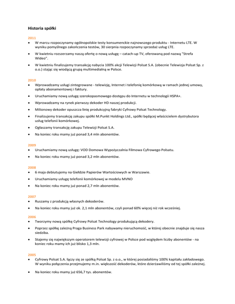 Historia spółki 2011 W marcu rozpoczynamy ogólnopolskie testy konsumenckie najnowszego produktu ‐ Internetu LTE. W wyniku pomyślnego zakończenia testów, 30 sierpnia rozpoczynamy sprzedaż usług LTE. W kwietniu rozszerzamy naszą ofertę o nową usługę – catach‐up TV, oferowaną pod nazwą "Strefa Wideo”. W kwietniu finalizujemy transakcję nabycia 100% akcji Telewizji Polsat S.A. (obecnie Telewizja Polsat Sp. z o.o.) stając się wiodącą grupą multimedialną w Polsce. 2010 Wprowadzamy usługi zintegrowane ‐ telewizję, Internet i telefonię komórkową w ramach jednej umowy, opłaty abonamentowej i faktury. Uruchamiamy nową usługę szerokopasmowego dostępu do Internetu w technologii HSPA+. Wprowadzamy na rynek pierwszy dekoder HD naszej produkcji. Milionowy dekoder opuszcza linię produkcyjną fabryki Cyfrowy Polsat Technology. Finalizujemy transakcję zakupu spółki M.Punkt Holdings Ltd., spółki będącej właścicielem dystrybutora usług telefonii komórkowej. Ogłaszamy transakcję zakupu Telewizji Polsat S.A. Na koniec roku mamy już ponad 3,4 mln abonentów. 2009 Uruchamiamy nową usługę: VOD Domowa Wypożyczalnia Filmowa Cyfrowego Polsatu. Na koniec roku mamy już ponad 3,2 mln abonentów. 2008 6 maja debiutujemy na Giełdzie Papierów Wartościowych w Warszawie. Uruchamiamy usługę telefonii komórkowej w modelu MVNO Na koniec roku mamy już ponad 2,7 mln abonentów. 2007 Ruszamy z produkcją własnych dekoderów. Na koniec roku mamy już ok. 2,1 mln abonentów, czyli ponad 60% więcej niż rok wcześniej. 2006 Tworzymy nową spółkę Cyfrowy Polsat Technology produkującą dekodery. Poprzez spółkę zależną Praga Business Park nabywamy nieruchomość, w której obecnie znajduje się nasza siedziba. Stajemy się największym operatorem telewizji cyfrowej w Polsce pod względem liczby abonentów ‐ na koniec roku mamy ich już blisko 1,3 mln. 2005 Cyfrowy Polsat S.A. łączy się ze spółką Polsat Sp. z o.o., w której posiadaliśmy 100% kapitału zakładowego. W wyniku połączenia przejmujemy m.in. większość dekoderów, które dzierżawiliśmy od tej spółki zależnej. Na koniec roku mamy już 656,7 tys. abonentów. 2004 Zmieniamy nazwę spółki na Cyfrowy Polsat S.A. Na koniec roku mamy już 393,2 tys. abonentów. 2003 Uzyskujemy koncesję na bezprzewodowe rozprowadzanie satelitarnych programów radiowych i telewizyjnych. Dzięki temu stajemy się w pełni niezależnym operatorem platformy cyfrowej. 2000/2001 Zmieniamy nazwę z Market S.A. na Polsat Cyfrowy S.A. Zawieramy porozumienie z Telewizją Polsat S.A. dotyczące działalności płatnej cyfrowej platformy satelitarnej. 1999 Rozpoczynamy dostawy sygnału satelitarnego. 1996 Zawiązujemy spółkę akcyjną pod nazwą Market S.A.