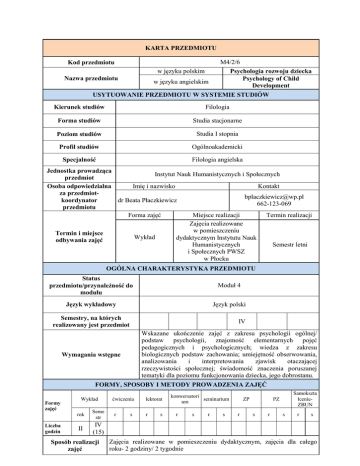 KARTA PRZEDMIOTU Kod przedmiotu w języku polskim Nazwa przedmiotu w języku angielskim M4/2/6 Psychologia rozwoju dziecka Psychology of Child Development USYTUOWANIE PRZEDMIOTU W SYSTEMIE STUDIÓW Kierunek studiów Filologia Forma studiów Studia stacjonarne Poziom studiów Studia I stopnia Profil studiów Ogólnoakademicki Specjalność Filologia angielska Jednostka prowadząca Instytut Nauk Humanistycznych i Społecznych przedmiot Osoba odpowiedzialna Imię i nazwisko Kontakt za [email protected] koordynator dr Beata Płaczkiewicz 662-123-069 przedmiotu Forma zajęć Miejsce realizacji Termin realizacji Zajęcia realizowane w pomieszczeniu Termin i miejsce Wykład dydaktycznym Instytutu Nauk odbywania zajęć Humanistycznych Semestr letni i Społecznych PWSZ w Płocku OGÓLNA CHARAKTERYSTYKA PRZEDMIOTU Status przedmiotu/przynależność do modułu Moduł 4 Język wykładowy Język polski Semestry, na których realizowany jest przedmiot IV Wskazane ukończenie zajęć z zakresu psychologii ogólnej/ podstaw psychologii, znajomość elementarnych pojęć pedagogicznych i psychologicznych; wiedza z zakresu biologicznych podstaw zachowania; umiejętność obserwowania, analizowania i interpretowania zjawisk otaczającej rzeczywistości społecznej; świadomość znaczenia poruszanej tematyki dla poziomu funkcjonowania dziecka, jego dobrostanu. Wymagania wstępne FORMY, SPOSOBY I METODY PROWADZENIA ZAJĘĆ Formy zajęć Liczba godzin Wykład rok Seme str II IV (15) Sposób realizacji zajęć ćwiczenia r s lektorat r s konwersatori seminarium um r s r s ZP r Samokszta łcenieZBUN PZ s r s r s Zajęcia realizowane w pomieszczeniu dydaktycznym, zajęcia dla całego roku- 2 godziny/ 2 tygodnie Sposób zaliczenia zajęć Zaliczenie na ocenę - wykład z prezentacją multimedialną i elementami konwersatorium Metody dydaktyczne - dyskusja - dzielenie się doświadczeniami Przedmioty powiązane/moduł Moduł 4 Harwas- Napierała B., Trempała J. (red.). (2002). Psychologia rozwoju człowieka, t. 2. Warszawa: Wydawnictwo Naukowe PWN. Kielar- Turska M. (2000). Rozwój człowieka w pełnym cyklu życia. [W:] J. Strelau (red.), Psychologia. Podręcznik akademicki t. 1 (s. 285- 332). Gdańsk: Gdańskie Wydawnictwo Psychologiczne. PodSchaffer H., R. (2008). Psychologia dziecka. Warszawa: Wydawnictwo stawowa Naukowe PWN. Turner J., S., Helms D., B. (1999). Rozwój człowieka. Warszawa: Wydawnictwa Szkolne i Pedagogiczne. Wykaz literatury Vasta R., Haith M., M., Miller S., A. (1995). Psychologia dziecka. Warszawa: Wydawnictwa Szkolne i Pedagogiczne. Birch A. (2005). Psychologia rozwojowa w zarysie: Od niemowlęctwa do dorosłości. Warszawa: Wydawnictwo Naukowe PWN. Brzezińska A., Trempała J. (2000). Wprowadzenie do psychologii rozwoju. [W:] J. Strelau (red.), Psychologia. Podręcznik akademicki, t. 1 (s. 229- 283). Gdańsk: Gdańskie Wydawnictwo Psychologiczne. Ilg F., L., Ames L., B., Baker S., M. (2010). Rozwój psychiczny dziecka od 0 do 10 lat. Poradnik dla rodziców, psychologów i lekarzy. Gdańsk: Gdańskie Uzupełni Wydawnictwo Psychologiczne. ająca Piaget J. (2005). Mowa i myślenie dziecka. Warszawa: Wydawnictwo Naukowe PWN. Rathus S., A. (2004). Psychologia współczesna. Gdańsk: Gdańskie Wydawnictwo Psychologiczne. Zimbardo P., G. (2005). Psychologia i życie. Warszawa: Wydawnictwo Naukowe PWN. CELE, TREŚCI I EFEKTY KSZTAŁCENIA Cele przedmiotu (ogólne, szczegółowe) Studenci uczestniczący w zajęciach z zakresu psychologii rozwoju dziecka poznają podstawową terminologię i sposoby konceptualizacji rozwoju psychicznego człowieka. Zajęcia ukierunkowane są także na zapoznanie słuchaczy z poszczególnymi fazami rozwoju psychicznego w okresie dzieciństwa oraz z zagadnieniem wychowania w różnych jego aspektach. Przyswojenie pojęć i teorii psychologicznych z zakresu psychologii rozwojowej. Kształcenie umiejętności posługiwania się podstawowymi i pojęciami właściwymi dla psychologii rozwoju dziecka. ujęciami teoretycznymi Kształcenie umiejętności wyszukiwania, analizowania i interpretowania danych z zakresu psychologii rozwojowej oraz sprawnego wypowiadania się w tym zakresie. Kształcenie postawy odpowiedzialności poprzez zwiększanie świadomości dotyczącej własnej wiedzy i posiadanych umiejętności oraz potrzeby ich pogłębiania i rozwijania. WIADOMOŚCI Wiedza dotycząca znaczenia psychologii rozwojowej w kontekście innych nauk. Wiedza dotycząca terminologii stosowanej w obszarze psychologii rozwoju dziecka. Wiedza dotycząca kierunków rozwoju współczesnej psychologii rozwojowej UMIEJĘTNOŚCI Umiejętność posługiwania się podstawowymi ujęciami teoretycznymi z zakresu psychologii rozwoju dziecka. Umiejętność wyszukiwania, analizowania, interpretacji danych z zakresu psychologii rozwojowej. Umiejętność samodzielnego formułowania wypowiedzi dotyczących zagadnień z obszaru psychologii rozwojowej. KOMPETENCJE Postawa odpowiedzialności poprzez samoświadomość w zakresie własnej wiedzy i posiadanych umiejętności oraz potrzeby ich pogłębiania i rozwijania. Treści programowe Efekty kształcenia (kody) Form a zajęć Temat W01, W02, W03, U01, K01 1. ROZWÓJ CZŁOWIEKA- podstawowa terminologia, cechy zmiany rozwojowej, kryteria i obszary rozwoju, rodzaje zmian rozwojowych. W01, W02, U01 2. WYBRANE KONCEPCJE I TEORIE ROZWOJU PSYCHICZNEGO (m.in. teoria rozwoju psychospołecznego Eriksona, teoria rozwoju umysłowego Piageta, teoria Wygotskiego) Wykł ad Liczba godzin Suma liczby godzin 15 godzin W01, W02, U01, U02 W02, U03, K02 W02, W03, U02, K01 W02, U02, K02 Liczby 3. CZYNNIKI ROZWOJU PSYCHICZNEGO z uwzględnieniem różnych sposobów godzin dla konceptualizacji. CZYNNIKI RYZYKA poszczególn ZABURZEŃbiologiczne, środowiskowe, ych zajęć: w poszczególnych okresach rozwojowych. 1.- 2 godz. 4. CHARAKTERYSTYKA FAZ ROZWOJU 2.- 2 godz. PSYCHICZNEGO DZIECKA- wczesne, średnie 3.- 2 godz. i późne dzieciństwo w poszczególnych sferach 4.- 