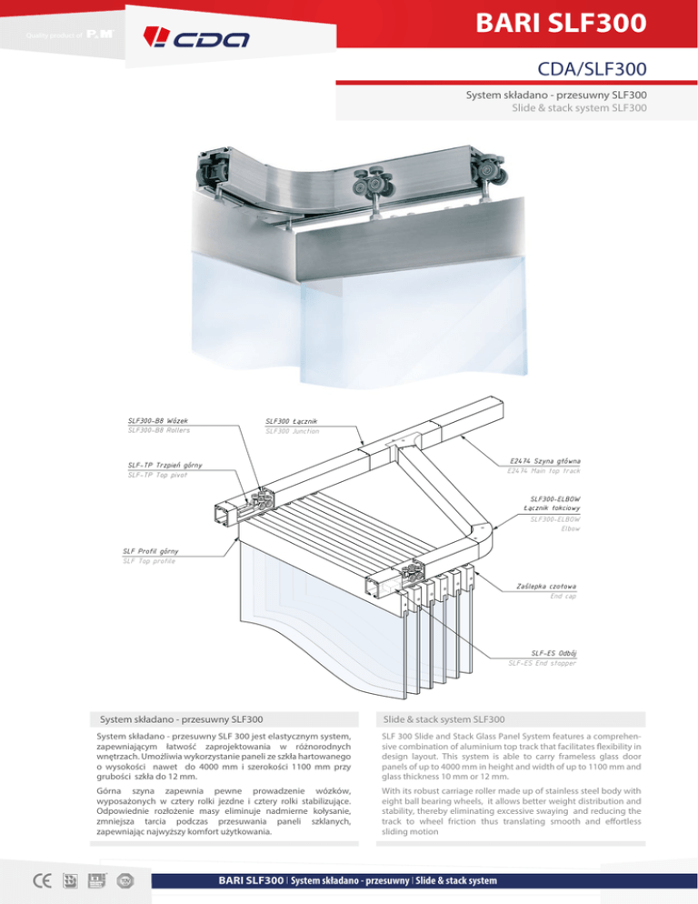 BARI SLF300 Quality product of CDA/SLF300 System składano - przesuwny SLF300 Slide & stack system SLF300 SLF300-B8 Wózek SLF300-B8 Rollers SLF300 Łącznik SLF300 Junction E2474 Szyna główna E2474 Main top track SLF-TP Trzpień górny SLF-TP Top pivot SLF300-ELBOW Łącznik łokciowy SLF300-ELBOW Elbow SLF Profil górny SLF Top profile Zaślepka czołowa End cap SLF-ES Odbój SLF-ES End stopper System składano - przesuwny SLF300 Slide & stack system SLF300 System składano - przesuwny SLF 300 jest elastycznym system, zapewniającym łatwość zaprojektowania w różnorodnych wnętrzach. Umożliwia wykorzystanie paneli ze szkła hartowanego o wysokości nawet do 4000 mm i szerokości 1100 mm przy grubości szkła do 12 mm. SLF 300 Slide and Stack Glass Panel System features a comprehensive combination of aluminium top track that facilitates flexibility in design layout. This system is able to carry frameless glass door panels of up to 4000 mm in height and width of up to 1100 mm and glass thickness 10 mm or 12 mm. Górna szyna zapewnia pewne prowadzenie wózków, wyposażonych w cztery rolki jezdne i cztery rolki stabilizujące. Odpowiednie rozłożenie masy eliminuje nadmierne kołysanie, zmniejsza tarcia podczas przesuwania paneli szklanych, zapewniając najwyższy komfort użytkowania. With its robust carriage roller made up of stainless steel body with eight ball bearing wheels, it allows better weight distribution and stability, thereby eliminating excessive swaying and reducing the track to wheel friction thus translating smooth and effortless sliding motion BARI SLF300 І System składano - przesuwny І Slide & stack system Quality product of BARI SLF300 CDA/SLF300 System składano - przesuwny SLF300 Slide & stack system SLF300 BARI SLF300 І System składano - przesuwny І Slide & stack system BARI SLF300 Quality product of CDA/SLF300 Przykładowe rozwiązania parkingów Example parking bays layout Parking A lewy i prawy / Parking bay A left & right S1=160+((N-1)xP)+65+G SLF300-JLH90 SLF300-JRH90 SLF300-JLH90 SLF300-JRH90 213 Łącznik 90° lewy Łącznik 90° prawy 90° deg junction 90° deg junction S2=S1-137 137 P 65+G 65 E2474 Szyna główna E2474 Main track 116 16 Szerokość paneli / Panel width 116 Uwaga / Note: pierwszy panel jest również skrzydłem drzwiowym the 1 st panel is actually a pivot door R1 W2=W1-232 70 W1 N - ilość paneli / numbers of panels P - odległość między panelami w parkingu- min. 62mm distans between panels on parking bay, min. 62mm W1 - odległość pomiędzy osiami parkingu -130 width of stucking track; panel widith -130 G - odległość między ścianą a panelami gap between wall and panels SLF-TP Trzpień górny SLF-TP Top pivot Panele Panels SLF300-ELBOW-90 Łącznik łokciowy 90° SLF300-ELBOW-90 Elbow track 90° 16 R1 160 116 1 2 3 . . . N S3=S1-116 Parking B / Parking bay B 213 137 E2474 Szyna główna E2474 Main track 116 116 P N - ilość paneli / numbers of panels P - odległość między panelami w parkingu- min. 62 mm distans between panels on parking bay- min. 62 mm SLF300-ELBOW-90 Łącznik łokciowy 90° SLF300-ELBOW-90 Elbow track 90° 5° R1 16 90 Łącznik 90° lewy Łącznik 90° prawy 90° deg junction 90° deg junction 70 SLF300-JLH90 SLF300-JRH90 SLF300-JLH90 SLF300-JRH90 1 65 2 3 . . . N SLF300 SLF 300 zapewnia wiele możliwości parkowania paneli systemu - dla innych możliwości niż przedstawione, prosimy o kontakt z Działem Technicznym CDA. SLF 300 complements a choice of various parking space layouts - for different possibilities please contact CDA Technical Department. BARI SLF300 І System składano - przesuwny І Slide & stack system BARI SLF300 Quality product of CDA/SLF300 Przykładowe rozwiązania parkingów Example parking bays layout Parking C / Parking bay C 178 P 172 70 65+G SLF-TP Trzpień górny SLF-TP Top pivot 65 SLF300-JLH110 Łącznik 110° lewy SLF300-JRH100 Łącznik 110° prawy SLF300-JLH110 110° deg junction SLF300-JRH110 110° deg junction R1 16 E2474 Szyna główna E2474 Main track 81 110 ° N - ilość paneli / numbers of panels P - odległość między panelami w parkingu- min. 62 mm distans between panels on parking bay- min. 62 mm G - odległość między ścianą a panelami gap between wall and panels Uwaga / Note: pierwszy panel jest również skrzydłem drzwiowym the 1 st panel is actually a pivot door 81 1 2 3 . . . N 6 81 R11 SLF300-ELBOW-110 Łącznik łokciowy 110° SLF300-ELBOW-110 Elbow track 110° 125 Parking D / Parking bay SLF300-ELBOW-90 Łącznik łokciowy 90° SLF300-ELBOW-90 Elbow track 90° SLF-TP Trzpień górny SLF-TP Top pivot 213 panele panels P 16 R1 116 W1 łącznik 90° lewy 90° junction track (LH) 16 R1 90 ° 1 łącznik 90° łokciowy 90° elbow track 116 2 ... N S3=S1-106 S1=160+((N-1)xP)+67+G SLF300 SLF 300 zapewnia wiele możliwości parkowania paneli systemu - dla innych możliwości niż przedstawione, prosimy o kontakt z Działem Technicznym CDA. SLF 300 complements a choice of various parking space layouts - for different possibilities please contact CDA Technical Department. BARI SLF300 І System składano - przesuwny І Slide & stack system Szerokość paneli / Panel width 67 R1 137 N - ilość paneli / numbers of panels P - odległość między panelami w parkingu- min. 62 mm distans between panels on parking bay- min. 62 mm 67+G 16 70 E2474 szyna główna E2474 main track BARI SLF300 Quality product of CDA/DRM38 CDA/SLF300-DRM 80 Widok i przekrój systemu SLF300 z DRM 80 View & section SLF300 with DRM 80 70 44 61 SLF300B8-ROLLER Wózek SLF300B8-ROLLER Roller 73 48.5 E2474 Szyna główna E2474 Main top track 71 6 25 BRISTLE-100 Szczotka przeciwkurzowa BRISTLE-100 Bristle 83 66 F539-F749 Profil górny F539-F749 Top profile 3 90 EC80 Zaślepka czołowa EC80 End cap DRM80-COV Maskownica DRM80-COV Profile’s cover DRM80-COV Maskownica DRM80-COV Profile’s cover F244-F243 Profil dolny F244-F243 Bottom profile 66 83 EC80 Zaślepka czołowa EC80 End ca