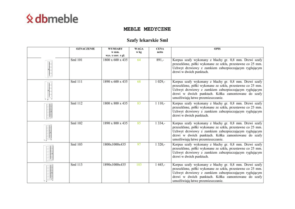 MEBLE MEDYCZNE Szafy lekarskie Sml OZNACZENIE WYMIARY w mm. wys. x szer. x gł. WAGA w kg CENA netto OPIS Sml 101 1800 x 600 x 435 64 891,- Korpus szafy wykonany z blachy gr. 0,8 mm. Drzwi szafy przeszklone, półki wykonane ze szkła, przestawne co 25 mm. Uchwyt drzwiowy z zamkiem zabezpieczającym ryglującym drzwi w dwóch punktach. Sml 111 1890 x 600 x 435 68 1 029,- Korpus szafy wykonany z blachy gr. 0,8 mm. Drzwi szafy przeszklone, półki wykonane ze szkła, przestawne co 25 mm. Uchwyt drzwiowy z zamkiem zabezpieczającym ryglującym drzwi w dwóch punktach. Kółka zamontowane do szafy umożliwiają łatwe przemieszczanie. Sml 112 1800 x 800 x 435 83 1 110,- Korpus szafy wykonany z blachy gr. 0,8 mm. Drzwi szafy przeszklone, półki wykonane ze szkła, przestawne co 25 mm. Uchwyt drzwiowy z zamkiem zabezpieczającym ryglującym drzwi w dwóch punktach. Sml 102 1890 x 800 x 435 85 1 334,- Sml 103 1800x1000x435 97 1 320,- Korpus szafy wykonany z blachy gr. 0,8 mm. Drzwi szafy przeszklone, półki wykonane ze szkła, przestawne co 25 mm. Uchwyt drzwiowy z zamkiem zabezpieczającym ryglującym drzwi w dwóch punktach. Kółka zamontowane do szafy umożliwiają łatwe przemieszczanie. Korpus szafy wykonany z blachy gr. 0,8 mm. Drzwi szafy przeszklone, półki wykonane ze szkła, przestawne co 25 mm. Uchwyt drzwiowy z zamkiem zabezpieczającym ryglującym drzwi w dwóch punktach. Sml 113 1890x1000x435 103 1 445,- Korpus szafy wykonany z blachy gr. 0,8 mm. Drzwi szafy przeszklone, półki wykonane ze szkła, przestawne co 25 mm. Uchwyt drzwiowy z zamkiem zabezpieczającym ryglującym drzwi w dwóch punktach. Kółka zamontowane do szafy umożliwiają łatwe przemieszczanie. Sml 114 1800 x 800 x 435 75 1 084,- Korpus szafy wykonany z blachy gr. 0,8 mm. Drzwi szafy przeszklone, półki wykonane ze szkła, przestawne co 25 mm. Uchwyt drzwiowy z zamkiem zabezpieczającym ryglującym drzwi w dwóch punktach. Dolna półka zabudowana - drzwi wykonane z blachy. Sml 104 1890 x 800 x 435 82 1 308,- Sml 115 1800 x 800 x 435 100 1 197,- Korpus szafy wykonany z blachy gr. 0,8 mm. Drzwi szafy przeszklone, półki wykonane ze szkła, przestawne co 25 mm. Uchwyt drzwiowy z zamkiem zabezpieczającym ryglującym drzwi w dwóch punktach. Dolna półka zabudowana - drzwi wykonane z blachy. Kółka zamontowane do szafy umożliwiają łatwe przemieszczanie. Korpus szafy wykonany z blachy gr. 0,8 mm. Drzwi szafy oraz ściany przeszklone, półki wykonane ze szkła, przestawne co 25 mm. Uchwyt drzwiowy z zamkiem zabezpieczającym ryglującym drzwi w dwóch punktach. Sml 105 1890 x 800 x 435 104 1 426,- Korpus szafy wykonany z blachy gr. 0,8 mm. Drzwi szafy oraz ściany przeszklone, półki wykonane ze szkła, przestawne co 25 mm. Uchwyt drzwiowy z zamkiem zabezpieczającym ryglującym drzwi w dwóch punktach. Kółka zamontowane do szafy umożliwiają łatwe przemieszczanie. Podstawa 150 x 600 x 434 150 x 800 x 434 150 x 1000 x 434 5 6 7 113,128,141,- Podstawa – nogi do szaf Sml wykonana z kształtownika zamkniętego czworokątnego. Podnosi szafy o 150 mm. Nogi wyposażone w stopki z tworzywa, nie niszczące podłogi. Bim 212s 740-770 x 1200 x 600 68 917,- Biurko lekarskie. Kontenerek biurka zbudowany z dwóch szuflad dostosowanych do formatów na karty chorób pacjentów. Biurka Bim OZNACZENIE WYMIARY w mm. wys. x szer. x gł. WAGA w kg CENA netto OPIS Bim 021 lx Bim 031 lx 740 x 1400 x 800 740 x 1600 x 800 68 73 1.121,1.133,- Biurko wyposażone w jeden kontenerek z trzema szufladami. Stelaż biurka wykonany ze stalowych profili zamkniętych o przekroju czworokątnym za stopkami wyrównującymi wysokość. Blat grubości 25 mm z powłoką z melaminy. Dostarczane w elementach. Bim 221 Bim 231 740 x 1400 x 800 740 x 1600 x 800 78 83 1.203,1.217,- Biurko wyposażone w jeden kontenerek z trzema szufladami. Nogi biurka w kształcie litery „L”. Stelaż biurka wykonany ze stalowych profili zamkniętych o przekroju czworokątnym za stopkami wyrównującymi wysokość. Blat grubości 25 mm z powłoką z melaminy. Dostarczane w elementach. Bim 022 lx Bim 032 lx 740 x 1400 x 800 740 x 1600 x 800 68 73 1.070,1.082,- Biurko wyposażone w jeden kontenerek z dwiema szufladami (jedna z szuflad przystosowana do teczek zawieszkowych formatu A4). Stelaż biurka wykonany ze stalowych profili zamkniętych o przekroju czworokątnym za stopkami wyrównującymi wysokość. Blat grubości 25 mm z powłoką z melaminy. Dostarczane w elementach. Bim 222 Bim 232 740 x 1400 x 800 740 x 1600 x 800 78 83 1.203,1.217,- Biurko wyposażone w jeden kontenerek z dwiema szufladami (jedna z szuflad przystosowana do teczek zawieszkowych formatu A4). Noga biurka w kształcie litery „L”. Stelaż biurka wykonany ze stalowych profili zamkniętych o przekroju czworokątnym za stopkami wyrównującymi wysokość. Blat grubości 25 mm z powłoką z melaminy. Dostarczane w elementach. Bim 051 lx 740 x 1600 x 800 98 1.625,- Biurko wyposażone w dwa kontenerki z trzema szufladami w każdym. Stelaż biurka wykonany ze stalowych profili zamkniętych o przekroju czworokątnym za stopkami wyrównującymi wysokość. Blat grubości 25 mm z powłoką z melaminy. Dostarczane w elementach. Bim 251 740 x 1600 x 800 108 1.759,- Biurko wyposażone w dwa kontenerki z trzema szufladami w każdym. Noga biurka w kształcie litery „L”. Stelaż biurka wykonany ze stalowych profili zamkniętych o przekroju czworokątnym za stopkami wyrównującymi wysokość. Blat grubości 25 mm z powłoką z melaminy. Dostarczane w elementach. Bim 052 lx 740 x 1600 x 800 98 1.548,- Biurko wyposażone w dwa kontenerki z dwiema szufladami w każdym. Jedna z szuflad w każdym kontenerku przystosowana do teczek zawieszkowych formatu A4. Stelaż biurka wykonany ze stalowych profili zamkniętych o przekroju czworokątnym za stopkami wyrównującymi wysokość. Blat grubości 25 mm z powłoką z melaminy. Dostarczane w elementach. Bim 252 740 x 1600 x 800 108 1.759,- Biurko wyposa