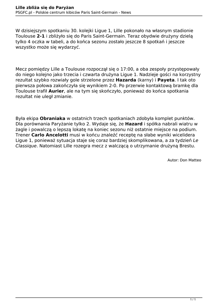 Lille zbliża się do Paryżan PSGFC.pl - Polskie centrum kibiców Paris Saint-Germain - News W dzisiejszym spotkaniu 30. kolejki Ligue 1, Lille pokonało na własnym stadionie Toulouse 2-1 i zbliżyło się do Paris Saint-Germain. Teraz obydwie drużyny dzielą tylko 4 oczka w tabeli, a do końca sezonu zostało jeszcze 8 spotkań i jeszcze wszystko może się wydarzyć. Mecz pomiędzy Lille a Toulouse rozpoczął się o 17:00, a oba zespoły przystępowały do niego kolejno jako trzecia i czwarta drużyna Ligue 1. Nadzieje gości na korzystny rezultat szybko rozwiały gole strzelone przez Hazarda (karny) i Payeta. I tak oto pierwsza połowa zakończyła się wynikiem 2-0. Po przerwie kontaktową bramkę dla Toulouse trafił Aurier, ale na tym się skończyło, ponieważ do końca spotkania rezultat nie uległ zmianie. Była ekipa Obraniaka w ostatnich trzech spotkaniach zdobyła komplet punktów. Dla porównania Paryżanie tylko 2. Wydaje się, że Hazard i spółka nabrali wiatru w żagle i powalczą o lepszą lokatę na koniec sezonu niż ostatnie miejsce na podium. Trener Carlo Ancelotti musi w końcu znaleźć receptę na słabe wyniki wicelidera Ligue 1, ponieważ sytuacja staje się coraz bardziej skomplikowana, a za tydzień Le Classique. Natomiast Lille rozegra mecz z walczącą o utrzymanie drużyną Brestu. Autor: Don Matteo 1/1 Powered by TCPDF (www.tcpdf.org)