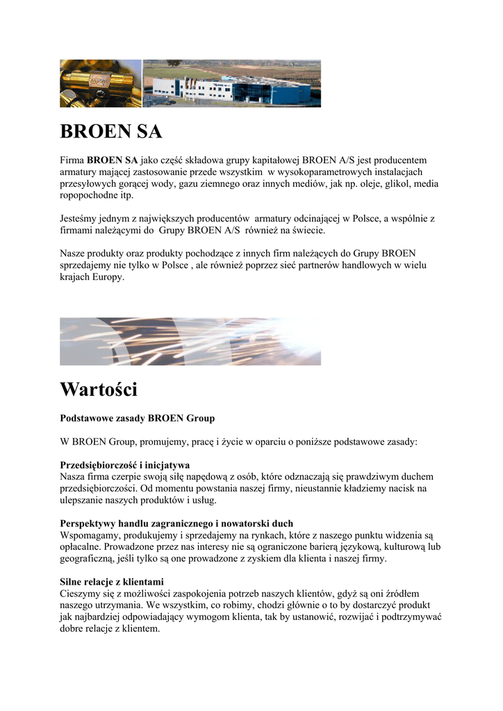 BROEN SA Firma BROEN SA jako część składowa grupy kapitałowej BROEN A/S jest producentem armatury mającej zastosowanie przede wszystkim w wysokoparametrowych instalacjach przesyłowych gorącej wody, gazu ziemnego oraz innych mediów, jak np. oleje, glikol, media ropopochodne itp. Jesteśmy jednym z największych producentów armatury odcinającej w Polsce, a wspólnie z firmami należącymi do Grupy BROEN A/S również na świecie. Nasze produkty oraz produkty pochodzące z innych firm należących do Grupy BROEN sprzedajemy nie tylko w Polsce , ale również poprzez sieć partnerów handlowych w wielu krajach Europy. Wartości Podstawowe zasady BROEN Group W BROEN Group, promujemy, pracę i życie w oparciu o poniższe podstawowe zasady: Przedsiębiorczość i inicjatywa Nasza firma czerpie swoją siłę napędową z osób, które odznaczają się prawdziwym duchem przedsiębiorczości. Od momentu powstania naszej firmy, nieustannie kładziemy nacisk na ulepszanie naszych produktów i usług. Perspektywy handlu zagranicznego i nowatorski duch Wspomagamy, produkujemy i sprzedajemy na rynkach, które z naszego punktu widzenia są opłacalne. Prowadzone przez nas interesy nie są ograniczone barierą językową, kulturową lub geograficzną, jeśli tylko są one prowadzone z zyskiem dla klienta i naszej firmy. Silne relacje z klientami Cieszymy się z możliwości zaspokojenia potrzeb naszych klientów, gdyż są oni źródłem naszego utrzymania. We wszystkim, co robimy, chodzi głównie o to by dostarczyć produkt jak najbardziej odpowiadający wymogom klienta, tak by ustanowić, rozwijać i podtrzymywać dobre relacje z klientem. Bezpośredniość relacji interpersonalnych w obrębie firmy Mocno wierzymy, iż bezpośredniość relacji interpersonalnych w obrębie firmy daje pozytywne efekty w postaci oddania i zaangażowania jej pracowników. Niezależność osobista - w połączeniu z odpowiedzialnością, inicjatywą i prawdziwym oddaniem - jest jedną z głównych podstaw naszego sukcesu. Historia firmy Początki firmy sięgają roku 1993, kiedy wchodzący w skład Dolnośląskiego Zakładu Termoenergetycznego S.A. w Wałbrzychu Zakład Obróbki Mechanicznej „DZT-Steel „ rozpoczął w zakładzie w Bystrzycy Górnej k/Świdnicy produkcję zaworów kulowych w zakresie średnic DN15-DN100. W roku 1997 zawiązała się polsko-duńska spółka kapitałowa, której udziałowcami zostali Dolnośląski Zakład Termoenergetyczny S.A. z Wałbrzycha i BROEN A/S z Assens w Danii. Nowa spółka , już pod nazwą BROEN-DZT S.A. przeniosła swoją siedzibę do Dzierżoniowa rozszerzając swój program produkcji do zaworów o średnicy 400mm. Kolejnym etapem w dynamicznym rozwoju firmy stało się przeniesienie w grudniu 2001 siedziby firmy do nowo wybudowanego zakładu na teren Wałbrzyskiej Specjalnej Strefy Ekonomicznej , podstrefa Dzierżoniów. W chwili obecnej BROEN SA, której jedynym akcjonariuszem jest BROEN A/S z Assens w Danii mieści się w Dzierżoniowie przy ul. Pieszyckiej 10 (województwo dolnośląskie) 1948 - Poul Broen zakłada własną firmę 1950 - Wprowadzenie na rynek zaworów kulowych BALLOFIX 1960 - Wprowadzenie na rynek osprzętu BROEN BOSS Lab. 1974 - BROEN Valves Ltd., U.K 1985 - Wprowadzenie na rynek zaworów kulowych BALLOMAX 1986 - do tego roku BROEN była firmą rodzinną 1993 - BROEN zostaje przejęty Aalberts Industries N.V. 1994 - BROEN Singapore Pte. Ltd., Singapur 1994 - efka-GAM, Niemcy 1997 - BROEN Malaysia Sdn. Bhd., Malezja 1997 - BROEN-DZT, Polska 1997 - BROEN INC., USA 1998 - Clorius Controls A/S, Dania 1999 - Brownall Laptab, Wielka Brytania 2002 - BROEN-ADL, Rosja 2003 - BROEN Rep. Office, Chiny 2004 - Clorius Controls A/S, Chiny Kontakt BROEN SA. ul. Pieszycka 10 58-200 Dzierżoniow, tel. (0 74) 832 54 00 fax (0 74) 832 19 20 www.broen.pl