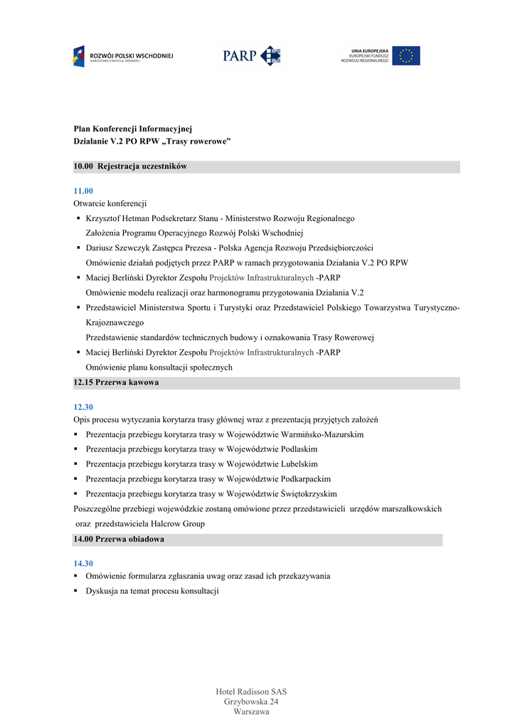Plan Konferencji Informacyjnej Działanie V.2 PO RPW „Trasy rowerowe” 10.00 Rejestracja uczestników 11.00 Otwarcie konferencji Krzysztof Hetman Podsekretarz Stanu - Ministerstwo Rozwoju Regionalnego ZałoŜenia Programu Operacyjnego Rozwój Polski Wschodniej Dariusz Szewczyk Zastępca Prezesa - Polska Agencja Rozwoju Przedsiębiorczości Omówienie działań podjętych przez PARP w ramach przygotowania Działania V.2 PO RPW Maciej Berliński Dyrektor Zespołu Projektów Infrastrukturalnych -PARP Omówienie modelu realizacji oraz harmonogramu przygotowania Działania V.2 Przedstawiciel Ministerstwa Sportu i Turystyki oraz Przedstawiciel Polskiego Towarzystwa TurystycznoKrajoznawczego Przedstawienie standardów technicznych budowy i oznakowania Trasy Rowerowej Maciej Berliński Dyrektor Zespołu Projektów Infrastrukturalnych -PARP Omówienie planu konsultacji społecznych 12.15 Przerwa kawowa 12.30 Opis procesu wytyczania korytarza trasy głównej wraz z prezentacją przyjętych załoŜeń Prezentacja przebiegu korytarza trasy w Województwie Warmińsko-Mazurskim Prezentacja przebiegu korytarza trasy w Województwie Podlaskim Prezentacja przebiegu korytarza trasy w Województwie Lubelskim Prezentacja przebiegu korytarza trasy w Województwie Podkarpackim Prezentacja przebiegu korytarza trasy w Województwie Świętokrzyskim Poszczególne przebiegi wojewódzkie zostaną omówione przez przedstawicieli urzędów marszałkowskich oraz przedstawiciela Halcrow Group 14.00 Przerwa obiadowa 14.30 Omówienie formularza zgłaszania uwag oraz zasad ich przekazywania Dyskusja na temat procesu konsultacji Hotel Radisson SAS Grzybowska 24 Warszawa