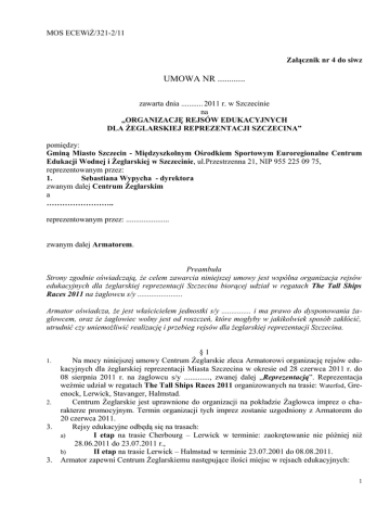 MOS ECEWiŻ/321-2/11 Załącznik nr 4 do siwz UMOWA NR ............ zawarta dnia ........... 2011 r. w Szczecinie na „ORGANIZACJĘ REJSÓW EDUKACYJNYCH DLA ŻEGLARSKIEJ REPREZENTACJI SZCZECINA” pomiędzy: Gminą Miasto Szczecin - Międzyszkolnym Ośrodkiem Sportowym Euroregionalne Centrum Edukacji Wodnej i Żeglarskiej w Szczecinie, ul.Przestrzenna 21, NIP 955 225 09 75, reprezentowanym przez: 1. Sebastiana Wypycha - dyrektora zwanym dalej Centrum Żeglarskim a …………………….. reprezentowanym przez: ...................... zwanym dalej Armatorem. Preambuła Strony zgodnie oświadczają, że celem zawarcia niniejszej umowy jest wspólna organizacja rejsów edukacyjnych dla żeglarskiej reprezentacji Szczecina biorącej udział w regatach The Tall Ships Races 2011 na żaglowcu s/y ....................... Armator oświadcza, że jest właścicielem jednostki s/y ............... i ma prawo do dysponowania żaglowcem, oraz że żaglowiec wolny jest od roszczeń, które mogłyby w jakikolwiek sposób zakłócić, utrudnić czy uniemożliwić realizację i przebieg rejsów dla żeglarskiej reprezentacji Szczecina. 1. 2. 3. 3. §1 Na mocy niniejszej umowy Centrum Żeglarskie zleca Armatorowi organizację rejsów edukacyjnych dla żeglarskiej reprezentacji Miasta Szczecina w okresie od 28 czerwca 2011 r. do 08 sierpnia 2011 r. na żaglowcu s/y ............., zwanej dalej „Reprezentacją”. Reprezentacja weźmie udział w regatach The Tall Ships Races 2011 organizowanych na trasie: Waterfod, Greenock, Lerwick, Stavanger, Halmstad. Centrum Żeglarskie jest uprawnione do organizacji na pokładzie Żaglowca imprez o charakterze promocyjnym. Termin organizacji tych imprez zostanie uzgodniony z Armatorem do 20 czerwca 2011. Rejsy edukacyjne odbędą się na trasach: a) I etap na trasie Cherbourg – Lerwick w terminie: zaokrętowanie nie później niż 28.06.2011 do 23.07.2011 r., b) II etap na trasie Lerwick – Halmstad w terminie 23.07.2001 do 08.08.2011. Armator zapewni Centrum Żeglarskiemu następujące ilości miejsc w rejsach edukacyjnych: 1 MOS ECEWiŻ/321-2/11 I etap na trasie: Cherbourg - Lerwick ......... miejsc dla załogi + 2 osobowa kabina armatorska b) II etap na trasie: Lerwick – Halmstad ........ miejsc dla załogi + 2 osobowa kabina armatorska Nabór członków Reprezentacji na poszczególne etapy rejsów przeprowadzi Centrum Żeglarskie we własnym zakresie według ustalonych przez siebie kryteriów, w terminie do dnia 15 kwietnia 2010 r., z zastrzeżeniem, że co najmniej połowę członków Reprezentacji stanowić będą osoby w wieku 16-25 lat. Centrum Żeglarskie zawrze z kandydatem do Reprezentacji, posiadającym umiejętność pływania oraz zaświadczenie lekarskie o braku przeciwwskazań do odbycia rejsu na żaglowcu rejowym, umowę, w której zobowiąże kandydata, do uczestniczenia we wszystkich pracach wynikających z potrzeb eksploatacyjno - nawigacyjnych STATKU Centrum Żeglarskie zobowiąże kandydata do Reprezentacji, w umowie, o której mowa w ust. 5 do przestrzegania regulaminu obowiązującego na żaglowcu s/y ..............., który Armator przekaże Centrum Żeglarskiemu w terminie 14 od dnia zawarcia umowy. Centrum Żeglarskie przekaże Armatorowi listę członków Reprezentacji najpóźniej do dnia 15 maja 2011 r. Centrum Żeglarskie zastrzega sobie prawo zmiany listy członków Reprezentacji, jednak nie później niż do dnia 15 czerwca 2011 r. a) 4. 5. 6. 7. 8. §2 1. Wartość przedmiotu umowy, określono na kwotę brutto ............. PLN (słownie: złotych). 2. Płatność wynagrodzenia nastąpi w terminie 14 dni od daty dostarczenia przez Armatora prawidłowo wystawionej faktury VAT, przelewem bankowym na rachunek bankowy Armatora ............................................................................. w sposób następujący: 1) wpłata I raty w wysokości 40% kwoty brutto, o której mowa w ust.2, co stanowi kwotę ..................... PLN (słownie: złotych ) do dnia 15 kwietnia 2011 r. w przypadku Żaglowca sprawnego technicznie i gotowego do żeglugi w dniu podpisania umowy albo do 10 czerwca 2011 w przypadku Żaglowca niesprawnego technicznie i nie gotowego do żeglugi w dniu podpisania umowy, pod warunkiem, że Żaglowiec do 14 maja 2011 r. będzie sprawny technicznie i gotowy do żeglugi. 2) wpłata II raty w wysokości 20% kwoty brutto, o której mowa w ust.1, co stanowi kwotę ................. PLN (słownie: tysięcy złotych), nastąpi po zakończeniu I etapu rejsu, 3) wpłata III raty w wysokości 40 % kwoty brutto, o której mowa w ust. 1, co stanowi kwotę ....................... PLN (słownie: tysięcy złotych), nastąpi po zakończeniu II etapu rejsu. 3. W dniu podpisania umowy Armator złoży pisemne oświadczenie o sprawności technicznej Żaglowca oraz jego gotowości do żeglugi, które będzie podstawą otrzymania zaliczki. 1. 2. §3 Armator ponosi pełną odpowiedzialność za wykonanie przedmiotu umowy, łącznie z odpowiedzialnością za szkody powstałe w wyniku realizowania niniejszej umowy. Armator zapewnia, że: 1) żaglowiec zostanie zgłoszony do udziału w regatach The Tall Ships Races 2011 odbywających się w okresie od 30 czerwca 2011 r. do 08 sierpnia 2011 roku na Morzu Północnym – Armator pokrywa koszty udziału jednostki w regatach, 2) w skład załogi żaglowca uczestniczącej w regatach The Tall Ships Races 2011, wchodzić będą członkowie Reprezentacji w ilości wynikającej z § 1 ust. 3. 3) w ramach wynagrodzenia, o którym mowa w § 2 ust. 1 i 2 każdy członek Reprezentacji będzie miał zapewnione: a) zaokrętowanie (kojowe), 2 MOS ECEWiŻ/321-2/11 b) wyżywienie (3 posiłki dziennie + całodobowy dostęp do kawy i herbaty bez ograniczeń), c) udział w imprezach odbywających się w trakcie regat The Tall Ships Races 2011, d) szkolenie żeglarskie prowadzone pod okiem doświadczonych instruktorów, e) opiekę medyczną (obecność lekarza na pokładzie w czasie trwania obu eta