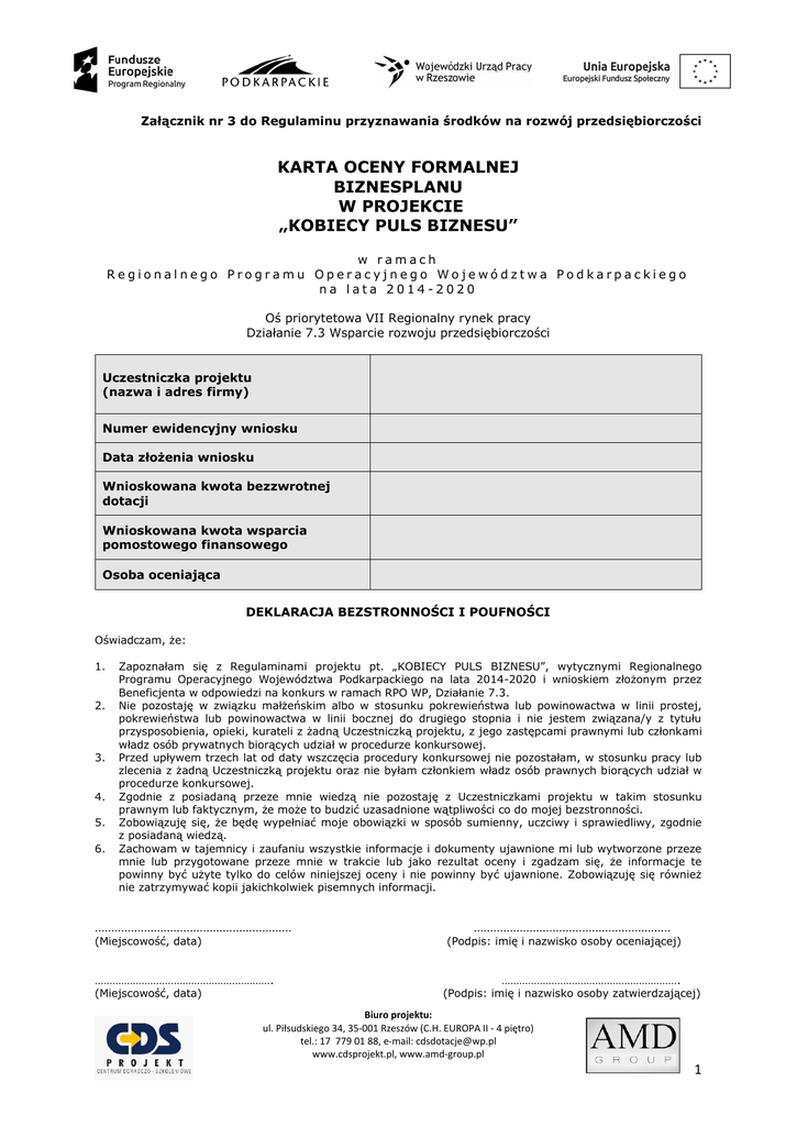 Załącznik nr 3 do Regulaminu przyznawania środków na rozwój przedsiębiorczości KARTA OCENY FORMALNEJ BIZNESPLANU W PROJEKCIE „KOBIECY PULS BIZNESU” w ramach Regionalnego Programu Operacyjnego Województwa Podkarpackiego na lata 2014-2020 Oś priorytetowa VII Regionalny rynek pracy Działanie 7.3 Wsparcie rozwoju przedsiębiorczości Uczestniczka projektu (nazwa i adres firmy) Numer ewidencyjny wniosku Data złożenia wniosku Wnioskowana kwota bezzwrotnej dotacji Wnioskowana kwota wsparcia pomostowego finansowego Osoba oceniająca DEKLARACJA BEZSTRONNOŚCI I POUFNOŚCI Oświadczam, że: 1. 2. 3. 4. 5. 6. Zapoznałam się z Regulaminami projektu pt. „KOBIECY PULS BIZNESU”, wytycznymi Regionalnego Programu Operacyjnego Województwa Podkarpackiego na lata 2014-2020 i wnioskiem złożonym przez Beneficjenta w odpowiedzi na konkurs w ramach RPO WP, Działanie 7.3. Nie pozostaję w związku małżeńskim albo w stosunku pokrewieństwa lub powinowactwa w linii prostej, pokrewieństwa lub powinowactwa w linii bocznej do drugiego stopnia i nie jestem związana/y z tytułu przysposobienia, opieki, kurateli z żadną Uczestniczką projektu, z jego zastępcami prawnymi lub członkami władz osób prywatnych biorących udział w procedurze konkursowej. Przed upływem trzech lat od daty wszczęcia procedury konkursowej nie pozostałam, w stosunku pracy lub zlecenia z żadną Uczestniczką projektu oraz nie byłam członkiem władz osób prawnych biorących udział w procedurze konkursowej. Zgodnie z posiadaną przeze mnie wiedzą nie pozostaję z Uczestniczkami projektu w takim stosunku prawnym lub faktycznym, że może to budzić uzasadnione wątpliwości co do mojej bezstronności. Zobowiązuję się, że będę wypełniać moje obowiązki w sposób sumienny, uczciwy i sprawiedliwy, zgodnie z posiadaną wiedzą. Zachowam w tajemnicy i zaufaniu wszystkie informacje i dokumenty ujawnione mi lub wytworzone przeze mnie lub przygotowane przeze mnie w trakcie lub jako rezultat oceny i zgadzam się, że informacje te powinny być użyte tylko do celów niniejszej oceny i nie powinny być ujawnione. Zobowiązuję się również nie zatrzymywać kopii jakichkolwiek pisemnych informacji. …………………………………………………… (Miejscowość, data) …………………………………………………… (Podpis: imię i nazwisko osoby oceniającej) ……………………………………………………. (Miejscowość, data) ……………………………………………………. (Podpis: imię i nazwisko osoby zatwierdzającej) Biuro projektu: ul. Piłsudskiego 34, 35-001 Rzeszów (C.H. EUROPA II - 4 piętro) tel.: 17 779 01 88, e-mail: [email protected] www.cdsprojekt.pl, www.amd-group.pl 1 Lp. KRYTERIA Tak / Nie / Nie dotyczy UWAGI I. KRYTERIA OGÓLNE 1. 2. 3. 4. 1. 2. 3. 4. 5. 6. Dokumenty zostały złożone w wyznaczonym terminie Określona w biznesplanie działalność jest zgodna z przedstawioną w Dokumentach Rekrutacyjnych Kwota wnioskowanego wsparcia mieści się w limitach określonych w Regulaminie przyznania środków finansowych na rozwój przedsiębiorczości. Okres finansowania zawiera się w okresie realizacji projektu „KOBIECY PULS BIZNESU” II. KOMPLETNOŚĆ WNIOSKU WRAZ Z BIZNESPLANEM Dokumenty są wypełnione elektronicznie, w jęz. polskim Wszystkie wymagane rubryki (pola) są wypełnione Dokumenty są przedłożone w dwóch egzemplarzach (oryginał i kopia potwierdzona za zgodność z oryginałem lub dwa oryginały) Załączono dokument cyfrowy biznesplanu Oryginały dokumentów są podpisane przez uprawnioną osobę i parafowany na każdej stronie. Uczestniczka Projektu podpisała wszystkie wymagane oświadczenia. III. KOMPLETNOŚĆ ZAŁĄCZNIKÓW 1. a) b) c) d) e) Oryginał i kopia wniosku wymagane załączniki: zawierają wszystkie Biznes Plan zgodny z obowiązującym wzorem: - jest złożony w 2 egzemplarzach - trwale spięty (w skoroszyt z dziurkami), - kopia jest potwierdzona za zgodność oryginałem - jest podpisany przez osobę uprawnioną oraz parafowany na każdej stronie - ma ponumerowane strony - ma wypełnione wszystkie wymagane pola - nie zawiera kardynalnych błędów (błędne podstawowe obliczenia matematyczne) - inne (wymienić jakie).................................. z Harmonogram finansowo-rzeczowy Formularz informacji przedstawianych przy ubieganiu się o pomoc de minimis (zgodnie z załącznikiem do Rozporządzenia Rady Ministrów z dnia 24 października 2014 r. poz. 1543). Kopia zaświadczeń o wysokości otrzymanej pomocy de minimis w roku podatkowym, w którym Uczestniczka projektu przystępuje do projektu oraz w poprzedzających go dwóch latach podatkowym wystawionych przez podmioty udzielające pomocy jest złożone w 2 egzemplarzach. Kopia potwierdzona jest za zgodność z oryginałem jeżeli dotyczy Potwierdzenie udziału w podstawowych usługach szkoleniowo – doradczych: Biuro projektu: ul. Piłsudskiego 34, 35-001 Rzeszów (C.H. EUROPA II - 4 piętro) tel.: 17 779 01 88, e-mail: [email protected] www.cdsprojekt.pl, www.amd-group.pl 2 WYNIK OCENY W związku ze spełnieniem nie spełnieniem przez Uczestniczkę Projektu warunków formalnych: rekomenduję wniosek do oceny merytorycznej nie rekomenduję wniosku do oceny merytorycznej. wniosek skierowany regulaminowo do poprawy formalnej dnia ………………………………………………… wniosek odrzucony po dokonaniu przysługującej poprawy formalnej wniosek rekomendowany do oceny merytorycznej po dokonaniu przysługującej poprawy formalnej Rzeszów, dnia _____________ _______________________ Podpis osoby oceniającej Zaakceptowano wniosek, dnia _____________________________________ (Imię i nazwisko) Podpis osoby zatwierdzającej Biuro projektu: ul. Piłsudskiego 34, 35-001 Rzeszów (C.H. EUROPA II - 4 piętro) tel.: 17 779 01 88, e-mail: [email protected] www.cdsprojekt.pl, www.amd-group.pl 3