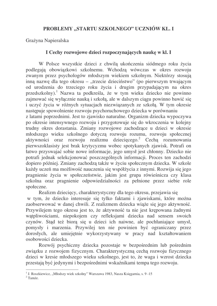 PROBLEMY „STARTU SZKOLNEGO” UCZNIÓW KL. I Gra yna Napieralska I Cechy rozwojowe dzieci rozpoczynaj cych nauk w kl. I W Polsce wszystkie dzieci z chwil uko czenia siódmego roku ycia podlegaj obowi zkowi szkolnemu. Wchodz wówczas w okres rozwoju zwanym przez psychologów młodszym wiekiem szkolnym. Niektórzy stosuj inn nazw dla tego okresu – „trzecie dzieci stwo” (po pierwszym trwaj cym od urodzenia do trzeciego roku ycia i drugim przypadaj cym na okres przedszkolny).1 Nazwa ta podkre la, e w tym wieku dziecko nie powinno zajmowa si wył cznie nauk i szkoł , ale w dalszym ci gu powinno bawi si i uczy ycia w ró nych sytuacjach niezwi zanych ze szkoł . W tym okresie nast puje spowolnienie rozwoju psychoruchowego dziecka w porównaniu z latami poprzednimi. Jest to zjawisko naturalne. Organizm dziecka wypoczywa po okresie intensywnego rozwoju i przygotowuje si do wkroczenia w kolejny trudny okres dorastania. Zmiany rozwojowe zachodz ce u dzieci w okresie młodszego wieku szkolnego dotycz rozwoju rozumu, rozwoju społecznej aktywno ci oraz rozwoju realizmu dzieci cego.2 Cech rozumowania pierwszoklasisty jest brak krytycyzmu wobec spotykanych zjawisk. Potrafi on łatwo przyswaja sobie nowe informacje, jego umysł jest chłonny. Dziecko nie potrafi jednak selekcjonowa poszczególnych informacji. Proces ten zachodzi dopiero pó niej. Zmiany zachodz tak e w yciu społecznym dziecka. W szkole ka dy ucze ma mo liwo nauczenia si współ ycia z innymi. Rozwija si jego pragnienie ycia w społecze stwie, jakim jest grupa rówie nicza czy klasa szkolna oraz pragnienie odpowiedzialno ci za pełnione przez siebie role społeczne. Realizm dzieci cy, charakterystyczny dla tego okresu, przejawia si w tym, e dziecko interesuje si tylko faktami i zjawiskami, które mo na zaobserwowa w danej chwili. Z realizmem dziecka wi e si jego aktywno . Przywilejem tego okresu jest to, e aktywno ta nie jest kr powana adnymi w tpliwo ciami, niepokojem czy refleksjami dziecka nad sensem swoich czynów. St d te bior si u dzieci ich naiwne, ale pochłaniaj ce umysł, pomysły i marzenia. Przywilej ten nie powinien by ograniczany przez dorosłych, ale umiej tnie wykorzystywany w pracy nad kształtowaniem osobowo ci dziecka. Rozwój psychiczny dziecka pozostaje w bezpo rednim lub po rednim zwi zku z rozwojem fizycznym. Charakterystyczn cech rozwoju fizycznego dzieci w kresie młodszego wieku szkolnego, jest to, e waga i wzrost dziecka przestaj by jedynymi i bezpo rednimi wska nikami tempa tego rozwoju. 1 2 J. Roszkiewicz, „Młodszy wiek szkolny” Warszawa 1983, Nasza Ksi garnia, s. 9 -15 Tam e. W tym okresie ycia najwa niejszy dla rozwoju fizycznego jest wzrost siły i odporno ci organizmu. Sił dziecko ch tnie popisuje si , sprawdza j w potyczkach z kolegami. Rozwój układu mi niowego powoduje, e ruchy dziecka s prawie takie, jak u człowieka dorosłego. Sprzyja to kształceniu nowych umiej tno ci ruchowych – pływania, majsterkowania, szycia. W okresie tym dziecko odczuwa wielk potrzeb ruchu i szuka jej zaspokojenia w ró nych akcjach ruchowych – w zabawach, w pracy.3 Powy ej przedstawiłam cechy typowe dla okresu młodszego wieku szkolnego. Ka de dziecko posiada jednak równie cechy indywidualne. Nauk szkoln rozpoczynaj dzieci o ró nym stopniu przygotowania do podj cia obowi zku szkolnego. W zwi zku z tym „start szkolny” tych dzieci i przebieg ich nauki b dzie ró ny. Wczesne wykrycie niepokoj cych przejawów zachowania umo liwi podj cie odpowiednich rodków zaradczych, przyspieszy dojrzewanie w grupie rówie niczej i umo liwi opanowanie wiedzy przewidzianej programem. Nale y wi c zwróci uwag czy dziecko orientuje si w swoim otoczeniu, prawidłowo wypowiada si , daje sobie rad z liczeniem, sprawnie posługuje si ołówkiem, potrafi skupi si podczas zabawy, nawi zuje kontakt z innymi lud mi, ch tnie bawi si z rówie nikami, podporz dkowuje si poleceniom dorosłych, dba o wygl d estetyczny swoich prac.4 II Co szkoła zmienia w yciu dziecka, czyli o wkraczaniu w nowe rodowisko Szkoła jest pierwsz w yciu dziecka instytucj , która narzuca mu pewne rygory. Klasa pierwsza jest „progiem” dla nowego okresu ycia. Próg ten dziecko mo e przekroczy swobodnie, ale mo e tak e na nim „potkn si ”, a nawet „bole nie potłuc”.5 Wiele czyni si , aby dzieci nie odczuły silnie ogromu obowi zków, z jakimi spotykaj si w szkole. Słu temu np. zaj cia w przedszkolu, czasopisma dzieci ce, ksi ki, edukacyjne programy telewizyjne, odpowiedni sposób post powania z dzie mi w pocz tkowym okresie nauki, lekcje o charakterze zabawowym, zaj cia poza murami szkoły. Mimo tych wszystkich zabiegów stwierdza si u dzieci l k przed szkoł , jako przed instytucj now . Najbardziej jest on widoczny w pierwszych dniach nauki. L k ten objawia si w ró ny sposób, a najcz ciej płaczem. Ust pienie l ku zale ne jest od stopnia jego nasilenia. Rozpocz cie nauki wi e si z szeregiem zmian w yciu dziecka: - zmian rodowiska ycia - zmian trybu ycia - rozpocz cie przez dziecko uczenia si .6 3 Tam e, s. 15 – 21. M. Radwiłowiczowa, Z. Morawska, „Metodyka nauczania pocz tkowego”, WSiP, Warszawa 1990, s.49 – 50. 5 J. Roszkiewicz, op. cit., s.145 – 147. 6 H. Filipczuk, „Rodzice i dzieci w młodszym wieku szkolnym”, Warszawa 1985, Instytut Wydawniczy Nasza Ksi garnia, s. 58 – 63. 4 rodowisko szkolne jest inne od poprzednich, jakimi były dla dziecka rodzina i przedszkole. Jest ono nowe ze wzgl du na nowy budynek, jakim jest budynek szkolny z bardzo du liczb dzieci, du liczb oddziałów i odpowiednio przystosowan do nauki struktur wn trza. Jest to tak e rodowisko nowe w sensie społecznym. Dziecko spotyka w szkole wiele obcych osób o nastawieniu mniej opieku czym ni w przedszkolu czy w domu. Spotyka si z nowymi kolegami w klasie, w ród których musi znale sobie odpowiedni pozycj . Musi przystosowa si do zespołu klasowego, którego ycie płynie dwoma nurtami – jawnym, zorganizowanym, obj tym opiek nauczyciela i ukrytym
