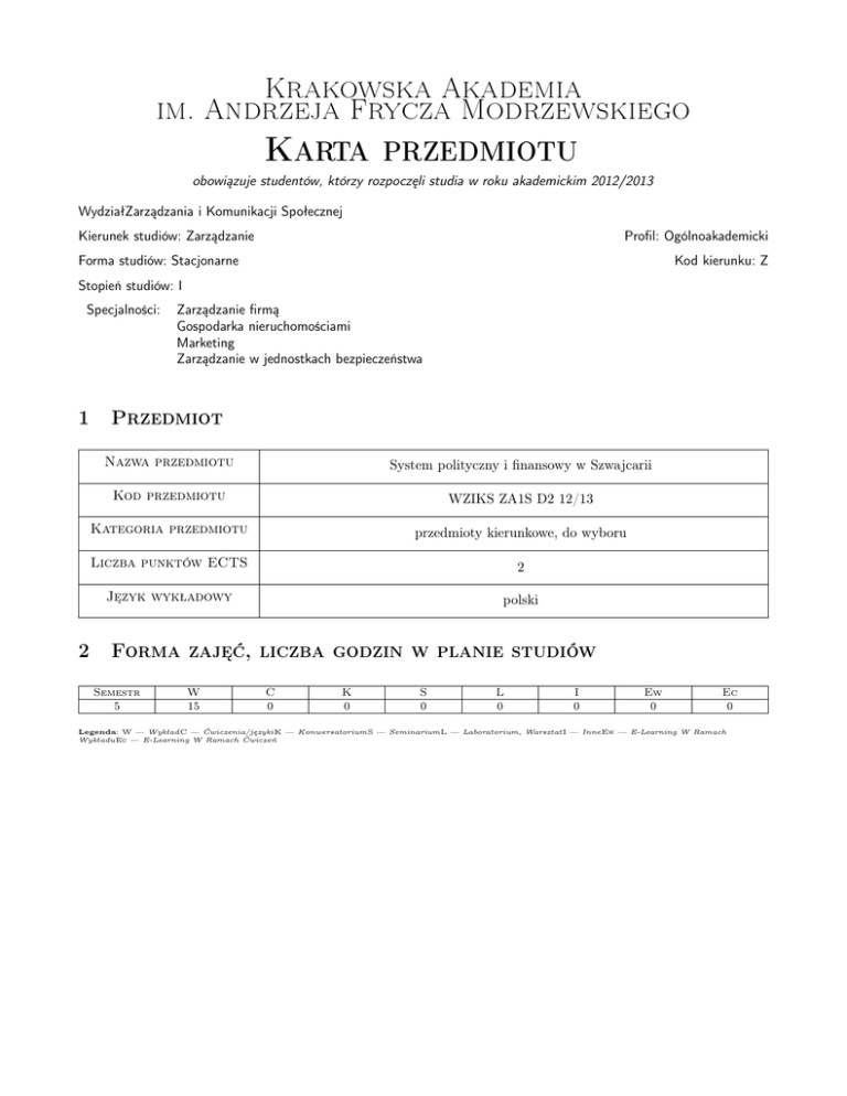 Krakowska Akademia im. Andrzeja Frycza Modrzewskiego Karta przedmiotu obowiązuje studentów, którzy rozpoczęli studia w roku akademickim 2012/2013 WydziałZarządzania i Komunikacji Społecznej Kierunek studiów: Zarządzanie Profil: Ogólnoakademicki Forma studiów: Stacjonarne Kod kierunku: Z Stopień studiów: I Specjalności: 1 2 Zarządzanie firmą Gospodarka nieruchomościami Marketing Zarządzanie w jednostkach bezpieczeństwa Przedmiot Nazwa przedmiotu System polityczny i finansowy w Szwajcarii Kod przedmiotu WZIKS ZA1S D2 12/13 Kategoria przedmiotu przedmioty kierunkowe, do wyboru Liczba punktów ECTS 2 Język wykładowy polski Forma zajęć, liczba godzin w planie studiów Semestr 5 W 15 C 0 K 0 S 0 L 0 I 0 Ew 0 Ec 0 Legenda: W — WykładC — Ćwiczenia/językiK — KonwersatoriumS — SeminariumL — Laboratorium, Warsztat I — InneEw — E-Learning W Ramach WykładuEc — E-Learning W Ramach Ćwiczeń Krakowska Akademia im. Andrzeja Frycza Modrzewskiego 3 Cele przedmiotu Cel 1 Zapoznanie studentów ze specyfiką systemu politycznego i finansowego Szwajcarii. Pokazanie elementów wzajemnego wpływu polityki i finansów. Wskazanie na elementy zarządzania projektami w sferze makroekonomicznej i politycznej. 4 Wymagania wstępne 1 brak 5 Modułowe efekty kształcenia MW1 Poznanie instytucji i mechanizmów politycznych i finansowych współczesnej Szwajcarii. Poznanie narzędzi zarządzania procesami społecznymi, gospodarczymi i finansowymi. MU2 Kształtowanie umiejętności zrozumienia i analizy działania oraz związków pomiędzy polityką a systemem gospodarczym i finansowym danego kraju. Umiejętność dostrzegania różnic w poszczególnych systemach politycznych i finansowych. MK3 Wyrobienie kompetencji w zakresie angażowania się w działania społeczne na szczeblu lokalnym, regionalnym i krajowym. Kompetencja w zakresie przedstawiania i inicjowania działań społecznych, ich oceny, współdziałania i kontrolowania. 6 Treści programowe Lp W1 W2 W3 W4 7 Wykład Tematyka zajęć Opis szczegółowy bloków tematycznych 1.Neutralnosc i system federalny Szwajcarii 1.1.Wieczysta neutralnosc panstwa szwajcarskiego 1.2.Federalny system konstytucyjny 1.3.System polityczny: egzekutywa i legislatywa 1.4.System partyjny i formula magiczna 2.System demokracji bezposredniej 2.1.Geneza demokracji bezposredniej w Szwajcarii 2.2.Inicjatywa ludowa i referendum 2.3.Partycypacja obywateli i kampanie przedreferendowe 2.4.Funkcjonalnosc i dysfunkcjonalnosc systemu demokracji bezposredniej 3.System finansowy Szwajcarii 3.1.Geneza i rola systemu finansowego w Szwajcarii 3.2.Struktura szwajcarskiego systemu finansowego 3.3.Czynniki stabilizujace szwajcarski system finansowy 3.4.Funkcje i zadania systemu finansowego w Szwajcarii 4.Szwajcarski Bank Narodowy (SBN) 4.1.Geneza, cele i obowiazki SBN 4.2.Strategia i instrumenty polityki pienieznej SBN 4.3.Podsumowanie - wady i zalety systemu Razem Metody dydaktyczne M16. Wykłady M4. Debata Strona 2/4 Liczba godzin 4 3 4 4 15 Krakowska Akademia im. Andrzeja Frycza Modrzewskiego 8 Obciążenie pracą studenta Średnia liczba godzin na zrealizowanie aktywności Forma aktywności Godziny kontaktowe z nauczycielem akademickim, w tym: Godziny wynikające z planu studiów 15 Konsultacje przedmiotowe 2 Egzaminy i zaliczenia w sesji 2 Godziny bez udziału nauczyciela akademickiego wynikające z nakładu pracy studenta, w tym: Przygotowanie się do zajęć, w tym studiowanie zalecanej literatury 21 Opracowanie wyników 0 Przygotowanie raportu, projektu, prezentacji, dyskusji 10 Sumaryczna liczba godzin dla przedmiotu wynikająca z 50 całego nakładu pracy studenta 2 Sumaryczna liczba punktów ECTS dla przedmiotu 9 Metody oceny Ocena podsumowująca P1. Egzamin pisemny Warunki zaliczenia przedmiotu 1 Obecność na zajęciach + egzamin pisemny (dodatkowo punktowana aktywność na zajęciach, udział w dyskusji)) Kryteria oceny Na ocenę 3 Na ocenę 3.5 Na ocenę 4 Na ocenę 4.5 Na ocenę 5 10 Obecność na wszystkich -1 zajęciach. 51-61% punktów z egzaminu pisemnego. Obecność na wszystkich -1 zajęciach. 62-71% punktów z egzaminu pisemnego. 1aktywność na zajęciach. Obecność na wszystkich zajęciach. 72-81% punktów z egzaminu pisemnego. 2 aktywności na zajęciach. Obecność na wszystkich zajęciach. 82-91% punktów z egzaminu pisemnego. 3 aktywności na zajęciach. Obecność na wszystkich zajęciach. 92-100% punktów z egzaminu pisemnego. 4 aktywności na zajęciach. Macierz realizacji przedmiotu Modułowe efekty kształcenia dla przedmiotu MW1 MU1 Odniesienie do efektów kierunkowych K_W01, K_W02, K_W03 K_U01, K_U04 Treści programowe Metody dydaktyczne Sposoby oceny W1, W2, W3, W4 M16 P1 W1, W2, W3, W4 M16, M4 P1 Strona 3/4 Krakowska Akademia im. Andrzeja Frycza Modrzewskiego Modułowe efekty kształcenia dla przedmiotu MK1 11 Odniesienie do efektów kierunkowych K_K01, K_K02, K_K03, K_K04, K_K05, K_K08, K_K11 Treści programowe Metody dydaktyczne Sposoby oceny W1, W2, W3 M16, M4 P1 Wykaz literatury Literatura podstawowa: [1] M. Matyja — Swiss Made. Jak funkcjonuje wielokulturowa Szwajcaria ?, Brzezia Łąka, 2010, Poligraf Literatura uzupełniająca: [1] M. Matyja — System polityczny Szwajcarii: federalizm i demokracja bezpośrednia, Lublin, 2009, Kultura i Historia, UMCS [wersja internetowa: http://www.kulturaihistoria.umcs.lublin.pl/archives/1484] 12 Informacje o nauczycielach akademickich Oboba odpowiedzialna za kartę prof. nadzw. dr hab. Dariusz Fatuła (kontakt: [email protected]) Oboby prowadzące przedmiot dr Mirosław Matyja (kontakt: [email protected]) Strona 4/4