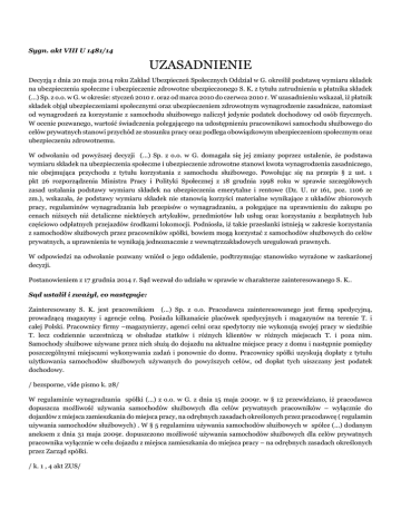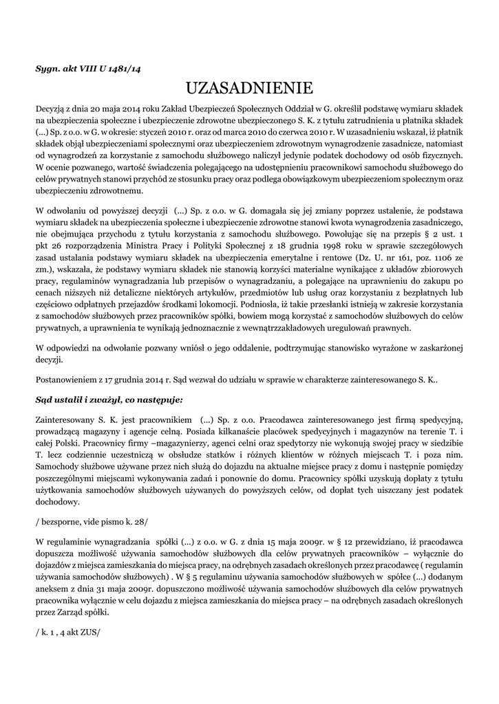Sygn. akt VIII U 1481/14 UZASADNIENIE Decyzją z dnia 20 maja 2014 roku Zakład Ubezpieczeń Społecznych Oddział w G. określił podstawę wymiaru składek na ubezpieczenia społeczne i ubezpieczenie zdrowotne ubezpieczonego S. K. z tytułu zatrudnienia u płatnika składek (...) Sp. z o.o. w G. w okresie: styczeń 2010 r. oraz od marca 2010 do czerwca 2010 r. W uzasadnieniu wskazał, iż płatnik składek objął ubezpieczeniami społecznymi oraz ubezpieczeniem zdrowotnym wynagrodzenie zasadnicze, natomiast od wynagrodzeń za korzystanie z samochodu służbowego naliczył jedynie podatek dochodowy od osób fizycznych. W ocenie pozwanego, wartość świadczenia polegającego na udostępnieniu pracownikowi samochodu służbowego do celów prywatnych stanowi przychód ze stosunku pracy oraz podlega obowiązkowym ubezpieczeniom społecznym oraz ubezpieczeniu zdrowotnemu. W odwołaniu od powyższej decyzji (...) Sp. z o.o. w G. domagała się jej zmiany poprzez ustalenie, że podstawa wymiaru składek na ubezpieczenia społeczne i ubezpieczenie zdrowotne stanowi kwota wynagrodzenia zasadniczego, nie obejmująca przychodu z tytułu korzystania z samochodu służbowego. Powołując się na przepis § 2 ust. 1 pkt 26 rozporządzenia Ministra Pracy i Polityki Społecznej z 18 grudnia 1998 roku w sprawie szczegółowych zasad ustalania podstawy wymiaru składek na ubezpieczenia emerytalne i rentowe (Dz. U. nr 161, poz. 1106 ze zm.), wskazała, że podstawy wymiaru składek nie stanowią korzyści materialne wynikające z układów zbiorowych pracy, regulaminów wynagradzania lub przepisów o wynagradzaniu, a polegające na uprawnieniu do zakupu po cenach niższych niż detaliczne niektórych artykułów, przedmiotów lub usług oraz korzystaniu z bezpłatnych lub częściowo odpłatnych przejazdów środkami lokomocji. Podniosła, iż takie przesłanki istnieją w zakresie korzystania z samochodów służbowych przez pracowników spółki, bowiem mogą korzystać z samochodów służbowych do celów prywatnych, a uprawnienia te wynikają jednoznacznie z wewnątrzzakładowych uregulowań prawnych. W odpowiedzi na odwołanie pozwany wniósł o jego oddalenie, podtrzymując stanowisko wyrażone w zaskarżonej decyzji. Postanowieniem z 17 grudnia 2014 r. Sąd wezwał do udziału w sprawie w charakterze zainteresowanego S. K.. Sąd ustalił i zważył, co następuje: Zainteresowany S. K. jest pracownikiem (...) Sp. z o.o. Pracodawca zainteresowanego jest firmą spedycyjną, prowadzącą magazyny i agencje celną. Posiada kilkanaście placówek spedycyjnych i magazynów na terenie T. i całej Polski. Pracownicy firmy –magazynierzy, agenci celni oraz spedytorzy nie wykonują swojej pracy w siedzibie T. lecz codziennie uczestniczą w obsłudze statków i różnych klientów w różnych miejscach T. i poza nim. Samochody służbowe używane przez nich służą do dojazdu na aktualne miejsce pracy z domu i następnie pomiędzy poszczególnymi miejscami wykonywania zadań i ponownie do domu. Pracownicy spółki uzyskują dopłaty z tytułu użytkowania samochodów służbowych używanych do powyższych celów, od dopłat tych uiszczany jest podatek dochodowy. / bezsporne, vide pismo k. 28/ W regulaminie wynagradzania spółki (...) z o.o. w G. z dnia 15 maja 2009r. w § 12 przewidziano, iż pracodawca dopuszcza możliwość używania samochodów służbowych dla celów prywatnych pracowników – wyłącznie do dojazdów z miejsca zamieszkania do miejsca pracy, na odrębnych zasadach określonych przez pracodawcę ( regulamin używania samochodów służbowych) . W § 5 regulaminu używania samochodów służbowych w spółce (...) dodanym aneksem z dnia 31 maja 2009r. dopuszczono możliwość używania samochodów służbowych dla celów prywatnych pracownika wyłącznie w celu dojazdu z miejsca zamieszkania do miejsca pracy – na odrębnych zasadach określonych przez Zarząd spółki. / k. 1 , 4 akt ZUS/ Zgodnie z treścią art. 18 ust. 1 ustawy z 17 grudnia 1998 r. o emeryturach i rentach z Funduszu Ubezpieczeń Społecznych (t.j. Dz. U. z 2013 r., poz. 1440 ze zm.), podstawę wymiaru składek na ubezpieczenia emerytalne i rentowe ubezpieczonych wymienionych w art. 6 ust. 1 pkt 1-3 i pkt 18a stanowi przychód, o którym mowa w art. 4 pkt 9 i 10, z zastrzeżeniem ust. 1a i 2, ust. 4 pkt 5 i ust. 12. Zgodnie zaś z art. 4 ust. 9 tej ustawy, za przychód należy rozumieć przychody w rozumieniu przepisów o podatku dochodowym od osób fizycznych z tytułu: zatrudnienia w ramach stosunku pracy, pracy nakładczej, służby, wykonywania mandatu posła lub senatora, wykonywania pracy w czasie odbywania kary pozbawienia wolności lub tymczasowego aresztowania, pobierania zasiłku dla bezrobotnych, świadczenia integracyjnego i stypendium wypłacanych bezrobotnym oraz stypendium sportowego, a także z tytułu prowadzenia pozarolniczej działalności oraz umowy agencyjnej lub umowy zlecenia, jak również z tytułu współpracy przy tej działalności lub współpracy przy wykonywaniu umowy oraz przychody z działalności wykonywanej osobiście przez osoby należące do składu rad nadzorczych, niezależnie od sposobu ich powoływania. Stosownie zaś do treści art. 12 ust. 1. ustawy z o podatku dochodowym od osób fizycznych (t.j. Dz. U. z 2012 roku, poz. 361 ze zm.), za przychody ze stosunku służbowego, stosunku pracy, pracy nakładczej oraz spółdzielczego stosunku pracy uważa się wszelkiego rodzaju wypłaty pieniężne oraz wartość pieniężną świadczeń w naturze bądź ich ekwiwalenty, bez względu na źródło finansowania tych wypłat i świadczeń, a w szczególności: wynagrodzenia zasadnicze, wynagrodzenia za godziny nadliczbowe, różnego rodzaju dodatki, nagrody, ekwiwalenty za niewykorzystany urlop i wszelkie inne kwoty niezależnie od tego, czy ich wysokość została z góry ustalona, a ponadto świadczenia pieniężne ponoszone za pracownika, jak również wartość innych nieodpła