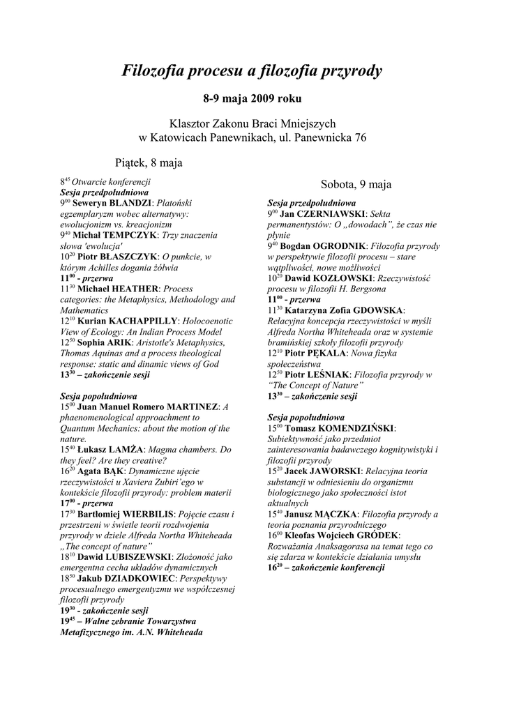 Filozofia procesu a filozofia przyrody 8-9 maja 2009 roku Klasztor Zakonu Braci Mniejszych w Katowicach Panewnikach, ul. Panewnicka 76 Piątek, 8 maja 845 Otwarcie konferencji Sesja przedpołudniowa 900 Seweryn BLANDZI: Platoński egzemplaryzm wobec alternatywy: ewolucjonizm vs. kreacjonizm 940 Michał TEMPCZYK: Trzy znaczenia słowa 'ewolucja' 1020 Piotr BŁASZCZYK: O punkcie, w którym Achilles dogania żółwia 1100 - przerwa 1130 Michael HEATHER: Process categories: the Metaphysics, Methodology and Mathematics 1210 Kurian KACHAPPILLY: Holocoenotic View of Ecology: An Indian Process Model 1250 Sophia ARIK: Aristotle's Metaphysics, Thomas Aquinas and a process theological response: static and dinamic views of God 1330 – zakończenie sesji Sesja popołudniowa 1500 Juan Manuel Romero MARTINEZ: A phaenomenological approachment to Quantum Mechanics: about the motion of the nature. 1540 Łukasz LAMŻA: Magma chambers. Do they feel? Are they creative? 1620 Agata BĄK: Dynamiczne ujęcie rzeczywistości u Xaviera Zubiri’ego w kontekście filozofii przyrody: problem materii 1700 - przerwa 1730 Bartłomiej WIERBILIS: Pojęcie czasu i przestrzeni w świetle teorii rozdwojenia przyrody w dziele Alfreda Northa Whiteheada „The concept of nature” 1810 Dawid LUBISZEWSKI: Złożoność jako emergentna cecha układów dynamicznych 1850 Jakub DZIADKOWIEC: Perspektywy procesualnego emergentyzmu we współczesnej filozofii przyrody 1930 - zakończenie sesji 1945 – Walne zebranie Towarzystwa Metafizycznego im. A.N. Whiteheada Sobota, 9 maja Sesja przedpołudniowa 900 Jan CZERNIAWSKI: Sekta permanentystów: O „dowodach”, że czas nie płynie 940 Bogdan OGRODNIK: Filozofia przyrody w perspektywie filozofii procesu – stare wątpliwości, nowe możliwości 1020 Dawid KOZŁOWSKI: Rzeczywistość procesu w filozofii H. Bergsona 1100 - przerwa 1130 Katarzyna Zofia GDOWSKA: Relacyjna koncepcja rzeczywistości w myśli Alfreda Northa Whiteheada oraz w systemie bramińskiej szkoły filozofii przyrody 1210 Piotr PĘKALA: Nowa fizyka społeczeństwa 1250 Piotr LEŚNIAK: Filozofia przyrody w “The Concept of Nature” 1330 – zakończenie sesji Sesja popołudniowa 1500 Tomasz KOMENDZIŃSKI: Subiektywność jako przedmiot zainteresowania badawczego kognitywistyki i filozofii przyrody 1520 Jacek JAWORSKI: Relacyjna teoria substancji w odniesieniu do organizmu biologicznego jako społeczności istot aktualnych 1540 Janusz MĄCZKA: Filozofia przyrody a teoria poznania przyrodniczego 1600 Kleofas Wojciech GRÓDEK: Rozważania Anaksagorasa na temat tego co się zdarza w kontekście działania umysłu 1620 – zakończenie konferencji
