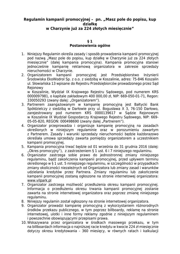 Regulamin kampanii promocyjnej – pn. „Masz pole do popisu, kup działkę w Charzynie już za 224 złotych miesięcznie” §1 Postanowienia ogólne 1. Niniejszy Regulamin określa zasady i sposób prowadzenia kampanii promocyjnej pod nazwą „Masz pole do popisu, kup działkę w Charzynie już za 224 złotych miesięcznie” (dalej kampania promocyjna). Kampania promocyjna stanowi jednocześnie kampanię reklamową organizatora w zakresie sprzedaży nieruchomości w Charzynie. 2. Organizatorem kampanii promocyjnej jest Przedsiębiorstwo Inżynierii Środowiska EkoWodrol Sp. z o.o. z siedzibą w Koszalinie, adres: 75-846 Koszalin ul. Słowiańska 13 wpisane do Rejestru Przedsiębiorców prowadzonego przez Sąd Rejonowy w Koszalinie, Wydział IX Krajowego Rejestru Sądowego, pod numerem KRS 0000097981, o kapitale zakładowym 400 000,00 zł, NIP: 669-050-01-71, Regon: 330050293 (zwany dalej: „Organizatorem”). 3. Partnerem zaangażowanym w kampanię promocyjną jest Bałtycki Bank Spółdzielczy z siedzibą w Darłowie przy ul. Bogusława X 3, 76-150 Darłowo, zarejestrowany pod numerem KRS 0000139617 w Sądzie Rejonowym w Koszalinie IX Wydział Gospodarczy Krajowego Rejestru Sądowego, NIP: 66905-05-820, REGON: 000498690 (zwany dalej „Partnerem”). 4. Organizator przeprowadza i organizuje kampanię promocyjną na zasadach określonych w niniejszym regulaminie oraz w porozumieniu zawartym z Partnerem. Zasady i warunki sprzedaży nieruchomości będzie każdorazowo określała umowa sprzedaży zawarta pomiędzy organizatorem a uczestnikiem kampanii promocyjnej. 5. Kampania promocyjna trwać będzie od 01 września do 31 grudnia 2016 (dalej: „Okres promocyjny”), z zastrzeżeniem § 1 ust. 6 i 7 niniejszego regulaminu. 6. Organizator zastrzega sobie prawo do jednostronnej zmiany niniejszego regulaminu, bądź zakończenia kampanii promocyjnej, przed upływem terminu określonego w § 1 ust. 5 niniejszego regulaminu, w szczególności w przypadkach zmiany okoliczności niezależnych od Organizatora lub zmiany zasad i warunków udzielania kredytów przez Partnera. Zmiany regulaminu lub zakończenie kampanii promocyjnej zostaną ogłoszone na stronie internetowej organizatora: www.vilpark.pl 7. Organizator zastrzega możliwość przedłużenia okresu kampanii promocyjnej. Informacja o przedłużeniu okresu trwania kampanii promocyjnej zostanie zawarta na stronie internetowej organizatora oraz poprzez zmianę niniejszego regulaminu. 8. Niniejszy regulamin został ogłoszony na stronie internetowej organizatora. 9. Organizator prowadzi kampanię promocyjną z wykorzystaniem różnorodnych środków przekazu publicznego, w tym poprzez billboardy, reklamę na stronie internetowej, ulotki i inne formy reklamy zgodnie z niniejszym regulaminem i powszechnie obowiązującymi przepisami prawa. 10. Wskazywana przez organizatora w środkach masowego przekazu, w tym na billboardach informacja o najniższej racie kredytu w kwocie 224 zł miesięcznie dotyczy okresu kredytowania - 360 miesięcy, w równych ratach i kalkulacji dla kwoty kredytu 75.000 zł (przy najmniejszej wielkości nieruchomości 504 m.kw x 150 zł/m.kw. i spełnieniu warunków udzielenia kredytu, przy wpłacie własnej w wysokości 20.000 zł). Szczegółowe zasady udzielania kredytu dla nabycia innych wielkości nieruchomości i innych kwot kredytu określają dokumenty, o których mowa w § 4 ust. 5 niniejszego regulaminu. Kredyt udzielany jest przez Partnera, który podejmuje decyzję o przyznaniu kredytu po dokonaniu analizy kredytowej i oceny ryzyka kredytowego. §2 Definicje 1. Uczestnik Promocji – osoba fizyczna posiadająca pełną zdolność do czynności prawnych, która nabywa od organizatora nieruchomość w Charzynie w związku z uzyskaniem informacji o możliwości zakupu nieruchomości w ramach niniejszej kampanii promocyjnej, dalej określany jako uczestnik lub uczestnik promocji. 2. Regulamin – niniejszy regulamin kampanii promocyjnej dostępny na stronie internetowej organizatora oraz w siedzibie organizatora. 3. Strona internetowa organizatora: strona internetowa o następującym adresie: www.vilpark.pl oraz każda zakładka (odnośnik) zawarty na stronie internetowej związany tematycznie z kampanią promocyjną. 4. Nieruchomości na sprzedaż – nieruchomości zbywane przez organizatora w ramach niniejszej kampanii promocyjnej, położone w Charzynie, które uczestnik promocji może nabyć od organizatora na warunkach określonych w umowie sprzedaży ustalonej przez strony z wykorzystaniem lub bez wykorzystania kredytu oferowanego przez Partnera. Organizator nie ponosi odpowiedzialności za warunki i zasady udzielania kredytu przez Partnera i sam nie prowadzi działalności gospodarczej w tym zakresie. Finansowanie zakupu nieruchomości przez uczestnika od organizatora może odbywać się z wykorzystaniem innych źródeł finansowania, niż środki finansowe pochodzące od Partnera z kredytu. Każdorazowe zasady zakupu nieruchomości będą ustalane w drodze negocjacji pomiędzy organizatorem a uczestnikiem promocji i mogą prowadzić za zgodą obu stron do modyfikacji tych zasad zakupu nieruchomości, które zostały określne w niniejszym regulaminie. 5. Kredyt udzielany przez Partnera – kredyt udzielany na warunkach i zasadach określonych przez Partnera w dokumentach wskazanych w § 4 ust. 5 i 6 niniejszego regulaminu. Organizatorowi przysługuje prawo informowania uczestników promocji o kredycie udzielanym przez Partnera na podstawie porozumienia zawartego między organizatorem a Partnerem. §3 1. W kampanii promocyjnej mogą brać udział wszyscy uczestnicy Promocji, którzy spełniają warunki zakupu nieruchomości z wykorzystaniem lub bez wykorzystania kredytu na jej zakup udzielanego przez Partnera. W przypadku zakupu nieruchomości przez osoby fizyczne dodatkowym warunkiem zawarcia umowy sprzedaży jest posiadanie przez osoby fizyczne pełnej zdolności do czynności prawnych. 2. Warunki