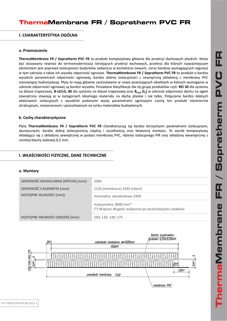 ThermaMembrane FR / Sopratherm PVC FR a. Przeznaczenie ThermaMembrane FR / Sopratherm PVC FR to produkt kompozytowy głównie dla przekryć dachowych płaskich. Może być stosowany również do termomodernizacji istniejących przekryć dachowych, przekryć dla których najważniejszym elementem jest poprawa izolacyjności budynków zwłaszcza w kontekście nowych, coraz bardziej wymagających regulacji w tym zakresie a także ich wysoka odporność ogniowa. ThermaMembrane FR / Sopratherm PVC FR to produkt o bardzo wysokich parametrach odporności ogniowej, bardzo dobrej izolacyjności z zewnętrzną okładziną z membrany PVC stanowiącej hydroizolację. Płyty te mają głównie zastosowanie w nowo powstających obiektach w których wymagania w zakresie odporności ogniowej są bardzo wysokie. Posiadane klasyfikacje dla tej grupy produktów czyli: REI 30 dla systemu na blasze trapezowej, B-s2/s3, d0 dla systemu na blasze trapezowej oraz Broof (t1) w zakresie odporności dachu na ogień zewnętrzny stawiają je w kategoriach idealnego materiału na dachy płaskie i nie tylko. Połączenie bardzo dobrych właściwości izolacyjnych z wysokimi podanymi wyżej parametrami ogniowymi czynią ten produkt niezmiernie atrakcyjnym, nowoczesnym i poszukiwanym na rynku materiałów budowlanych. b. Cechy charakterystyczne Płyty ThermaMembrane FR / Sopratherm PVC FR charakteryzują się bardzo korzystnymi parametrami izolacyjnymi, akustycznymi, bardzo dobrą izolacyjnością cieplną i szczelnością oraz łatwością montażu. To wyrób kompozytowy składający się z okładziny zewnętrznej w postaci membrany PVC, rdzenia izolacyjnego PIR oraz okładziny wewnętrznej z cienkiej blachy stalowej 0,2 mm. I. WŁAŚCIWOŚCI FIZYCZNE, DANE TECHNICZNE a. Wymiary SZEROKOŚĆ MODULARNA (KRYCIA) [mm]: 1000 SZEROKOŚĆ CAŁKOWITA [mm]: 1120 (membrana) 1035 (rdzeń) DOSTĘPNE DŁUGOŚCI [mm]: minimalna: standardowo 2400 maksymalna: 8000 mm* (*) Większe długości wyłącznie po wcześniejszym ustaleniu DOSTĘPNE GRUBOŚCI (RDZEŃ) [mm]: KIT-TMFR/SPVCFR-08.2015-1 100; 120; 140; 175 ThermaMembrane FR / Sopratherm PVC FR I. CHARAKTERYSTYKA OGÓLNA b. Profilowania okładziny zewnętrznej Standardowe: c. Profilowania okładziny wewnętrznej Standardowe: - Płaskie d. Styk płyt Styk płyty jest labiryntowy z zakładką 35 mm, co znacząco poprawia izolacyjność przekryć dachowych ograniczając mostki liniowe. e. Masa 2 GRUBOŚĆ PŁYTY [mm] MASA 1 m [kg] 100 7,2 120 7,9 140 8,6 175 9,8 f. Okładziny Membrana syntetyczna PVC # 1,5 mm zbrojona welonem z włókna szklanego, laminowana geowłókniną (okładzina zewnętrzna) i blacha stalowa ocynkowana 0,20 ± 0,03 mm (okładzina wewnętrzna) g. Rdzeń 3 Sztywna pianka poliuretanowa typu easy PIR o gęstości 34±2 kg/m , współczynnik przewodzenia ciepła w temperaturze +10° C (wartość deklarowana) λd +10° C = 0,025-0,026 W/(m*K) zależnie od grubości płyty. KIT-TMFR/SPVCFR-08.2015-2 ThermaMembrane FR / Sopratherm PVC FR - Płaskie h. Izolacyjność cieplna - Opór cieplny R (m *K/W) dla ścian 100 3,85 120 4,85 140 5,60 175 7,00 - Współczynnik przewodzenia ciepła λd 0,025 W/m*K - dla dN=100 mm 0,026 W/m*K - dla dN=120, 140, 175 mm i. Parametry akustyczne Nie badano j. Szczelność Nie badano k. Odporność ogniowa Płyty ThermaMembrane FR grubości 100, 120, 140 i 175 mm uzyskały klasyfikację w zakresie odporności ogniowej REI 30 w następującym układzie: Blacha trapezowa nośna Paroizolacja - folia PE 0,2 mm - jedna warstwa ThermaMembrane - jedna warstwa 2 Obciążenie podwieszone - 0,30 kN/m Obciążenie śniegiem - I, II i III strefa Wytężenie blachy trapezowej nośnej dla uzyskania odporności ogniowej REI 30 wynosi ... % Nie ma potrzeby stosowania welonu szklanego ! l. Reakcja na ogień Klasa B-s2, d0 - dla grubości 100 mm Klasa B-s3, d0 - dla grubości 120, 140, 175 mm m. Stopień rozprzestrzeniania ognia / Odporność dachu na ogień zewnętrzny NRO od strony zewnętrznej - Broof(t1) n. Trwałość Nie dotyczy KIT-TMFR/SPVCFR-08.2015-3 ThermaMembrane FR / Sopratherm PVC FR 2 GRUBOŚĆ PŁYTY [mm] o. Badania korozyjne Nie dotyczy Dla systemu dachowego jak poniżej: Blacha trapezowa nośna Paroizolacja - folia PE 0,2 mm - jedna warstwa ThermaMembrane - jedna warstwa 2 Obciążenie podwieszone - 0,30 kN/m Obciążenie śniegiem - I, II i III strefa q. Tolerancje wymiarowe Wg PN-EN 13165 III. INFORMACJE DODATKOWE a. Posiadana dokumentacja certyfikacyjna Deklaracja Właściwości Użytkowych CE IV. RYSUNKI TECHNICZNE – WĘZŁY I OBRÓBKI KIT-TMFR/SPVCFR-08.2015-4 ThermaMembrane FR / Sopratherm PVC FR p. Obciążenia