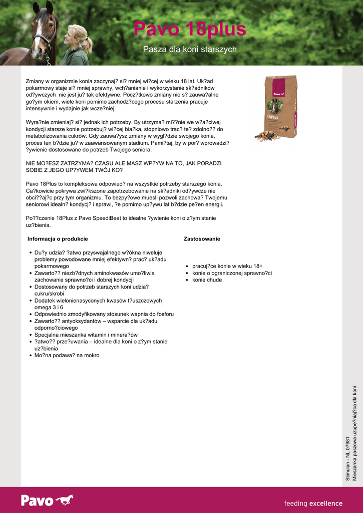 Pavo 18plus Pasza dla koni starszych Zmiany w organizmie konia zaczynaj? si? mniej wi?cej w wieku 18 lat. Uk?ad pokarmowy staje si? mniej sprawny, wch?anianie i wykorzystanie sk?adników od?ywczych nie jest ju? tak efektywne. Pocz?tkowo zmiany nie s? zauwa?alne go?ym okiem, wiele koni pomimo zachodz?cego procesu starzenia pracuje intensywnie i wydajnie jak wcze?niej. Wyra?nie zmieniaj? si? jednak ich potrzeby. By utrzyma? mi??nie we w?a?ciwej kondycji starsze konie potrzebuj? wi?cej bia?ka, stopniowo trac? te? zdolno?? do metabolizowania cukrów. Gdy zauwa?ysz zmiany w wygl?dzie swojego konia, proces ten b?dzie ju? w zaawansowanym stadium. Pami?taj, by w por? wprowadzi? ?ywienie dostosowane do potrzeb Twojego seniora. NIE MO?ESZ ZATRZYMA? CZASU ALE MASZ WP?YW NA TO, JAK PORADZI SOBIE Z JEGO UP?YWEM TWÓJ KO? Pavo 18Plus to kompleksowa odpowied? na wszystkie potrzeby starszego konia. Ca?kowicie pokrywa zwi?kszone zapotrzebowanie na sk?adniki od?ywcze nie obci??aj?c przy tym organizmu. To bezpy?owe muesli pozwoli zachowa? Twojemu seniorowi idealn? kondycj? i sprawi, ?e pomimo up?ywu lat b?dzie pe?en energii. Po??czenie 18Plus z Pavo SpeediBeet to idealne ?ywienie koni o z?ym stanie uz?bienia. Du?y udzia? ?atwo przyswajalnego w?ókna niweluje problemy powodowane mniej efektywn? prac? uk?adu pokarmowego Zawarto?? niezb?dnych aminokwasów umo?liwia zachowanie sprawno?ci i dobrej kondycji Dostosowany do potrzeb starszych koni udzia? cukru/skrobi Dodatek wielonienasyconych kwasów t?uszczowych omega 3 i 6 Odpowiednio zmodyfikowany stosunek wapnia do fosforu Zawarto?? antyoksydantów – wsparcie dla uk?adu odporno?ciowego Specjalna mieszanka witamin i minera?ów ?atwo?? prze?uwania – idealne dla koni o z?ym stanie uz?bienia Mo?na podawa? na mokro Zastosowanie pracuj?ce konie w wieku 18+ konie o ograniczonej sprawno?ci konie chude Stimulan - NL 07981 Mieszanka paszowa uzupe?niaj?ca dla koni Informacja o produkcie Pavo 18plus Pasza dla koni starszych Specyfikacja Zawiera ?uska sojowa Pra?one wyt?oki sojowe Orkisz Lucerna J?czmie? sp?czniany Kaszka pszenna ?ruta owsiana ?ruta poekstrakcyjna rzepakowa olej sojowy Melasa trzcinowa Nasiona lnu Pszenica Pulpa jab?kowa Kukurydza Groszek p?atkowany Wyt?oki s?onecznikowe Marchew-p?atki Pulpa z cykorii Witaminy i minera?y Opakowanie Paczkowany 15 kg Trwa?o?? Paczkowany 6 Mnth Analiza gwarantowana Energia (EWpa) 0,86 Units/kg Energia strawna 12,4 MJ/kg (DE) Energia (ME) 10,3 MJ/kg Bia?ko strawne, 13 % surowe Bia?ko surowe 16,0 % T?uszcz surowy 7,5 % W?ókno surowe 15,0 % Popió? surowy 7,7 % Cukier 5,0 % Skrobia 17,0 % Lizyna 7,5 g Metionina 2,1 g Minera?y i pierwiastki ?ladowe na kg Wap? 0,8 % Fosfor 0,5 % Sód 0,4 % Potas 1,2 % Magnez 0,5 % Mied? 60 mg ?elazo 155 mg Cynk 235 mg Mangan 150 mg Selen 0,6 mg Jod 1,2 mg Witaminy (na kg) Witamina A Witamina D3 Witamina E Witamina B1 Witamina B2 Witamina B6 Witamina B12 Witamina C Cholina D-biotyna Kwias foliowy 22.500 IE 3.225 IE 500 IE 24 mg 26 mg 15 mg 220 mcg 250 mg 250 mg 550 mcg 13 mg Przechowywanie Przechowywa? w zimnym suchym i zacienionym pomieszczeniu. Zamyka? szczelnie po u?yciu Dawka ?ywieniowa kg/dzie? 400 kg 600 kg kg/day kg/day kg/day Healthy horse 0,7 kg 1,3 kg 2,0 kg Horse in bad condition or with teeth problems* 1,6 kg 3,2 kg 4,8 kg Stimulan - NL 07981 Mieszanka paszowa uzupe?niaj?ca dla koni 200 kg Powered by TCPDF (www.tcpdf.org)