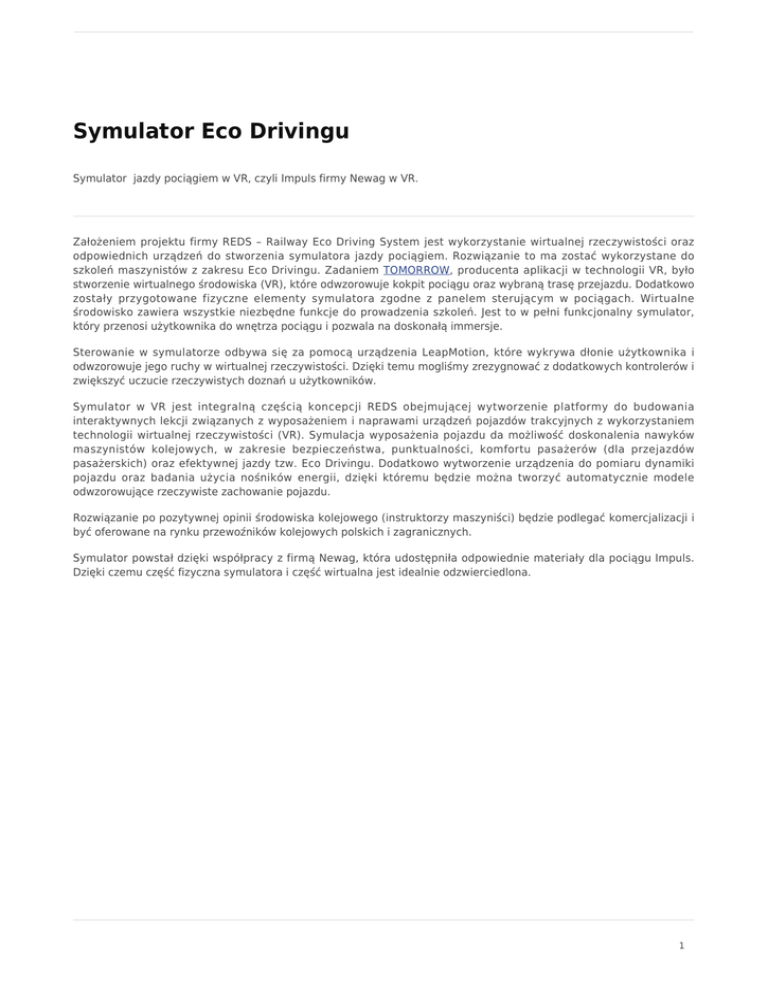 Symulator Eco Drivingu Symulator jazdy pociągiem w VR, czyli Impuls firmy Newag w VR. Założeniem projektu firmy REDS – Railway Eco Driving System jest wykorzystanie wirtualnej rzeczywistości oraz odpowiednich urządzeń do stworzenia symulatora jazdy pociągiem. Rozwiązanie to ma zostać wykorzystane do szkoleń maszynistów z zakresu Eco Drivingu. Zadaniem TOMORROW, producenta aplikacji w technologii VR, było stworzenie wirtualnego środowiska (VR), które odwzorowuje kokpit pociągu oraz wybraną trasę przejazdu. Dodatkowo zostały przygotowane fizyczne elementy symulatora zgodne z panelem sterującym w pociągach. Wirtualne środowisko zawiera wszystkie niezbędne funkcje do prowadzenia szkoleń. Jest to w pełni funkcjonalny symulator, który przenosi użytkownika do wnętrza pociągu i pozwala na doskonałą immersje. Sterowanie w symulatorze odbywa się za pomocą urządzenia LeapMotion, które wykrywa dłonie użytkownika i odwzorowuje jego ruchy w wirtualnej rzeczywistości. Dzięki temu mogliśmy zrezygnować z dodatkowych kontrolerów i zwiększyć uczucie rzeczywistych doznań u użytkowników. Symulator w VR jest integralną częścią koncepcji REDS obejmującej wytworzenie platformy do budowania interaktywnych lekcji związanych z wyposażeniem i naprawami urządzeń pojazdów trakcyjnych z wykorzystaniem technologii wirtualnej rzeczywistości (VR). Symulacja wyposażenia pojazdu da możliwość doskonalenia nawyków maszynistów kolejowych, w zakresie bezpieczeństwa, punktualności, komfortu pasażerów (dla przejazdów pasażerskich) oraz efektywnej jazdy tzw. Eco Drivingu. Dodatkowo wytworzenie urządzenia do pomiaru dynamiki pojazdu oraz badania użycia nośników energii, dzięki któremu będzie można tworzyć automatycznie modele odwzorowujące rzeczywiste zachowanie pojazdu. Rozwiązanie po pozytywnej opinii środowiska kolejowego (instruktorzy maszyniści) będzie podlegać komercjalizacji i być oferowane na rynku przewoźników kolejowych polskich i zagranicznych. Symulator powstał dzięki współpracy z firmą Newag, która udostępniła odpowiednie materiały dla pociągu Impuls. Dzięki czemu część fizyczna symulatora i część wirtualna jest idealnie odzwierciedlona. 1