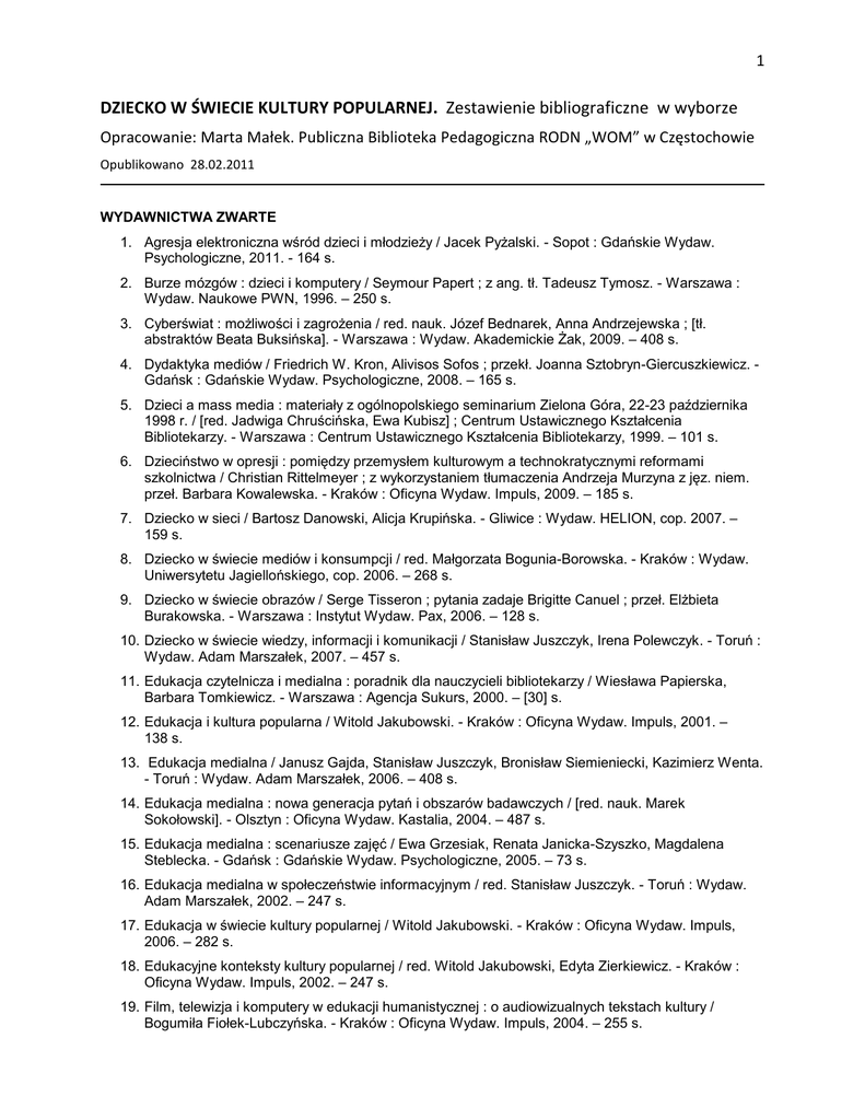 1 DZIECKO W ŚWIECIE KULTURY POPULARNEJ. Zestawienie bibliograficzne w wyborze Opracowanie: Marta Małek. Publiczna Biblioteka Pedagogiczna RODN „WOM” w Częstochowie Opublikowano 28.02.2011 WYDAWNICTWA ZWARTE 1. Agresja elektroniczna wśród dzieci i młodzieży / Jacek Pyżalski. - Sopot : Gdańskie Wydaw. Psychologiczne, 2011. - 164 s. 2. Burze mózgów : dzieci i komputery / Seymour Papert ; z ang. tł. Tadeusz Tymosz. - Warszawa : Wydaw. Naukowe PWN, 1996. – 250 s. 3. Cyberświat : możliwości i zagrożenia / red. nauk. Józef Bednarek, Anna Andrzejewska ; [tł. abstraktów Beata Buksińska]. - Warszawa : Wydaw. Akademickie Żak, 2009. – 408 s. 4. Dydaktyka mediów / Friedrich W. Kron, Alivisos Sofos ; przekł. Joanna Sztobryn-Giercuszkiewicz. Gdańsk : Gdańskie Wydaw. Psychologiczne, 2008. – 165 s. 5. Dzieci a mass media : materiały z ogólnopolskiego seminarium Zielona Góra, 22-23 października 1998 r. / [red. Jadwiga Chruścińska, Ewa Kubisz] ; Centrum Ustawicznego Kształcenia Bibliotekarzy. - Warszawa : Centrum Ustawicznego Kształcenia Bibliotekarzy, 1999. – 101 s. 6. Dzieciństwo w opresji : pomiędzy przemysłem kulturowym a technokratycznymi reformami szkolnictwa / Christian Rittelmeyer ; z wykorzystaniem tłumaczenia Andrzeja Murzyna z jęz. niem. przeł. Barbara Kowalewska. - Kraków : Oficyna Wydaw. Impuls, 2009. – 185 s. 7. Dziecko w sieci / Bartosz Danowski, Alicja Krupińska. - Gliwice : Wydaw. HELION, cop. 2007. – 159 s. 8. Dziecko w świecie mediów i konsumpcji / red. Małgorzata Bogunia-Borowska. - Kraków : Wydaw. Uniwersytetu Jagiellońskiego, cop. 2006. – 268 s. 9. Dziecko w świecie obrazów / Serge Tisseron ; pytania zadaje Brigitte Canuel ; przeł. Elżbieta Burakowska. - Warszawa : Instytut Wydaw. Pax, 2006. – 128 s. 10. Dziecko w świecie wiedzy, informacji i komunikacji / Stanisław Juszczyk, Irena Polewczyk. - Toruń : Wydaw. Adam Marszałek, 2007. – 457 s. 11. Edukacja czytelnicza i medialna : poradnik dla nauczycieli bibliotekarzy / Wiesława Papierska, Barbara Tomkiewicz. - Warszawa : Agencja Sukurs, 2000. – [30] s. 12. Edukacja i kultura popularna / Witold Jakubowski. - Kraków : Oficyna Wydaw. Impuls, 2001. – 138 s. 13. Edukacja medialna / Janusz Gajda, Stanisław Juszczyk, Bronisław Siemieniecki, Kazimierz Wenta. - Toruń : Wydaw. Adam Marszałek, 2006. – 408 s. 14. Edukacja medialna : nowa generacja pytań i obszarów badawczych / [red. nauk. Marek Sokołowski]. - Olsztyn : Oficyna Wydaw. Kastalia, 2004. – 487 s. 15. Edukacja medialna : scenariusze zajęć / Ewa Grzesiak, Renata Janicka-Szyszko, Magdalena Steblecka. - Gdańsk : Gdańskie Wydaw. Psychologiczne, 2005. – 73 s. 16. Edukacja medialna w społeczeństwie informacyjnym / red. Stanisław Juszczyk. - Toruń : Wydaw. Adam Marszałek, 2002. – 247 s. 17. Edukacja w świecie kultury popularnej / Witold Jakubowski. - Kraków : Oficyna Wydaw. Impuls, 2006. – 282 s. 18. Edukacyjne konteksty kultury popularnej / red. Witold Jakubowski, Edyta Zierkiewicz. - Kraków : Oficyna Wydaw. Impuls, 2002. – 247 s. 19. Film, telewizja i komputery w edukacji humanistycznej : o audiowizualnych tekstach kultury / Bogumiła Fiołek-Lubczyńska. - Kraków : Oficyna Wydaw. Impuls, 2004. – 255 s. 2 20. Gry komputerowe, Internet i telewizja : co robić, gdy nasze dzieci są nimi zafascynowane? / Nessia Laniado, Gianfilippo Pietra ; przekł. Jacek Partyka. - Kraków : Wydaw. eSPe, 2006. - 143 s. 21. Internet a dzieci : uzależnienia i inne niebezpieczeństwa / Parry Aftab ; przeł. Barbara Nicewicz. Warszawa : Prószyński i S-ka, 2003. – 319 s. 22. Internet jako nowe dobro wspólne / Justyna Hofmokl. - Warszawa : Wydaw. Akademickie i Profesjonalne, cop. 2009. - 248 s. - (Cyberkultura, Internet, Społeczeństwo) 23. Komunikowanie (się) w mediach elektronicznych : język, edukacja, semiotyka : monografia / red. nauk. Mirosław Filiciak, Grzegorz Ptaszek. - Warszawa : Wydaw. Akademickie i Profesjonalne, cop. 2009. – 437 s. 24. Kultura masowa : krytyka i obrona / Antonina Kłoskowska. - Wyd.4, 1 dodruk. - Warszawa : Wydaw. Naukowe PWN, 2006. – 482 s. - (Biblioteka Socjologiczna) 25. Kultura i język mediów / red. Maciej Tanaś ; [Wyższa Szkoła Pedagogiczna ZNP]. - Kraków : Oficyna Wydaw. Impuls ; Warszawa : Wyższa Szkoła Pedagogiczna ZNP, 2007. – 349 s. 26. Media i komunikowanie masowe : teorie i analizy prasy, radia, telewizji i Internetu / Tomasz GobanKlas. - Wyd. 2, (1 dodruk). - Warszawa : Wydaw. Naukowe PWN, 2005. – 339 s. 27. Media w edukacji / Janusz Gajda ; [Wyższa Szkoła Pedagogiczna ZNP w Warszawie]. - Wyd. 5. Kraków : Oficyna Wydaw. Impuls, 2005. – 218 s. 28. Media w Europie / Kevin Williams ; tł. Anna Piwnicka. - Warszawa : Wydaw. Akademickie i Profesjonalne, cop. 2008. – 222 s. 29. Media w nauczaniu / Józef Bednarek. - Warszawa : Wydaw. MIKOM, 2002. – 342 s. 30. Multimedia w edukacji historycznej i społecznej / red. nauk. Janusz Rulka, Barbara Tarnowska. Bydgoszcz : Wydaw. Akademii Bydgoskiej im. Kazimierza Wielkiego, 2002. – 305 s. 31. Multimedia w kształceniu / Józef Bednarek. - Warszawa : Wydaw. Naukowe PWN, 2006. – 412 s. 32. Pedagogika a środki informatyczne i media / red. Maciej Tanaś ; Wyższa Szkoła Pedagogiczna ZNP w Warszawie. - Kraków : Oficyna Wydaw. Impuls ; Warszawa : Wyższa Szkoła Pedagogiczna ZNP, 2004. – 212 s. 33. Pedagogika mass mediów / Adam Lepa. - Wyd. 2, poszerz. - Łódź : Archidiecezjalne Wydaw. Łódzkie, 2000. – 255 s. 34. Pedagogika medialna : podręcznik akademicki. T.1-2 / red. nauk. Bronisław Siemieniecki. Warszawa : Wydaw. Naukowe PWN, 2007. – 384 ; 271 s. 35. Przyjaciele w internecie / Anna Słysz, Beata Arcimowicz. - Gdańsk : Gdańskie Wydaw. Psychologiczne, 2009. - 166 s. - (Media i Rozwój Dziecka) 36. Psychologia mediów / Peter Winterhoff-Spurk ; przeł. Piotr Włodyga. - Kraków : Wydaw. WAM, 2007. – 249 s. 37. Uzależnienie od komputera i Internetu u dzieci i młodzieży /
