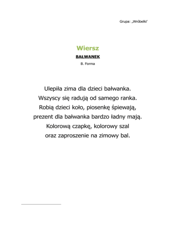 Grupa: „Wróbelki’ Wiersz BAŁWANEK B. Forma Ulepiła zima dla dzieci bałwanka. Wszyscy się radują od samego ranka. Robią dzieci koło, piosenkę śpiewają, prezent dla bałwanka bardzo ładny mają. Kolorową czapkę, kolorowy szal oraz zaproszenie na zimowy bal. PIOSENKA TUPU,TUP PO ŚNIEGU (muz. T. Pabisiak, sł. A. Galica) 1. Przyszła zima biała, śniegu nasypała. Zamroziła wodę, staw przykryła lodem. Ref. Tupu, tup po śniegu, dzyń, dzyń, dzyń na sankach. Skrzypu, skrzyp na mrozie, lepimy bałwanka./bis 2. Kraczą głośno wrony, marzną im ogony. Mamy pusto w brzuszku, dajcie nam okruszków. Ref. Tupu, tup po śniegu, dzyń, dzyń, dzyń na sankach. Skrzypu, skrzyp na mrozie, lepimy bałwanka./bis 3. Ciepłe rękawiczki i wełniany szalik. Białej, mroźnej zimy nie boję się wcale. Ref. Tupu, tup po śniegu, dzyń, dzyń, dzyń na sankach. Skrzypu, skrzyp na mrozie, lepimy bałwanka./bis GŁÓWNE ZAMIERZENIA WYCHOWAWCZO-DYDAKTYCZNE NA MIESIĄC LUTY GRUPA „WRÓBELKI” 1. Kształtowanie zainteresowań czytelniczych, wzbogacanie wiedzy i przeżyć poprzez ciągły kontakt z literaturą dziecięcą 2. Poznanie urządzeń technicznych w najbliższym otoczeniu. Zagadnienia z programu wychowawczego: 1. Słuchanie bajek, opowiadań, gdzie wyeksponowana jest miłość, dobroć, prawda.. 2. Określanie jednoznacznych postaw przeciwstawnych: dobro- zło.