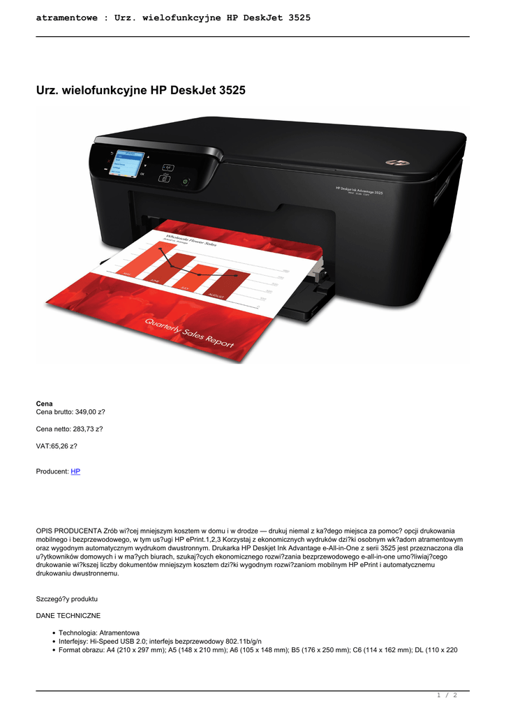 atramentowe : Urz. wielofunkcyjne HP DeskJet 3525 Urz. wielofunkcyjne HP DeskJet 3525 Cena Cena brutto: 349,00 z? Cena netto: 283,73 z? VAT:65,26 z? Producent: HP OPIS PRODUCENTA Zrób wi?cej mniejszym kosztem w domu i w drodze — drukuj niemal z ka?dego miejsca za pomoc? opcji drukowania mobilnego i bezprzewodowego, w tym us?ugi HP ePrint.1,2,3 Korzystaj z ekonomicznych wydruków dzi?ki osobnym wk?adom atramentowym oraz wygodnym automatycznym wydrukom dwustronnym. Drukarka HP Deskjet Ink Advantage e-All-in-One z serii 3525 jest przeznaczona dla u?ytkowników domowych i w ma?ych biurach, szukaj?cych ekonomicznego rozwi?zania bezprzewodowego e-all-in-one umo?liwiaj?cego drukowanie wi?kszej liczby dokumentów mniejszym kosztem dzi?ki wygodnym rozwi?zaniom mobilnym HP ePrint i automatycznemu drukowaniu dwustronnemu. Szczegó?y produktu DANE TECHNICZNE Technologia: Atramentowa Interfejsy: Hi-Speed USB 2.0; interfejs bezprzewodowy 802.11b/g/n Format obrazu: A4 (210 x 297 mm); A5 (148 x 210 mm); A6 (105 x 148 mm); B5 (176 x 250 mm); C6 (114 x 162 mm); DL (110 x 220 1 / 2 atramentowe : Urz. wielofunkcyjne HP DeskJet 3525 mm) Rozdzielczo?? druku (czer?): 1200 x 600 dpi; Rozdzielczo?? druku (kolor): 4800x1200 dpi Rozdzielczo?? skanowania: 1200 x 2400 dpi Pr?dko?? druku: do 11 str./min, Pr?dko?? kopiowania: 6,5 str./min Wy?wietlacz LCD: Kolorowy ekran dotykowy CGD o przek?tnej 6,74 cm Obs?ugiwane karty pami?ci: Memory Stick Duo, Secure Digital/MultimediaCard Podajnik papieru: 80 arkuszy Odbiornik papieru: 15 G??boko??: 545 mm Szeroko??: 444 mm Wysoko??: 143 mm Waga: 5,05 kg Miesi?czne obci??enie: 1000 stron Materia?y eksploatacyjne: CZ109AE CZ110AE CZ111AE CZ112AE Obs?ugiwane systemy operacyjne: Microsoft® Windows® 7, Windows Vista®, Windows® XP SP3 lub nowszy (tylko wersja 32-bitowa); Mac OS X v10.6, v10.7 Do??czone oprogramowanie: HP Photo Creations Dodatkowe informacje: Startowe wk?ady atramentowe HP 655 w kolorach czarnym, b??kitnym, purpurowym i ?ó?tym 2 / 2 Powered by TCPDF (www.tcpdf.org)