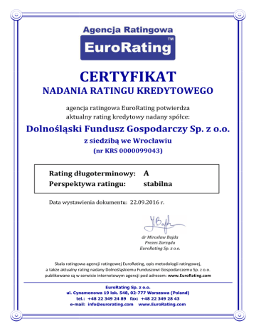 CERTYFIKAT NADANIA RATINGU KREDYTOWEGO agencja ratingowa EuroRating potwierdza aktualny rating kredytowy nadany spółce: Dolnośląski Fundusz Gospodarczy Sp. z o.o. z siedzibą we Wrocławiu (nr KRS 0000099043) Rating długoterminowy: Perspektywa ratingu: A stabilna Data wystawienia dokumentu: 22.09.2016 r. dr Mirosław Bajda Prezes Zarządu EuroRating Sp. z o.o. Skala ratingowa agencji ratingowej EuroRating, opis metodologii ratingowej, a także aktualny rating nadany Dolnośląskiemu Funduszowi Gospodarczemu Sp. z o.o. publikowane są w serwisie internetowym agencji pod adresem: www.EuroRating.com EuroRating Sp. z o.o. ul. Cynamonowa 19 lok. 548, 02-777 Warszawa (Poland) tel.: +48 22 349 24 89 fax: +48 22 349 28 43 e-mail: [email protected] www.EuroRating.com