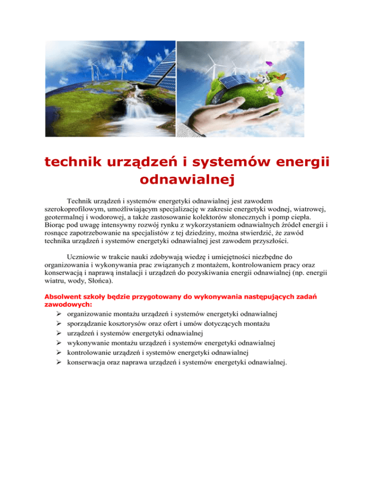 technik urządzeń i systemów energii odnawialnej Technik urządzeń i systemów energetyki odnawialnej jest zawodem szerokoprofilowym, umożliwiającym specjalizację w zakresie energetyki wodnej, wiatrowej, geotermalnej i wodorowej, a także zastosowanie kolektorów słonecznych i pomp ciepła. Biorąc pod uwagę intensywny rozwój rynku z wykorzystaniem odnawialnych źródeł energii i rosnące zapotrzebowanie na specjalistów z tej dziedziny, można stwierdzić, że zawód technika urządzeń i systemów energetyki odnawialnej jest zawodem przyszłości. Uczniowie w trakcie nauki zdobywają wiedzę i umiejętności niezbędne do organizowania i wykonywania prac związanych z montażem, kontrolowaniem pracy oraz konserwacją i naprawą instalacji i urządzeń do pozyskiwania energii odnawialnej (np. energii wiatru, wody, Słońca). Absolwent szkoły będzie przygotowany do wykonywania następujących zadań zawodowych: organizowanie montażu urządzeń i systemów energetyki odnawialnej sporządzanie kosztorysów oraz ofert i umów dotyczących montażu urządzeń i systemów energetyki odnawialnej wykonywanie montażu urządzeń i systemów energetyki odnawialnej kontrolowanie urządzeń i systemów energetyki odnawialnej konserwacja oraz naprawa urządzeń i systemów energetyki odnawialnej. W trakcie trwania nauki zdobędziesz dwie kwalifikacje: B.21 Montaż urządzeń i systemów energetyki odnawialnej. E.22 Eksploatacja urządzeń i systemów energetyki odnawialnej. Program nauki w zawodzie technik urządzeń i systemów energetyki odnawialnej obejmuje: 1. Szeroko pojętą problematyką odnawialnych źródeł energii, ich zasobów, pozyskiwania, projektowania i wykorzystywania w obszarze energetyki słonecznej, wiatrowej, geotermalnej, energetyki wodnej, a także wykorzystania biomasy; 2. Zagadnienia dotyczące technologii odnawialnych źródeł energii, ekologicznych skutków przetwarzania energii, podstaw prawnych ochrony środowiska i rozwoju energetyki odnawialnej w Polsce i na świecie, a także elementy polityki energetycznej w Polsce; 3. Uczniowie uzyskują również wiedzę w zakresie analogowych i cyfrowych systemów pomiarowych, numerycznych systemów sterowania i regulacji oraz wykorzystywania technik komputerowych w projektowaniu i eksploatacji urządzeń energetycznych. Absolwenci znający najnowsze osiągnięcia dotyczące odnawialnych źródeł energii oraz uwarunkowania prawne w tym obszarze będą przygotowani do wykonywania zadań w zakresie pozyskiwania odnawialnych źródeł energii, wspartych elementami prawa w dziedzinie budownictwa, energetyki, ekologii i gospodarki wodno-ściekowej. Odnawialne źródła energii to przyszłość energetyki i obecna konieczność stosowania wynikająca z systematycznego wzrostu cen paliw oraz rosnącej świadomości w zakresie niezbędnej ochrony środowiska naturalnego. W Polsce udział energii odnawialnej w całkowitej energii produkowanej rocznie stale rośnie. Perspektywy tego wzrostu są ogromne, a nasycenie rynku niewielkie, co przemawia za kształceniem na tym kierunku. Po ukończeniu szkoły można podjąć studia w tej specjalności. Absolwenci technikum urządzeń i systemów energii odnawialnej są poszukiwani na regionalnym i europejskim rynku pracy. Technik urządzeń i systemów energii odnawialnej to strzał w dziesiątkę!!! Zespół Szkół Technicznych „MECHANIK” 58-500 Jelenia Góra ul. Obrońców Pokoju 10 tel. 757525031 757522256 www.zstmechanik.pl [email protected]