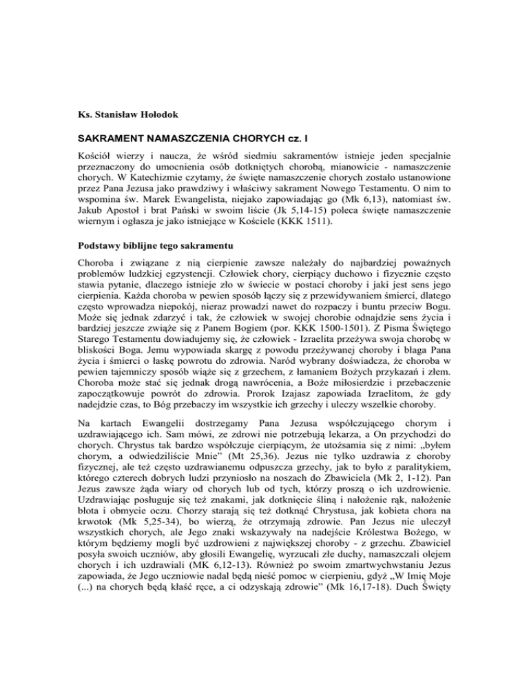 Ks. Stanisław Hołodok SAKRAMENT NAMASZCZENIA CHORYCH cz. I Kościół wierzy i naucza, że wśród siedmiu sakramentów istnieje jeden specjalnie przeznaczony do umocnienia osób dotkniętych chorobą, mianowicie - namaszczenie chorych. W Katechizmie czytamy, że święte namaszczenie chorych zostało ustanowione przez Pana Jezusa jako prawdziwy i właściwy sakrament Nowego Testamentu. O nim to wspomina św. Marek Ewangelista, niejako zapowiadając go (Mk 6,13), natomiast św. Jakub Apostoł i brat Pański w swoim liście (Jk 5,14-15) poleca święte namaszczenie wiernym i ogłasza je jako istniejące w Kościele (KKK 1511). Podstawy biblijne tego sakramentu Choroba i związane z nią cierpienie zawsze należały do najbardziej poważnych problemów ludzkiej egzystencji. Człowiek chory, cierpiący duchowo i fizycznie często stawia pytanie, dlaczego istnieje zło w świecie w postaci choroby i jaki jest sens jego cierpienia. Każda choroba w pewien sposób łączy się z przewidywaniem śmierci, dlatego często wprowadza niepokój, nieraz prowadzi nawet do rozpaczy i buntu przeciw Bogu. Może się jednak zdarzyć i tak, że człowiek w swojej chorobie odnajdzie sens życia i bardziej jeszcze zwiąże się z Panem Bogiem (por. KKK 1500-1501). Z Pisma Świętego Starego Testamentu dowiadujemy się, że człowiek - Izraelita przeżywa swoja chorobę w bliskości Boga. Jemu wypowiada skargę z powodu przeżywanej choroby i błaga Pana życia i śmierci o łaskę powrotu do zdrowia. Naród wybrany doświadcza, że choroba w pewien tajemniczy sposób wiąże się z grzechem, z łamaniem Bożych przykazań i złem. Choroba może stać się jednak drogą nawrócenia, a Boże miłosierdzie i przebaczenie zapoczątkowuje powrót do zdrowia. Prorok Izajasz zapowiada Izraelitom, że gdy nadejdzie czas, to Bóg przebaczy im wszystkie ich grzechy i uleczy wszelkie choroby. Na kartach Ewangelii dostrzegamy Pana Jezusa współczującego chorym i uzdrawiającego ich. Sam mówi, ze zdrowi nie potrzebują lekarza, a On przychodzi do chorych. Chrystus tak bardzo współczuje cierpiącym, że utożsamia się z nimi: „byłem chorym, a odwiedziliście Mnie” (Mt 25,36). Jezus nie tylko uzdrawia z choroby fizycznej, ale też często uzdrawianemu odpuszcza grzechy, jak to było z paralitykiem, którego czterech dobrych ludzi przyniosło na noszach do Zbawiciela (Mk 2, 1-12). Pan Jezus zawsze żąda wiary od chorych lub od tych, którzy proszą o ich uzdrowienie. Uzdrawiając posługuje się też znakami, jak dotknięcie śliną i nałożenie rąk, nałożenie błota i obmycie oczu. Chorzy starają się też dotknąć Chrystusa, jak kobieta chora na krwotok (Mk 5,25-34), bo wierzą, że otrzymają zdrowie. Pan Jezus nie uleczył wszystkich chorych, ale Jego znaki wskazywały na nadejście Królestwa Bożego, w którym będziemy mogli być uzdrowieni z największej choroby - z grzechu. Zbawiciel posyła swoich uczniów, aby głosili Ewangelię, wyrzucali złe duchy, namaszczali olejem chorych i ich uzdrawiali (MK 6,12-13). Również po swoim zmartwychwstaniu Jezus zapowiada, że Jego uczniowie nadal będą nieść pomoc w cierpieniu, gdyż „W Imię Moje (...) na chorych będą kłaść ręce, a ci odzyskają zdrowie” (Mk 16,17-18). Duch Święty udziela niektórym chrześcijanom daru uzdrawiania. Tak czyni np. św. Piotr uzdrawiając w imię Jezusa zmartwychwstałego chromego człowieka (Dz 3,1-10). Św. Jakub, jak już wspomnieliśmy, dokładnie opisuje, co należy czynić przy sprawowaniu sakramentu namaszczenia. Kapłani we wspólnocie wierzących powinni modlić się nad chorym, kłaść na niego ręce i namaszczać. Może on wówczas otrzymać odpuszczenie grzechów i laskę powrotu do zdrowia (por. KKK 1502-1508). Z dziejów praktyki sakramentu namaszczenia chorych W pierwszych wiekach rzadko mówi się o sakramentalnym namaszczeniu chorych, nie odróżniając go często od prywatnego namaszczania w domu traktowanego jako sakramentale. Dlaczego tak było? Otóż namaszczenie łączy się z odpuszczeniem grzechów (por. Sobór Trydencki, 14 sesja). Nie potrzebowali więc męczennicy i chrześcijanie nie potrzebujący publicznej pokuty. Nie dopuszczano do tego sakramentu chrześcijan pokutujących do końca życia lub znów upadłych w grzechy ciężkie ( w niektórych regionach Kościoła pokuta za ciężkie grzechy nie mogła być powtarzana). Wykluczeni byli od tego sakramentu katechumeni, a przyjmujący chrzest na łożu śmierci nie potrzebowali go. Sakrament chorych nie miał charakteru publicznego, jak np. chrzest, gdyż udzielano go prywatnie, w domu. Wyraźne świadectwo o praktyce sakramentu namaszczenia chorych daje papież Innocenty I (+ 417), mówiąc, że udzielają go biskupi i kapłani. Odmawia jednak tego sakramentu publicznym pokutnikom, dopóki nie odprawią nałożonej na nich pokuty. Wierni mogą nadal namaszczać się w chorobie poświęconym olejem, ale jest to tylko sakramentale. Św. Cezary (+ 543), biskup z Arles w Galii, wspomina, że kapłani udzielali tego sakramentu chorym. Dzieci przychodziły w Wielką Sobotę do katedry z wiaderkami po poświęcony olej do prywatnego namaszczania w domu. Brały też wtedy święconą wodę. Od IV wieku odkładano pokutę na godzinę śmierci, więc podobnie też traktowano sakrament chorych. Zasadnicze zmiany nastąpiły w dziejach namaszczenia od wieku VIII. Mianowicie ustała praktyka pokuty publicznej, a pokuta tzw. prywatna (jak dzisiaj) nie pozbawiała prawa do sakramentu chorych. Od tego czasu spowiedź, namaszczenie chorych i Komunia św. staje się normalną praktyką zaopatrzenia ciężko chorych i umierających. Synody z wieku VIII i IX, a nawet rozporządzenia władców świeckich nakazywały kapłanom zabierania ze sobą Eucharystii i oleju chorych, aby podczas wizytowania parafian można było przyjść z pomocą chorym. Wzrósł też szacunek do tego sakramentu, w rezultacie czego zakazano wiernym posługiwać się świ