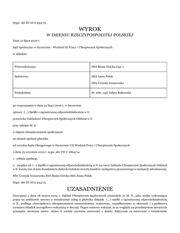Sygn. akt III AUa 935/15 WYROK W IMIENIU RZECZYPOSPOLITEJ POLSKIEJ Dnia 12 lipca 2016 r. Sąd Apelacyjny w Szczecinie - Wydział III Pracy i Ubezpieczeń Społecznych w składzie: Przewodniczący: SSA Beata Górska (spr.) Sędziowie: SSA Anna Polak SSA Urszula Iwanowska Protokolant: St. sekr. sąd. Edyta Rakowska po rozpoznaniu w dniu 12 lipca 2016 r. w Szczecinie sprawy (...) Spółki z ograniczoną odpowiedzialnością w S. przeciwko Zakładowi Ubezpieczeń Społecznych Oddział w S. przy udziale M. S. o objęcie ubezpieczeniem społecznym na skutek apelacji płatnika od wyroku Sądu Okręgowego w Szczecinie VII Wydział Pracy i Ubezpieczeń Społecznych z dnia 25 września 2015 r. sygn. akt VII U 1864/14 1. oddala apelację, 2. zasądza od (...) Spółki z ograniczoną odpowiedzialnością w S. na rzecz Zakładu Ubezpieczeń Społecznych Oddział w S. kwotę 120 zł (sto dwadzieścia złotych) tytułem zwrotu kosztów zastępstwa procesowego w instancji odwoławczej. SSA Urszula Iwanowska SSA Beata Górska SSA Anna Polak Sygn. akt III AUa 935/15 UZASADNIENIE Decyzjami z dnia 18 marca 2014 r. Zakład Ubezpieczeń Społecznych stwierdził, że M. S., jako osoba wykonująca pracę na podstawie umowy o świadczenie usług u płatnika składek (...) spółki z ograniczoną odpowiedzialnością w S., podlega obowiązkowo ubezpieczeniom emerytalnemu, rentowym, wypadkowemu w okresach i z podstawą wymiaru składek szczegółowo wskazaną w decyzji. Organ rentowy wskazał, że ze względu na przedmiotem zawartych pomiędzy stronami umów, mimo iż zostały nazwane umowami o dzieło, faktycznie są umowami o świadczenie usług, gdyż nie odpowiadają treści art. 627 i następne Kodeksu cywilnego. Strony nie wskazały indywidualnych cech, którymi miałyby charakteryzować się rezultaty prac wykonywanych przez zainteresowanego. Przedmiot zawartych przez strony umów zobowiązywał jedynie do dochowania należytej staranności, nie zaś uzyskania indywidualnego, niepowtarzalnego rezultatu. Czynności wykonywane przez zainteresowanego nie wyróżniały się od innych rezultatów tego typu działalności szczególną formą, ani treścią. Ponadto usługi wykonywane przez zainteresowanego na rzecz płatnika składek miały powtarzalny charakter. Organ rentowy wskazał nadto, że w okresie od 01.08.2003 r. do 17.12.2003 r. płatnik składek (...) Spółka z o.o. zgłosił M. S. do obowiązkowych ubezpieczeń społecznych jako pracownika. Ponadto ustalono, że w okresie wykonywania przedmiotowych umów M. S. miał ustalone prawo do emerytury. W odwołaniu od decyzji, płatnik składek wniósł o jej zmianę przez ustalenie, że M. S. nie podlega obowiązkowemu ubezpieczeniu emerytalnemu, rentowemu, wypadkowemu u odwołującej się spółki, a co za tym idzie ustalenie braku podstawy do wymiaru składek na ubezpieczenia społeczne oraz o zasądzenie na swoją rzecz od organu rentowego kosztów zastępstwa radcowskiego. W odpowiedzi na odwołanie organ rentowy wniósł o ich oddalenie oraz o zasądzenie kosztów zastępstwa procesowego wg nrom przepisanych, podtrzymując przy tym argumentację zawartą w zaskarżonych decyzjach. Postanowieniem z 7 sierpnia 2014 roku sąd wezwał M. S. do udziału w sprawie w charakterze strony zainteresowanej. Wyrokiem z dnia 25 września 2015 r. Sąd Okręgowy w Szczecinie VII Wydział Pracy i Ubezpieczeń Społecznych oddalił odwołanie oraz orzekł o kosztach. Sąd pierwszej instancji ustalił, że przedmiotem działalności (...) spółki z ograniczoną odpowiedzialnością w K. (poprzednio w S.) jest produkcja konstrukcji stalowych dla przemysłu stoczniowego (m.in. do żurawi, dźwignic i wyposażenia okrętowego) jak również konstrukcji do wciągarek, maszyn i ram wózków do wagonów kolejowych oraz innych. W latach 2001 - 2010 firma zatrudniała na umowę o pracę od 150 do 300 osób. Były też zawierane inne umowy np. o dzieło. Umowy o pracę były sporządzane przez dział kadr. Kierownicy wydziałów decydowali o tym, jaka ma być forma umowy, ówczesna prezes R. W. akceptowała stanowiska poszczególnych pracowników. Znała część osób, z którymi podpisywała umowy, przy czym nie zawsze umowa była podpisywana bezpośrednio przeze nią i drugą stronę. Przeważnie załatwiały to kadry. Prezes podpisywała umowy w dogodnym dla siebie czasie. Spółka w większości zatrudniała pracowników ochrony na umowy o dzieło, albo zlecenia bez płacenia składek. Zakład Ubezpieczeń Społecznych Oddział w S. przeprowadził kontrolę okresową u płatnika składek: (...) SPÓŁKA Z O.O. z siedzibą w S.. Kontroli poddano okres od stycznia 2010 r. do grudnia 2010 r., a w odniesieniu do umów cywilnoprawnych okres od lutego 2001 r. do sierpnia 2011 r. Kontrola dotyczyła m.in. zgłaszania do ubezpieczeń społecznych i ubezpieczenia zdrowotnego oraz prawidłowości i rzetelności obliczania składek na ubezpieczenia społeczne oraz innych składek, do których pobierania zobowiązany jest Zakład Ubezpieczeń Społecznych. Sąd pierwszej instancji ustalił, że płatnik składek zawarł z z M. S. umowy, nazwane przez strony umowami o dzieło: - z dnia 01.05.2004 r., przedmiotem której było wykonanie dokumentacji ochrony oraz jej organizacja, - z dnia 11.03.2005 r. przedmiotem której było wykonanie zdjęć reklamowych i technologicznych w terminie do dnia 31.03.2005 r., - z dnia 10.05.2005 r., przedmiotem której było wykonanie dokumentacji fotograficzne–technologicznej w terminie do dnia 30.06.2005 r., - z dnia 15.08.2005 r.. przedmiotem której było fotografowanie technologiczne w terminie do dnia 18.08.2005 r.; - z dnia 10.09.2005 r., przedmiotem której było wykonanie zdjęcia cyklu produkcyjnego oraz technologicznego w terminie do dnia 14,09.2005 r., - z dnia 13.01.2006 r., przedmiotem której było wykonanie szlabanu przy wjeździe do firmy w terminie do dnia 23.01.2006 r., - z dnia 16.01.2006 r., przedmiotem której było wykonanie zdj