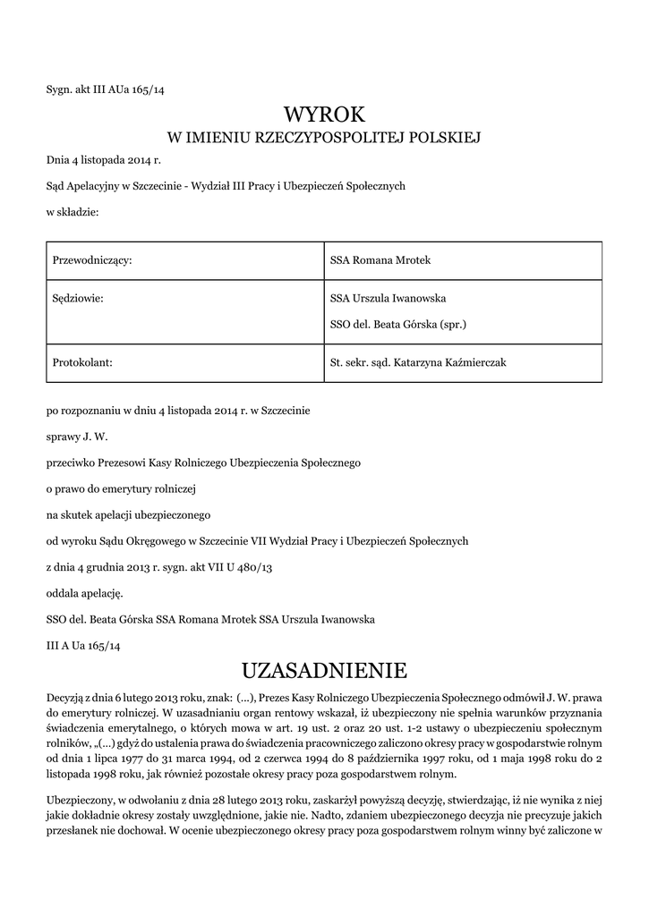 Sygn. akt III AUa 165/14 WYROK W IMIENIU RZECZYPOSPOLITEJ POLSKIEJ Dnia 4 listopada 2014 r. Sąd Apelacyjny w Szczecinie - Wydział III Pracy i Ubezpieczeń Społecznych w składzie: Przewodniczący: SSA Romana Mrotek Sędziowie: SSA Urszula Iwanowska SSO del. Beata Górska (spr.) Protokolant: St. sekr. sąd. Katarzyna Kaźmierczak po rozpoznaniu w dniu 4 listopada 2014 r. w Szczecinie sprawy J. W. przeciwko Prezesowi Kasy Rolniczego Ubezpieczenia Społecznego o prawo do emerytury rolniczej na skutek apelacji ubezpieczonego od wyroku Sądu Okręgowego w Szczecinie VII Wydział Pracy i Ubezpieczeń Społecznych z dnia 4 grudnia 2013 r. sygn. akt VII U 480/13 oddala apelację. SSO del. Beata Górska SSA Romana Mrotek SSA Urszula Iwanowska III A Ua 165/14 UZASADNIENIE Decyzją z dnia 6 lutego 2013 roku, znak: (...), Prezes Kasy Rolniczego Ubezpieczenia Społecznego odmówił J. W. prawa do emerytury rolniczej. W uzasadnianiu organ rentowy wskazał, iż ubezpieczony nie spełnia warunków przyznania świadczenia emerytalnego, o których mowa w art. 19 ust. 2 oraz 20 ust. 1-2 ustawy o ubezpieczeniu społecznym rolników, „(…) gdyż do ustalenia prawa do świadczenia pracowniczego zaliczono okresy pracy w gospodarstwie rolnym od dnia 1 lipca 1977 do 31 marca 1994, od 2 czerwca 1994 do 8 października 1997 roku, od 1 maja 1998 roku do 2 listopada 1998 roku, jak również pozostałe okresy pracy poza gospodarstwem rolnym. Ubezpieczony, w odwołaniu z dnia 28 lutego 2013 roku, zaskarżył powyższą decyzję, stwierdzając, iż nie wynika z niej jakie dokładnie okresy zostały uwzględnione, jakie nie. Nadto, zdaniem ubezpieczonego decyzja nie precyzuje jakich przesłanek nie dochował. W ocenie ubezpieczonego okresy pracy poza gospodarstwem rolnym winny być zaliczone w całości, a niezbędne do ich ustalenia będzie uzyskanie precyzyjnej informacji z ZUS. Okresy uznane w ZUS powinny być zsumowane z okresami zaliczonym przez KRUS. W odpowiedzi na odwołanie organ rentowy wniósł o oddalenie odwołania w całości, podtrzymując argumentację sformułowaną w zaskarżonej decyzji. Organ rentowy wyjaśnił, iż w okresach od dnia 1 lipca 1977 roku do 31 grudnia 1982 roku, od 1 stycznia 1983 roku do dnia 31 grudnia 1990 roku, od 1 stycznia 1991 roku do 31 marca 1994 roku, od dnia 2 czerwca 1994 roku do dnia 30 września 1995 roku, od 1 października 1995 roku do 31 grudnia 1997 roku, od dnia 1 maja 1998 roku do dnia 31 grudnia 1998 roku ubezpieczony podlegał ubezpieczeniu społecznemu rolników. W toku postępowania wyjaśniającego ustalono, iż ubezpieczony zatrudniony był poza rolnictwem w okresach: od 1 marca 1966 roku do 7 lutego 1967 roku, od 5 kwietnia 1968 roku do 18 stycznia 1969 roku, od 1 stycznia 1969 roku do 30 września 1970 roku, od dnia 9 października 1997 roku do 30 kwietnia 1998 roku, od dnia 3 listopada 1998 roku do dnia 31 października 2000 roku, od 15 października 2001 roku do 30 czerwca 2003 roku, od 11 lipca 2008 roku do 6 sierpnia 2011. Organ rentowy wskazał także, iż z informacji uzyskanej z ZUS ustalono, iż przy uwzględnieniu emerytury pracowniczej uwzględniono okresy pracy w gospodarstwie rolnym od dnia 1 lipca 1977 roku do dnia 31 marca 1994 roku, od dnia 2 czerwca 1994 roku do 8 października 1997 roku, od dnia 1 maja 1998 roku do dnia 2 listopada 1998 roku. Przy ustalaniu świadczenia uwzględniono okresy powyższe oraz okresy od 9 października 1997 roku do 30 kwietnia 1998 roku, od 3 listopada 1998 roku do 31 grudnia 1998 roku. W ocenie organu rentowego okresy uwzględnione przy ustalaniu prawa do emerytury pracowniczej oraz okresy pracy zawodowej poza gospodarstwem rolnym nie mogły być zaliczone do okresów niezbędnych do ustalenia prawa do emerytury rolniczej, zgodnie z art. 19 ust. 2 oraz art. 20 ust.1-2 ustawy o ubezpieczeniu społecznym rolników. Sąd Okręgowy ustalił i zważył, co następuje: J. W., urodzony w dniu (...), w okresie od dnia 1 listopada 1993 roku pobierał rentę rolniczą. Wnioskiem złożonym dnia 31 grudnia 1999 roku wystąpił do Zakładu Ubezpieczeń Społecznych o przyznanie prawa do renty z tytułu niezdolności do pracy. Decyzją ZUS z dnia 10 lutego 2000 roku ubezpieczonemu przyznano prawo do renty z tytułu częściowej niezdolności do pracy od dnia 7 grudnia 1999 roku na stałe. Przy ustalaniu uprawnień do świadczenia ustalono łączny staż jego ubezpieczenia w wymiarze 21 lat, 10 miesięcy, 22 dni, zaś uwzględniono 7 lat,. 4 miesiące, 29 dni. Wnioskiem złożonym dnia 4 grudnia 2007 roku ubezpieczony wystąpił do Zakładu Ubezpieczeń Społecznych o przyznanie prawa do emerytury. Decyzją ZUS z dnia 19 grudnia 2007 roku ubezpieczonemu przyznano prawo do emerytury od dnia 1 grudnia 2007 roku. Przy ustalaniu uprawnień do emerytury powszechnej ustalono łączny staż jego ubezpieczenia w wymiarze 31 lat, 8 miesięcy, 9 dni, zaś uwzględniono 30 lat, 11 miesięcy, 18 dni. Wśród okresów uwzględnionych 9 lat, 4 miesiące, 14 dni to okresy składkowe, 11 miesięcy, 25 dni okresy nieskładkowe, 20 lat, 7 miesięcy i 9 dni to okresy uzupełniające. Przy ustalaniu uprawnień do emerytury uwzględniono ubezpieczonemu okresy pracy w gospodarstwie rolnym własnym : od 1 lipca 1977 roku do dnia 31 marca 1994 roku, od 2 czerwca 1994 roku do 8 października 1997 roku, od 1 maja 1998 roku do 2 listopada 1998 roku. Przy ustalaniu wysokości świadczenia uwzględniono obok okresów powyższych okresy; od dnia 9 października 1997 roku do 30 kwietnia 1998 roku, od dnia 3 listopada 1998 roku do 31 grudnia 1998. Poza okresami pracy we własnym gospodarstwie rolnym do stażu ubezpieczenia uwzględniono ubezpieczonemu okresy: od dnia 30 października 1962 roku do 15 października 1964 roku, od 1 marca 1966 roku do 7 grudnia 1967 roku, od dnia 25 kwietnia 1968 roku do dnia 18 stycznia 1969 roku, od dnia 19 stycznia 1969 roku do dnia 30 września 1970 roku, od dnia 9 października 1997 roku do dnia 30 kwietnia 1998 roku