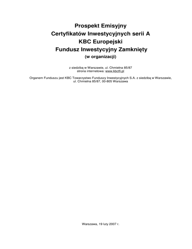 Prospekt Emisyjny Certyfikatów Inwestycyjnych serii A KBC Europejski Fundusz Inwestycyjny Zamkni ty (w organizacji) z siedzib w Warszawie, ul. Chmielna 85/87 strona internetowa: www.kbctfi.pl Organem Funduszu jest KBC Towarzystwo Funduszy Inwestycyjnych S.A. z siedzib w Warszawie, ul. Chmielna 85/87, 00-805 Warszawa Warszawa, 19 luty 2007 r. SPIS TRE CI Rozdział I. PODSUMOWANIE ...........................................................................................................................6 A. TO SAMO PRZEDSTAWICIELI EMITENTA, DORADCÓW I BIEGŁYCH REWIDENTÓW................6 A.1. Zarz d..................................................................................................................................................6 A.2. Inne osoby ...........................................................................................................................................6 A.3 Osoby odpowiedzialne za badanie sprawozda finansowych .............................................................6 A.4. Doradcy................................................................................................................................................6 A.5. Biegli rewidenci ....................................................................................................................................6 B. STATYSTYKI OFERTY I PRZEWIDYWANY HARMONOGRAM ..............................................................7 B.1. Liczba i warto oferowanych Certyfikatów.........................................................................................7 B.2. Harmonogram Oferty ...........................................................................................................................7 C. KLUCZOWE INFORMACJE DOTYCZ CE OFERTY ...............................................................................7 C.1. Wybrane dane finansowe ....................................................................................................................7 C.2. Kapitalizacja i zobowi zania................................................................................................................7 C.3. Cele inwestycyjne Funduszu ...............................................................................................................7 C.4. Czynniki ryzyka....................................................................................................................................7 C.4.1. Czynniki ryzyka zwi zane z działalno ci Funduszu....................................................................7 C.4.2. Czynniki ryzyka zwi zane z otoczeniem, w jakim Fundusz prowadzi działalno . ......................8 D. INFORMACJE DOTYCZ CE TOWARZYSTWA .......................................................................................8 D.1. Historia i rozwój Towarzystwa. ............................................................................................................8 D.2. Ogólny zarys działalno ci ....................................................................................................................8 D.3. Struktura organizacyjna.......................................................................................................................8 E. INFORMACJE DOTYCZ CE EMITENTA..................................................................................................9 E.1. Historia i rozwój Emitenta. ...................................................................................................................9 E.2. Ogólny zarys działalno ci ....................................................................................................................9 E.3. Struktura organizacyjna .......................................................................................................................9 F. WYNIKI PRZEDSI BIORSTWA ORAZ SYTUACJA FINANSOWA...........................................................9 G. INFORMACJE O DYREKTORACH, WY SZYM SZCZEBLU ZARZ DZANIA I PRACOWNIKACH ........9 H. ZNACZ CY UCZESTNICY I TRANSAKCJE Z POWI ZANYMI STRONAMI...........................................9 I. INFORMACJE FINANSOWE.......................................................................................................................9 J. SZCZEGÓŁY OFERTY I DOPUSZCZENIA DO OBROTU ......................................................................10 J.1. Oferta i dopuszczenie do obrotu ........................................................................................................10 J.2. Plan dystrybucji ..................................................................................................................................10 J.3. Sprzedaj cy posiadacze Certyfikatów inwestycyjnych ......................................................................10 J.4. Rozwodnienie .....................................................................................................................................10 J.5. Koszty emisji.......................................................................................................................................10 J.6. Wniosek o dopuszczenie do obrotu. ..................................................................................................11 K. INFORMACJE DODATKOWE .................................................................................................................11 K.1. Aktywa Funduszu...............................................................................................................................11 K.2. Umowa i statut ...................................................................................................................................11 K.3. Dokumenty do wgl du .......................................................................................................................11 Rozdział II. CZYNNIKI RYZYKA ............................................................................................