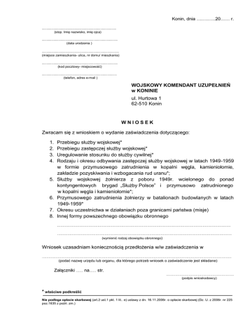 Konin, dnia …………20…… r. ………………………………………………………………….……….……… (stop. Imię nazwisko, imię ojca) ………………………………………………………….………………………… (data urodzenia ) ……………………………………………………………………………………… (miejsce zamieszkania- ulica, nr domu/ mieszkania) …………………………………………………………………………….……… (kod pocztowy- miejscowość) …………………………………………………………………………………… (telefon, adres e-mail ) WOJSKOWY KOMENDANT UZUPEŁNIEŃ w KONINIE ul. Hurtowa 1 62-510 Konin WNIOSEK Zwracam się z wnioskiem o wydanie zaświadczenia dotyczącego: 1. 2. 3. 4. 5. 6. 7. 8. Przebiegu służby wojskowej* Przebiegu zastępczej służby wojskowej* Uregulowanie stosunku do służby cywilnej* Rodzaju i okresu odbywania zastępczej służby wojskowej w latach 1949-1959 w formie przymusowego zatrudnienia w kopalni węgla, kamieniołomie, zakładzie pozyskiwania i wzbogacania rud uranu*; Służby wojskowej żołnierza z poboru 1949r. wcielonego do ponad kontyngentowych brygad „Służby Polsce” i przymusowo zatrudnionego w kopalni węgla i kamieniołomie*; Przymusowego zatrudnienia żołnierzy w batalionach budowlanych w latach 1949-1959* Okresu uczestnictwa w działaniach poza granicami państwa (misje) Innej formy powszechnego obowiązku obronnego .……………………………………………………………………………………………………………………………………… ……………………………………………..………………………………………………………………………………………… (wymienić rodzaj obowiązku obronnego) Wniosek uzasadniam koniecznością przedłożenia w/w zaświadczenia w …………………………………………………………………………………………………………………………………………………… (podać nazwę urzędu lub organu, dla którego potrzeb wniosek o zaświadczenie jest składane) Załączniki …… na…… str. …………………………………………………… (podpis wnioskodawcy) * właściwe podkreślić Nie podlega opłacie skarbowej (art.2 ust.1 pkt. 1 lit.. e) ustawy z dn. 16.11.2006r. o opłacie skarbowej (Dz. U. z 2006r. nr 225 poz.1635 z poźń. zm.)