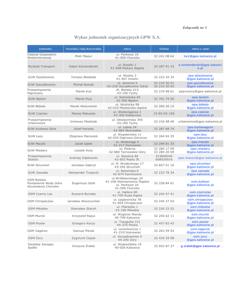 Załącznik nr 1 Wykaz jednostek organizacyjnych GPW S.A. Jednostka Nazwisko i imię Kierownika Adres Telefon Adres e- mail Oddział Gospodarki Wodomierzowej Piotr Mazur ul. Parkowa 10 41-500 Chorzów 32 241 08 64 [email protected] Wydział Transport Adam Komenderski ul. Rozalki 1 41-948 Piekary śląskie 32 287 91 43 [email protected] e.pl ZUW Dziećkowice Tomasz Biedalak ul. Wodna 3 41-407 Imielin 32 222 34 34 zpw.dzieckowice @gpw.katowice.pl ZUW Goczałkowice Michał Nowak 32 210 30 51 32 210 30 83 zpw.goczalkowice @gpw.katowice.pl 32 219 48 61 [email protected] Przepompownia Paprocany Marek Kuś SUW Będzin Marek Psuj SUW Bibiela Marek Wieluniecki SUW Czaniec Przepompownia Urbanowice SUW Kozłowa Góra SUW Łazy Maciej Matusiak Ireneusz Miedziak Józef Horzela Zbigniew Maroszek SUW Maczki Jacek Łętek SUW Miedary Leszek Kuta Przepompownia Staszic Andrzej Ziętkowski SUW Strumień Jarosław Gabryś SUW Zawada Aleksander Trzęsicki OSM Bytków Pompownia Wody Góra Wyzwolenia Chorzów Eugeniusz Idzik OSM Czarny Las Ryszard Burzała OSM Chropaczów Jarosław Woszczyński OSM Mikołów Stanisław Staroń OSM Murcki Krzysztof Rajca OSM Pszów Grzegorz Koczy OSM Zagórze Dariusz Pikuła OSM śory Zygmunt Cepok Siedziba Zarządu Spółki GraŜyna Źrałek ul. Jeziorna 5 43-230 Goczałkowice Zdrój Al. Bielska 213 43-100 Tychy ul. Siemońska 45 42-500 Będzin ul. Woźnicka 99 42-610 Miasteczko śląskie ul. Wodociągowa 1 43-356 Kobiernice ul. Oświęcimska 345 43-100 Tychy ul. Leśna 34 42-584 Wymysłów ul. Wypaleniska 11 42-525 Dąbrowa Górnicza ul. Wodociągi 4 41-217 Sosnowiec ul. Polarna 42-680 Tarnowskie Góry 32 761 74 50 32 285 20 15 33 82-92-150 32 216 48 40 32 287 68 74 32 264 04 35 32 294 81 35 32 284 17 09 32 284 20 69 [email protected] zpw.kozlowagora @gpw.katowice.pl opw.lazy @gpw.katowice.pl zpw.maczki @gpw.katowice.pl opw.miedary @gpw.katowice.pl ul. Staszica 84 42-603 Repty Śl. ul. M. Brodeckiego 17 43-246 Strumień ul. Bytomska 6 42-674 Karchowice ul.Wróblewskiego 34 41-106 Siemianowice Śląskie ul. Parkowa 10 41-500 Chorzów 32 233 78 34 32 228 84 61 osm.bytkow @gpw.katowice.pl ul. Hallera 80 41-709 Ruda śląska 32 244 47 41 osm.czarnylas @gpw.katowice.pl ul. Łagiewnicka 78 41-604 Chropaczów ul. Filaretów 1 43-190 Mikołów ul. Wzgórze Wandy 40-749 Katowice ul. Traugutta 121 44-370 Pszów ul. Lenartowicza 1 41-219 Sosnowiec ul. Szczejkowicka 4 44-240 śory ul. Wojewódzka 19 40-026 Katowice 323840440 608520916 opw.bedzin @gpw.katowice.pl opw.bibiela @gpw.katowice.pl zpw.czaniec @gpw.katowice.pl 33 857 01 10 32 245 27 03 32 226 22 52 32 255 62 11 32 457 83 43 32 263 59 54 32 434 29 98 32 603 87 37 [email protected] opw.strumien @gpw.katowice.pl zpw.zawada @gpw.katowice.pl osm.chropaczow @gpw.katowice.pl osm.mikolow @gpw.katowice.pl osm.murcki @gpw.katowice.pl osm.pszow @gpw.katowice.pl osm.zagorze @gpw.katowice.pl osm.zory @gpw.katowice.pl [email protected]