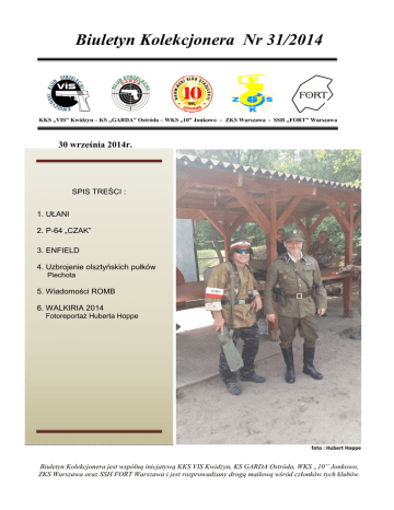 Biuletyn Kolekcjonera Nr 31/2014 KKS „VIS” Kwidzyn – KS „GARDA” Ostróda – WKS „10” Jonkowo – ZKS Warszawa - SSH „FORT” Warszawa 30 września 2014r. SPIS TREŚCI : 1. UŁANI 2. P-64 „CZAK” 3. ENFIELD 4. Uzbrojenie olsztyńskich pułków Piechota 5. Wiadomości ROMB 6. WALKIRIA 2014 Fotoreportaż Huberta Hoppe foto : Hubert Hoppe Biuletyn Kolekcjonera jest wspólną inicjatywą KKS VIS Kwidzyn, KS GARDA Ostróda, WKS „10” Jonkowo, ZKS Warszawa oraz SSH FORT Warszawa i jest rozprowadzany drogą mailową wśród członków tych klubów. 1. UŁANI Ułani, ułani … Na granicy śpią beztroscy To ułani ciechanowscy (Żurawiejka 11 pułku ułanów) Będzie to wspomnienie o dawnych i współczesnych ułanach. Niedługie, bo pamięć ludzka jest krótka i opowieści zazwyczaj giną wraz z ludźmi, którzy je tworzyli. Dlatego warto ocalić od zapomnienia to, co się jeszcze zachowało. Darka Dziedzickiego znają chyba wszyscy członkowie KS Garda. Jego dostojną postać widać na każdych zawodach, kiedy sędziuje na stanowisku z karabinkami .22. Mieszka niedaleko strzelnicy, bo w Idzbarku, tam od roku 1945 do 1983 żył też jego dziadek, żołnierz 11 i 27 (29?) pułku ułanów. Kazimierz Dziedzicki urodził się w 1911 roku i kiedy przyszła pora, został powołany do służby wojskowej w 11 pułku ułanów w Ciechanowie. Był chyba niezłym żołnierzem, bo po szkoleniu podoficerskim został kapralem i dowódcą sekcji rkm. W dalszych latach uczestniczył w ćwiczeniach rezerwy, a w 1939 roku ten rodowity Mazowszanin został skierowany do 29 pułku ułanów do Grodna. Taki wpis figuruje w jego książeczce wojskowej przechowywanej w rodzinie. Jest jednak problem, 29 pułk ułanów nie istniał. Zapewne wypełniający książeczkę w 1947 roku wojskowy pisarz się pomylił. Bo z pewnych dalszych szczegółów wynika, że mogło chodzić o 27 pułk ułanów. Też miał on związek z Ciechanowem, gdzie dzielnie walczył w 1920 roku i nazwę „ciechanowski” nosił do 1936 roku. Pułk ten bił się w 1939 roku właśnie w rejonach, o których opowiadał wnukowi dziadek Kazimierz. Wynikało z tych przekazów, że kapral Dziedzicki walczył w kilku bitwach, a w końcu doszło do potyczki, w której został ranny - jak mówił - gdzieś pod Białymstokiem. Podczas tej walki Polacy mieli zniszczyć 11 niemieckich czołgów. W historii 27 pułku ułanów z Nieświeża zapisano, że 26 września 1939 roku, w bitwie pod Morońcami zniszczono między innymi 11 czołgów wroga. Rejon i liczba się zgadza. Pułk kapitulował dzień później w okolicach Władypola. Kazimierz Dziedzicki był ranny w łydkę i może nikt go początkowo nie opatrzył. W każdym razie w niewoli od razu skierowano go do polowego szpitala w jakieś wsi. Wtedy też odebrano mu prawdopodobnie książeczkę wojskową. W szpitalu niemiecki lekarz powiedział, że jedyną radą na sczerniałą już nogę jest moczyć ją w gorącej wodzie z solą. Jeśli nie pomoże, to trzeba będzie uciąć ją w kolanie. Poprawa nastąpił już po jednym dniu, a po kilku ranny jeniec chodził. Zapytał wtedy lekarza – co ma dalej robić? A ten mu odpowiedział, że nie ma pojęcia. Kapral Dziedzicki uznał tę odpowiedź za aprobatę jego oddalenia się ze szpitala. Tak uczynił, tym bardziej, że straży właściwie nie wystawiano. W wiosce był kościół i uciekinier tam skierował pierwsze kroki. Od księdza dostał starą sutannę i w tym stroju, przez nikogo nie niepokojony, dotarł do rodziny do Warszawy. Podczas okupacji Kazimierz Dziedzicki mieszkał z żoną w jakiejś wsi pod stolicą. Był żołnierzem podziemia, walczył dalej, ale w wyniku donosu został aresztowany i rok trzymano go w więzieniu. Donosiciel nie przeżył. Oboje Dziedzickich wysłano na roboty do Niemiec. Wojnę przeżyli i w 1945 roku zamieszkali w Idzbarku pod Ostródą, gdzie Kazimierz otrzymał gospodarstwo. Krótko był pierwszym sołtysem wioski, uczestniczył w zakładaniu polskiej szkoły, a nawet za odmowę przekształcenia kościoła na magazyn tydzień spędził na posterunku UB. Zmarł w 1983 roku, pochowano go w Ostródzie. Darek Dziedzicki, starszy kapral czołgista, niewiele zapamiętał z opowieści dziadka, a szkoda. Ale tak się złożyło, że gościł w tym roku w Idzbarku innych ułanów. Przez miesiąc przebywali w okolicy na ćwiczeniach rekonstruktorzy odtwarzający 1 pułk ułanów krechowieckich. Szefował im porucznik kawalerii ochotniczej Adam Sujecki. Trafili też do Darka. W rozmowie wyszło, że Dariusz Dziedzicki to wnuk ułana i w dodatku ma jego dokumenty - książeczkę wojskową. Znajomość zaowocowała zaproszeniem państwa Kazimiery i Dariusza Dziedzickich do Kałuszyna, gdzie stanął Złoty Pomnik Ułana 11 pułku. Uroczystość nagłośniono w prasie i telewizji. Kazimierz, dawny ułan, nie mógł już przybyć, zaproszono więc wnuka. Odsłonięcie pomnika zorganizowano w 75 rocznicę bitwy w Kałuszynie. Wtedy, nocą 11 września 1939 roku 4 szwadron 11 pułku ułanów, dowodzony przez rotmistrza Andrzeja Żylińskiego zdobył miasteczko atakując w szyku konnym. Pomnik ufundował syn Andrzeja Żylińskiego, Jan na stałe mieszkający w Anglii. Uroczystość była wspaniała, władze Kałuszyna postarały się, żeby wypadła jak najokazalej. Nie zawiedli organizatorzy i współcześni ułani. Publiczność mogła podziwiać konie, mundury, wyposażenie, uzbrojenie. Wszystko na najwyższym regulaminowym poziomie. Byli też żołnierze z września 1939 roku. Jeden z nich powiedział Darkowi Dziedzickiemu – „Myśmy tak wspaniałego oporządzenia nie mieli. Tu jest wszystko jak spod igły. A u nas i siodła były stare i czasem mundury nie najnowsze”. Ale skąd rekonstruktorzy mają brać oryginały? Nawet w muzeach mało ich zostało. Odsłonięcie pomnika było najważniejsze, ale widzowie czekali na pokaz szarży. I się nie zawiedli. Przegalopowało 85 jeźdźców w mundurach ró