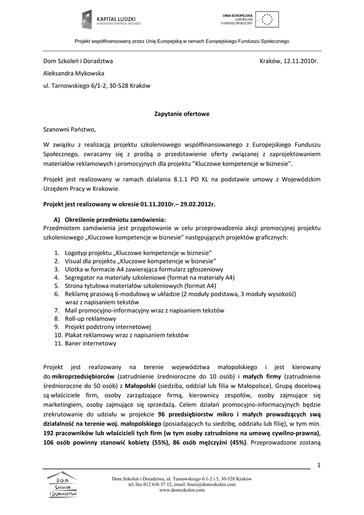 Projekt współfinansowany przez Unię Europejską w ramach Europejskiego Funduszu Społecznego Dom Szkoleń i Doradztwa Kraków, 12.11.2010r. Aleksandra Mykowska ul. Tarnowskiego 6/1-2, 30-528 Kraków Zapytanie ofertowe Szanowni Państwo, W związku z realizacją projektu szkoleniowego współfinansowanego z Europejskiego Funduszu Społecznego, zwracamy się z prośbą o przedstawienie oferty związanej z zaprojektowaniem materiałów reklamowych i promocyjnych dla projektu ”Kluczowe kompetencje w biznesie”. Projekt jest realizowany w ramach działania 8.1.1 PO KL na podstawie umowy z Wojewódzkim Urzędem Pracy w Krakowie. Projekt jest realizowany w okresie 01.11.2010r.– 29.02.2012r. A) Określenie przedmiotu zamówienia: Przedmiotem zamówienia jest przygotowanie w celu przeprowadzenia akcji promocyjnej projektu szkoleniowego „Kluczowe kompetencje w biznesie” następujących projektów graficznych: 1. 2. 3. 4. 5. 6. 7. 8. 9. 10. 11. Logotyp projektu „Kluczowe kompetencje w biznesie” Visual dla projektu „Kluczowe kompetencje w biznesie” Ulotka w formacie A4 zawierająca formularz zgłoszeniowy Segregator na materiały szkoleniowe (format na materiały A4) Strona tytułowa materiałów szkoleniowych (format A4) Reklamę prasową 6-modułową w układzie (2 moduły podstawa, 3 moduły wysokość) wraz z napisaniem tekstów Mail promocyjno-informacyjny wraz z napisaniem tekstów Roll-up reklamowy Projekt podstrony internetowej Plakat reklamowy wraz z napisaniem tekstów Baner internetowy Projekt jest realizowany na terenie województwa małopolskiego i jest kierowany do mikroprzedsiębiorców (zatrudnienie średnioroczne do 10 osób) i małych firmy (zatrudnienie średnioroczne do 50 osób) z Małopolski (siedziba, oddział lub filia w Małopolsce). Grupą docelową są właściciele firm, osoby zarządzające firmą, kierownicy zespołów, osoby zajmujące się marketingiem, osoby zajmujące się sprzedażą. Celem działań promocyjno-informacyjnych będzie zrekrutowanie do udziału w projekcie 96 przedsiębiorstw mikro i małych prowadzących swą działalność na terenie woj. małopolskiego (posiadających tu siedzibę, oddziału lub filię), w tym min. 192 pracowników lub właścicieli tych firm (w tym osoby zatrudnione na umowę cywilno-prawna), 106 osób powinny stanowić kobiety (55%), 86 osób mężczyźni (45%). Przeprowadzone zostaną 1 Dom Szkoleń i Doradztwa, ul. Tarnowskiego 6/1-2 i 5, 30-528 Kraków tel./fax 012 656 57 12, email: [email protected] www.domszkolen.com Projekt współfinansowany przez Unię Europejską w ramach Europejskiego Funduszu Społecznego wyłącznie szkolenia otwarte. Akcja promocyjna powinna mieć jak największe oddziaływanie na grupę docelową projektu. Uczestnik może brać udział w 1 (4 dni) lub max w 2 modułach (8 dni). Szkolenia będą miały charakter krótkich, intensywnych cykli szkoleniowych z najważniejszych „kluczowych” kompetencji biznesowych: 1. Moduł „Kluczowe kompetencje menedżerskie” – 4 dni, program: Zarządzanie strategiczne przedsiębiorstwem Rozwój efektywności osobistej 2. Moduł „Kluczowe kompetencje lidera zespołu” – 4 dni, program: Motywowanie i rozwój pracowników Delegowanie i wyznaczanie zadań Kontrola i ocena pracy 3. Moduł „Skuteczna sprzedaż” – 4 dni, program: Rozmowa handlowa Negocjacje 4. Moduł „Marketing” – 4 dni, program: Marketing strategiczny Marketing operacyjny Współczesne trendy w marketingu i e-marketingu Rekrutacja będzie się odbywać przed każdym zaplanowanym modułem. Harmonogram przewiduje rozpoczęcie poszczególnych modułów w terminach: koniec stycznia 2011, czerwiec i lipiec 2011. Zamówienie może być realizowane w formie: 1. Przekazania plików graficznych W ramach usługi do obowiązków wykonawcy będzie należało: 1. zaprojektowania następujących form reklamy Logotyp projektu „Kluczowe kompetencje w biznesie” Visual dla projektu „Kluczowe kompetencje w biznesie” Ulotka w formacie A4 zawierająca formularz zgłoszeniowy Segregator na materiały szkoleniowe (format na materiały A4) Strona tytułowa materiałów szkoleniowych (format A4) Reklamę prasową 6-modułową w układzie (2 moduły podstawa, 3 moduły wysokość) wraz z napisaniem tekstów Mail promocyjno-informacyjny wraz z napisaniem tekstów Roll-up reklamowy Projekt podstrony internetowej Plakat reklamowy Baner internetowy 2 Dom Szkoleń i Doradztwa, ul. Tarnowskiego 6/1-2 i 5, 30-528 Kraków tel./fax 012 656 57 12, email: [email protected] www.domszkolen.com Projekt współfinansowany przez Unię Europejską w ramach Europejskiego Funduszu Społecznego 2. przyjmowanie i rozpatrywanie wszelkich zgłaszanych przez Zamawiającego uwag Wybór Podmiotu zostanie dokonany poprzez ocenę oferty cenowej i jakości projektów. Przedmiotem zamówienia jest dostarczenie poniżej wymienionych towarów przez okres realizacji projektu zgodnie z bieżącymi zamówieniami. B) Zamawiający Dom Szkoleń i Doradztwa Aleksandra Mykowska, ul. Tarnowskiego 6/1-2, 30-528 Kraków C) Termin wykonania zamówienia: Zamawiający będzie realizował zamówienie w częściach, w zależności od potrzeb, poprzez zlecenia jednostkowe, w których podana będzie treść i forma ogłoszenia oraz termin emisji. D) Wykonawcy: Na niniejsze zapytanie mogą odpowiadać firmy i osoby zajmujące się projektowaniem reklamy. E) Kryteria oceny ofert: Wybór oferty najkorzystniejszej zostanie dokonany w oparciu o kryterium: - estetyki i jakości projektów oraz adekwatności reklamy do nośnika reklamy i grupy docelowej - ceny, Kryterium ceny jest określane na podstawie ceny za określoną formę reklamy. Zamawiający zastrzega sobie prawo do wyboru jednego Podmiotu odnośnie każdego z zamówień. Oferta powinna zawierać: Odpowiedź na zapytanie na odpowiednim formularzu stanowiącym Załącznik nr 1 do niniejszego Zapytania ofertowego wraz z podaniem ceny brutto za poszczególne projekty oraz pro