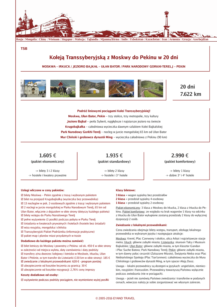 Rosja | Mongolia | Chiny | Wietnam | Singapur | Malezja | Tajlandia | Mjanma/Birma | Indie | Uzbekistan | Kazachstan | Iran | Armenia | Gruzja | Azerbejdżan TSB Koleją Transsyberyjską z Moskwy do Pekinu w 20 dni MOSKWA – IRKUCK / JEZIORO BAJKAŁ – UŁAN BATOR / PARK NARODOWY GORKHI-TERELJ – PEKIN 20 dni 7.622 km Podróż liniowymi pociągami Kolei Transsyberyjskiej! Moskwa, Ułan Bator, Pekin – trzy stolice, trzy metropolie, trzy kultury Jezioro Bajkał – perła Syberii, najgłębsze i najstarsze jezioro na świecie Krugobajkałka – całodniowa wycieczka dawnym szlakiem Kolei Bajkalskiej Park Narodowy Gorkhi-Terelj – nocleg w jurcie mongolskiej 65 km od Ułan Bator Mur Chiński i grobowce dynastii Ming – wycieczka całodniowa z Pekinu (90 km) 1.605 € 1.935 € 2.990 € (pakiet ekonomiczny) (pakiet standardowy) (pakiet komfortowy) -> bilety 3 i 2 klasy -> bilety 2 klasy -> bilety 1 klasy -> hostele i kwatery prywatne -> hostele i 3* hotele -> dobre 3* i 4* hotele Usługi wliczone w ceny pakietów: Klasy biletowe: ☑ bilety Moskwa – Pekin zgodnie z trasą i wybranym pakietem ☑ bilet na przejazd Krugobajkałką (wycieczka bez przewodnika) 3 klasa = wagon sypialny bez przedziałów 2 klasa = przedział sypialny 4-osobowy 1 klasa = przedział sypialny 2-osobowy ☑ 13 noclegów w pok. 2-osobowych zgodnie z trasą i wybranym pakietem ☑ 2 noclegi w jurcie mongolskiej w Parku Narodowym Terelj, 65 km od Ułan Bator, włącznie z dojazdem w obie strony (dotyczy każdego pakietu) ☑ bilety wstępu do Parku Narodowego Terelj ☑ pełne wyżywienie (3 posiłki) podczas pobytu w Parku Terelj ☑ śniadania w kwaterach prywatnych i hotelach (hostele bez śniadań) ☑ wiza rosyjska, mongolska i chińska ☑ Transsyberyjski Pakiet Podróżnika (informacje praktyczne) ☑ pakiet map i planów miast przydatnych w trasie Dodatkowo do każdego pakietu można zamówić: ☑ bilet lotniczy do Moskwy i powrotny z Pekinu: od ok. 450 € w obie strony w zależności od miejsca wylotu, daty zamówienia i daty podróży ☑ transfery z/na dworzec kolejowy i lotnisko w Moskwie, Irkucku, Ułan Bator i Pekinie, w tym transfer do Listwianki (130 km w obie strony): 185 € ☑ zwiedzanie z lokalnymi przewodnikami: 620 € - program poniżej ☑ ubezpieczenie od kosztów leczenia za granicą: 30 € ☑ ubezpieczenie od kosztów rezygnacji: 2,76% ceny imprezy Pakiet ekonomiczny: 3 klasa z Moskwy do Irkucka, 2 klasa z Irkucka do Pekinu. Pakiet komfortowy: ze względu na brak wagonów 1 klasy na odcinku z Irkucka do Ułan Bator wykupione zostaną przedziały 2 klasy do wyłącznej dyspozycji 2 osób. Zwiedzanie z lokalnymi przewodnikami: Cena zwiedzania obejmuje bilety wstępu, transport, obsługę lokalnego przewodnika w wybranym języku i następujące atrakcje: Moskwa: Kreml, Plac Czerwony i okolice, ulica Arbat i najciekawsze stacje metra; Irkuck: główne zabytki miasta; Listwianka: skansen Talcy i Muzeum Bajkalskie; Ułan Bator: główne zabytki miasta, w tym klasztor Gandan i Plac Suche Batora; Park Narodowy Terelj; Pekin: główne zabytki miasta, w tym dawny pałac cesarski (Zakazane Miasto), Świątynia Nieba oraz Plac Niebiańskiego Spokoju (Plac Tian'anmen); całodniowa wycieczka do Muru Chińskiego i grobowców dynastii Ming, w tym spacer Aleją Dusz. Uwaga – lokalni przewodnicy są dostępni w językach: angielskim, niemieckim, rosyjskim i francuskim. Przewodnicy towarzyszą Państwu wyłącznie podczas zwiedzania (nie w pociągach). Koszty dodatkowe od osoby: ☑ wyżywienie podczas podróży pociągiem, nie wymienione wyżej posiłki Uwaga – jeżeli nie zamówią Państwo zwiedzania i transferów w podanych cenach, wówczas należy je sobie zorganizować we własnym zakresie. © 2005-2016 EYAND TRAVEL Rosja | Mongolia | Chiny | Wietnam | Singapur | Malezja | Tajlandia | Mjanma/Birma | Indie | Uzbekistan | Kazachstan | Iran | Armenia | Gruzja | Azerbejdżan Opracowaliśmy dla Państwa bardzo ciekawą i urozmaiconą trasę, dodając jednocześnie w każdym miejscu po jednym dodatkowym dniu do własnej dyspozycji, co pozwoli na spokojniejszą podróż, a zarazem możliwość zobaczenia więcej. Czeka Państwa blisko 3-tygodniowa podróż, w tym przejazd liniowymi pociągami Kolei Transsyberyjskiej. Oznacza to 7.622 km ciekawej trasy prowadzącej przez Syberię, wysokogórskie krajobrazy Uralu, liczne syberyjskie metropolie i wioski. Następnie trasa prowadzi przez piękną i ciekawą rosyjską Republikę Buriacji i niemalże niezaludnione mongolskie stepy. W pociągu będzie okazja do zawarcia nowych ciekawych znajomości, zapoznania się z inną kulturą i zrobienia pięknych zdjęć. Na peronach stacji pośrednich będą Państwo mieli okazję spróbowania świeżych regionalnych przysmaków. Podczas podróży przewidziane są postoje w wybranych ciekawych miejscowościach na trasie: Irkucku i Ułan Bator oraz pobyt na łonie natury – nad Jeziorem Bajkał w miejscowości Listwianka i w mongolskim Parku Narodowym Terelj połączony z noclegiem w tradycyjnej jurcie mongolskiej. W Listwiance będzie możliwość skosztowania bajkalskiego specjału – wędzonej ryby omul i skorzystania z tradycyjnej sauny rosyjskiej – banji. Przebieg trasy Ułan Bator, Park Narodowy Gorkhi-Terelj Moskwa Czw (12) Rano przyjazd do Ułan Bator. Zwiedzanie Ułan Bator i transfer do Parku Narodowego Gorkhi-Terelj, 65 km (dojazd w obie strony w wypadku wszystkich pakietów zapewniony). Obiad, zwiedzanie parku, kolacja i nocleg w jurcie mongolskiej. Nie (1) Przyjazd do Moskwy, nocleg. Pon (2) Zwiedzanie Kremla, Placu Czerwonego i okolic oraz słynnej historycznej ulicy Arbat znanej z piosenek Bułata Okudżawy, przy której zamieszkiwał także Aleksander Puszkin. Wycieczka do najciekawszych stacji metra, podczas której zobaczą Państwo wybrane najciekawsze stacje i przekonają się dlaczego określane są one mianem podziemnych pałaców. Pt (13) Pobyt w Parku Terelj. Możliwość jazdy konnej,