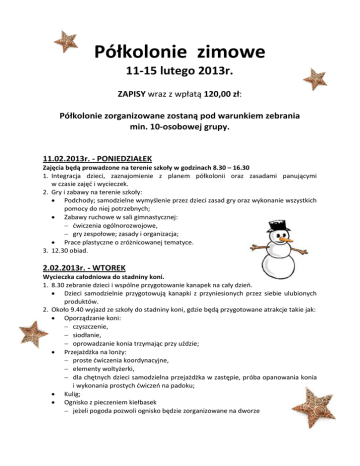 Półkolonie zimowe 11-15 lutego 2013r. ZAPISY wraz z wpłatą 120,00 zł: Półkolonie zorganizowane zostaną pod warunkiem zebrania min. 10-osobowej grupy. 11.02.2013r. - PONIEDZIAŁEK Zajęcia będą prowadzone na terenie szkoły w godzinach 8.30 – 16.30 1. Integracja dzieci, zaznajomienie z planem półkolonii oraz zasadami panującymi w czasie zajęć i wycieczek. 2. Gry i zabawy na terenie szkoły: Podchody; samodzielne wymyślenie przez dzieci zasad gry oraz wykonanie wszystkich pomocy do niej potrzebnych; Zabawy ruchowe w sali gimnastycznej: ćwiczenia ogólnorozwojowe, gry zespołowe; zasady i organizacja; Prace plastyczne o zróżnicowanej tematyce. 3. 12.30 obiad. 2.02.2013r. - WTOREK Wycieczka całodniowa do stadniny koni. 1. 8.30 zebranie dzieci i wspólne przygotowanie kanapek na cały dzień. Dzieci samodzielnie przygotowują kanapki z przyniesionych przez siebie ulubionych produktów. 2. Około 9.40 wyjazd ze szkoły do stadniny koni, gdzie będą przygotowane atrakcje takie jak: Oporządzanie koni: czyszczenie, siodłanie, oprowadzanie konia trzymając przy uździe; Przejażdżka na lonży: proste ćwiczenia koordynacyjne, elementy woltyżerki, dla chętnych dzieci samodzielna przejażdżka w zastępie, próba opanowania konia i wykonania prostych ćwiczeń na padoku; Kulig; Ognisko z pieczeniem kiełbasek jeżeli pogoda pozwoli ognisko będzie zorganizowane na dworze jeżeli będzie za zimno to pieczenie kiełbasek odbędzie się w domku przy kominku, będzie to też czas na gry i zabawy stolikowe oraz opowiadanie różnych bajek, legend i historii. 3. Około godziny 16.00 powrót do szkoły. Na wyjazd dzieci powinny być ubrane ciepło i warstwowo, żeby w miarę potrzeby mogły się rozebrać, powinny mieć również zapakowane rzeczy na zmianę w razie przemoczenia się ubrań. 13.02.2013 ŚRODA Wyjście na ściankę wspinaczkową do FABRYKI MOCY 1. 8.30 zebranie dzieci i wspólne zebranie się do wyjścia do FABRYKI MOCY. 2. 9.15 wyjście ze szkoły. 3. 10.00 - 12.30 zabawa na ściance wspinaczkowej: zaznajomienie się z zasadami panującymi na obiekcie, nauka poprawnego zakładania uprzęży, nauka zasad wspinaczki, wspinaczka z dolną asekuracją wykwalifikowanego instruktora oraz na wydzielonej ścianie bulderowej. Standardowy ubiór to odzież sportowa (hale są ogrzewane): spodnie, koszulka T-shirt, sportowe obuwie (najlepiej lekko przyciasne żeby stopa była stabilna - adidasy to nie najlepszy wybór). 4. 13.00 powrót busem do szkoły. 5. 13.30 obiad 6. Od 14.00 do 16.30 swobodna zabawa w świetlicy szkolnej: gry i zabawy stolikowe, zabawy w salach ruchowej i kulek, prace plastyczne. 14.02.2013 CZWARTEK Poznajemy Gliwice 1. 8.30 zebranie dzieci i wspólne przygotowanie kanapek na cały dzień Dzieci samodzielnie przygotowują kanapki z przyniesionych przez siebie ulubionych produktów 2. Około 9.40 wyjście ze szkoły na wycieczkę „Szlakiem zabytków w Gliwicach”: Radiostacja - zarys historyczny, Park Chopina i Palmiarnia, Plac Józefa Piłsudskiego, Stare Miasto: Willa Caro, Rynek z Ratuszem i fontanną z Neptunem, Zameczek Piastowski, pozostałości po murach obronnych, Muzeum Odlewnictwa przy ulicy Bojkowskiej. 3. Około 15.30 powrót do szkoły; obiad. 15.02.2013 PIĄTEK Zajęcia będą prowadzone na terenie szkoły o 8.30 do 16.30 1. Zabawy i zajęcia na terenie szkoły: Prace plastyczne o zróżnicowanej tematyce z wykorzystaniem różnych technik i materiałów. Zabawy ruchowe na salce gimnastycznej. 2. Kreatywne oglądanie filmu: Seans filmowy z atrakcjami, przekąskami i napojami. 3. 12.30 OBIAD. Przewidujemy odstępstwa od planu w razie pięknej zimowej i śnieżnej pogody, takie jak: 1. W dniu 15.02.2013R. w godzinach między 10.00 a 14.00 wyjście z dziećmi do parku Chorzowskiego na „7 górek”, gdzie dzieci będą mogły korzystać z uroków zimy i zabaw na śniegu: zjazdy z górek na sankach i wszystkich przewidzianych do tego celu przedmiotach, budowanie fortecy ze śniegu i bitwa na śnieżki, lepienie bałwana, itp. ZAPRASZAMY